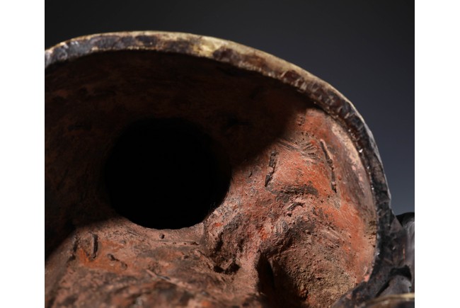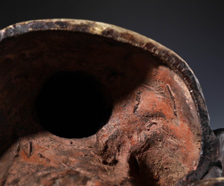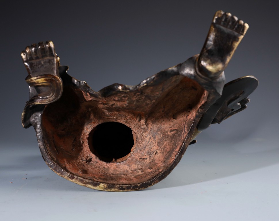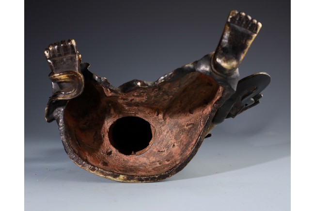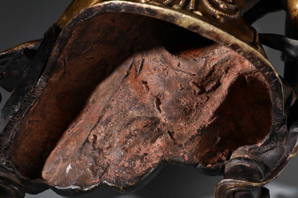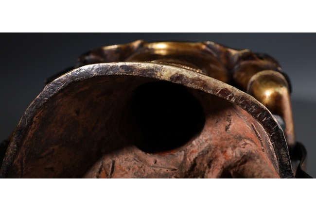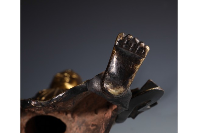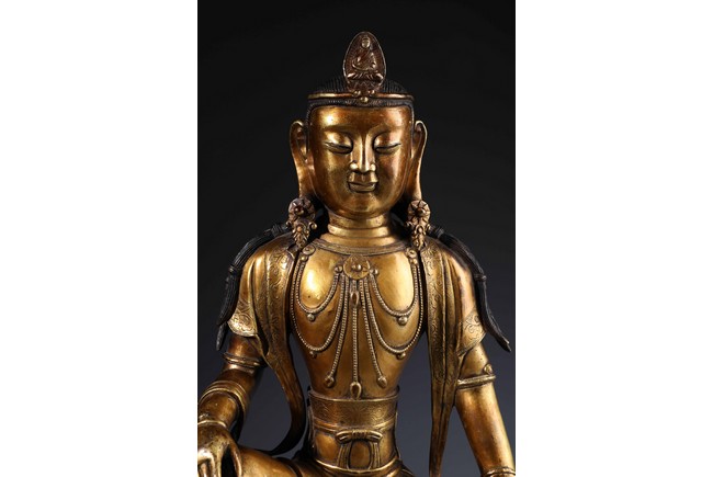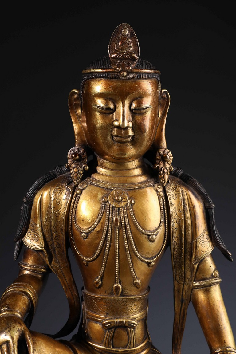 ⾃在觀⾳,被認為是觀世⾳菩薩三⼗三種化身之⼀,代表著⾯容俊美、姿態典雅的觀⾳形象。也是明清時期世間崇奉的常⻅造像題材。此尊觀⾳呈現舒坐的⾃在妙相,左臂⾃然平放,右⼿⾃然搭於右膝,姿態優美,閑情逸致。⾯相⽅圓端正,眉⽬細⻓,神態安詳。束发披肩,⽿垂圓珰,其下飾有花瓣墜,寬肩束腰,體態勻稱,造型優美,⼿腳刻劃寫實。上身袒露,胸前飾連珠式瓔珞,下身著⻓裙。裙褶⾃然流暢,⽣動⾃如,整體造型完美,形象⽣動。