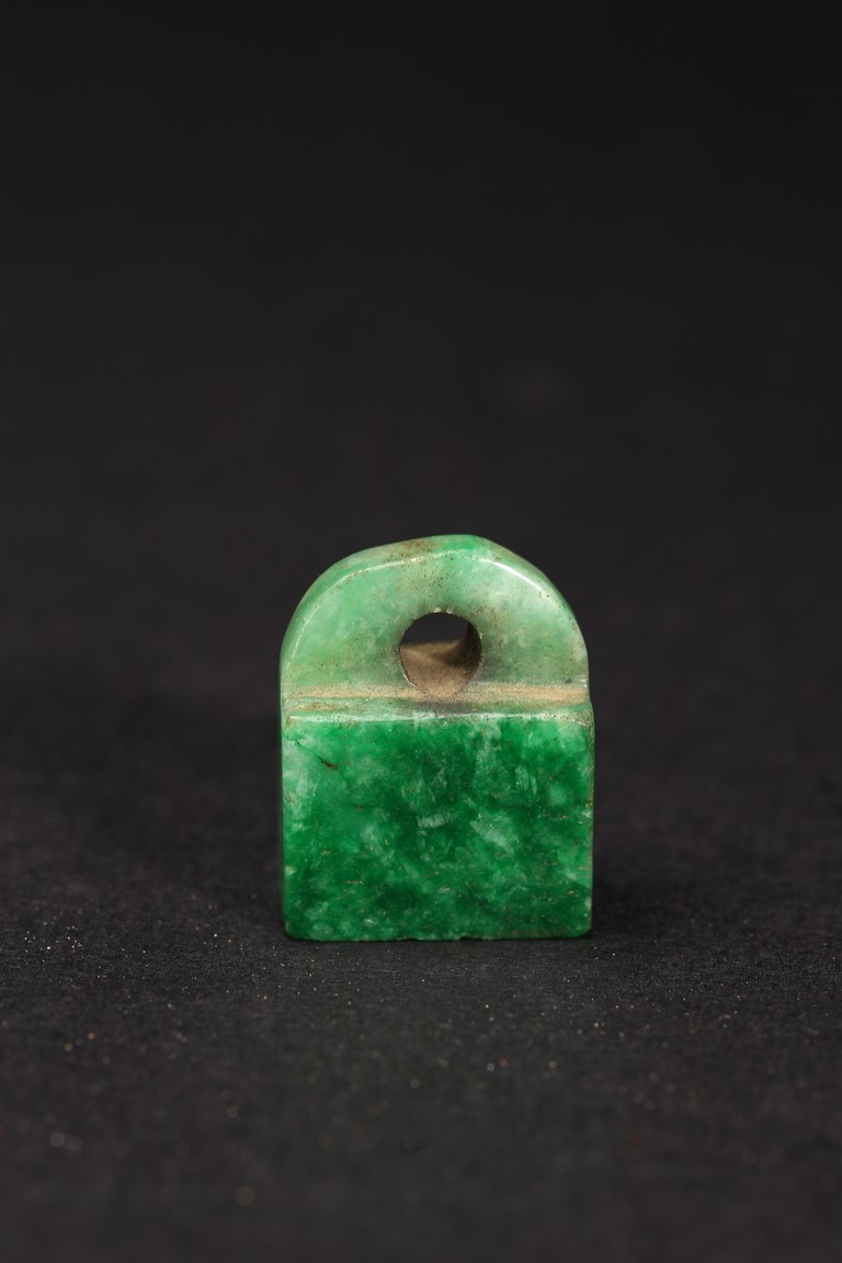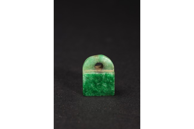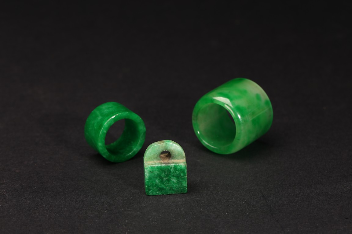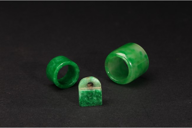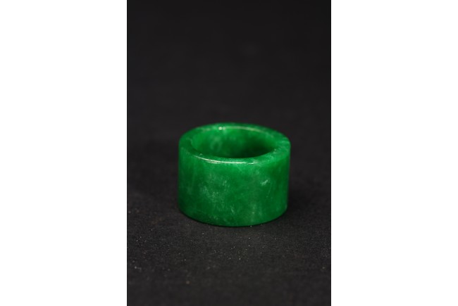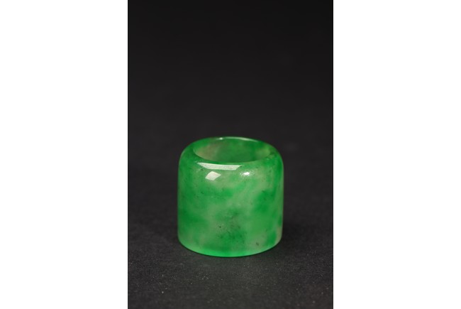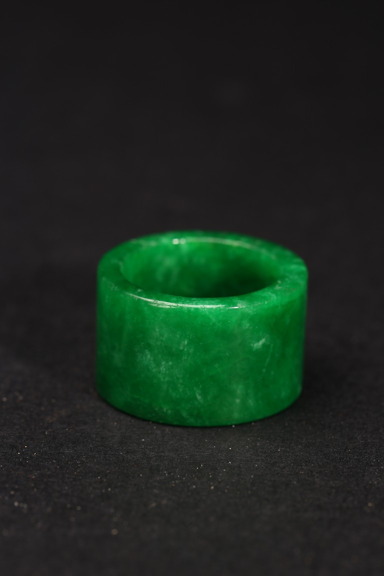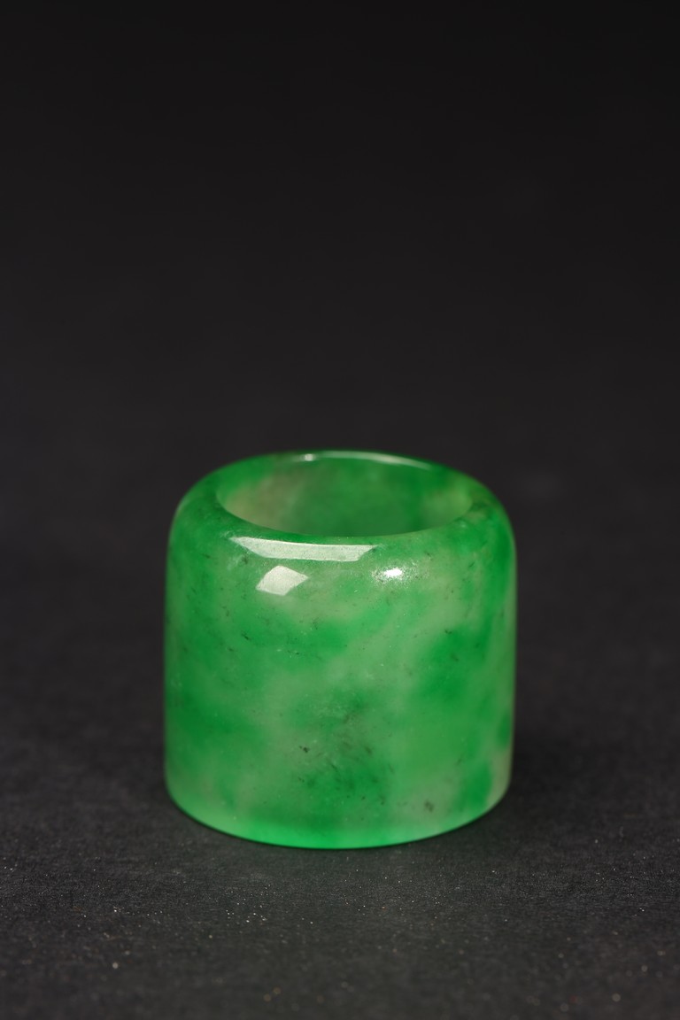 扳指又稱韘,為騎射之具,後太平盛世逐漸以玉石、金銀等貴重材料制作,象征權勢地位,其中翡翠質地者十分珍貴。翡翠扳指鮮嫩滿綠而清澈如水,通體拋光素潔無紋。翠色潔凈,質地瑩潤細膩,光澤圓潤,是翠中佳品。印章其色似碧、白兩色暈墨,觀之青翠可愛。印文清晰自然,上有紅色印泥。