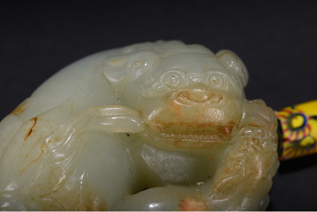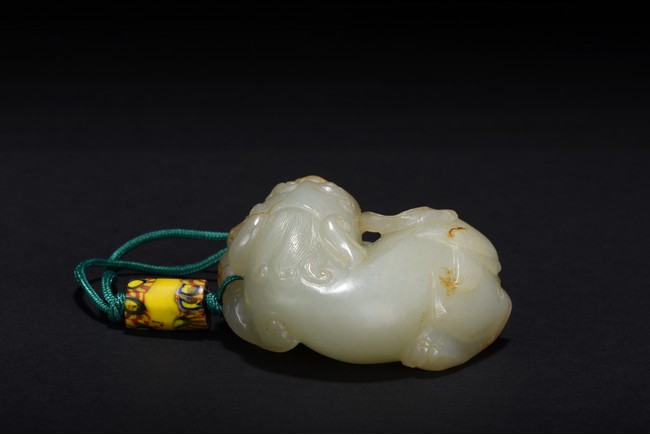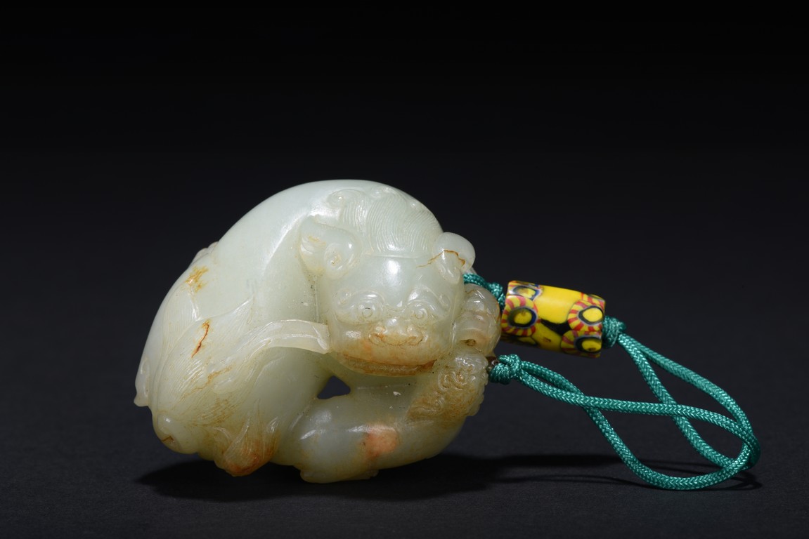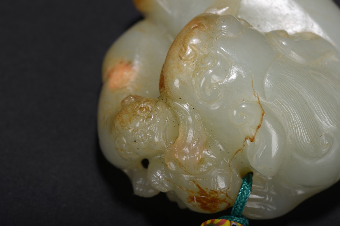 Qing Dynasty period. The recumbent mythical beast is carved with its head turned to one side, grasping a flowering leafy branch, seated beside a smaller qilin, the stone is of greenish white tone with russet flecks and inclusions.