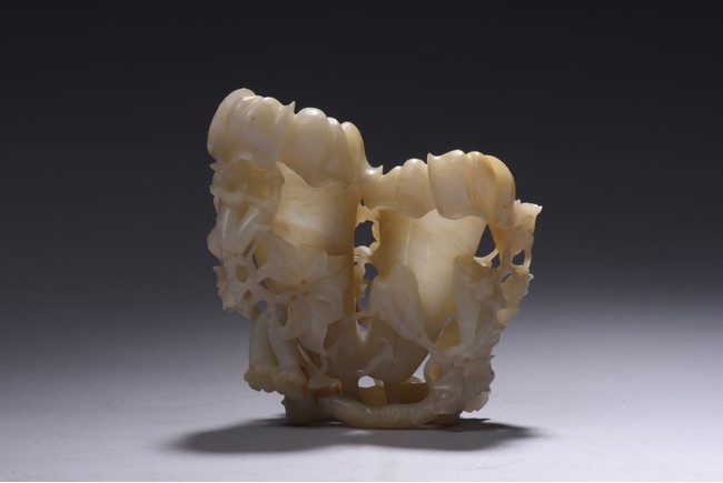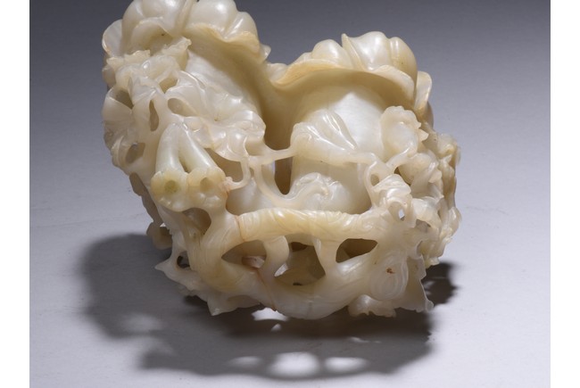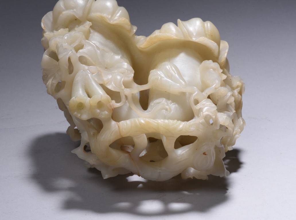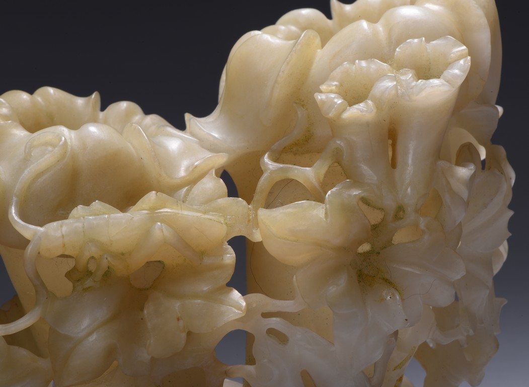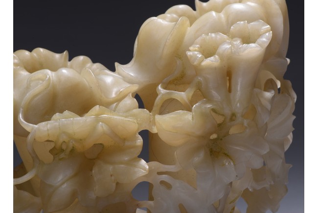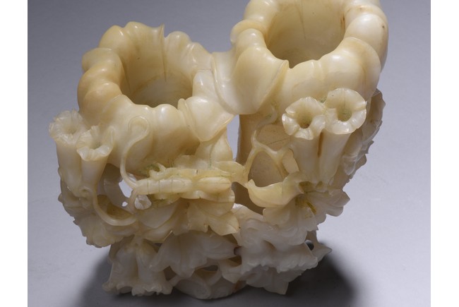 Realistically carved with two morning glory in yellowish white jade, around the petals intertwined with numerous smaller flower buds with curling vine.