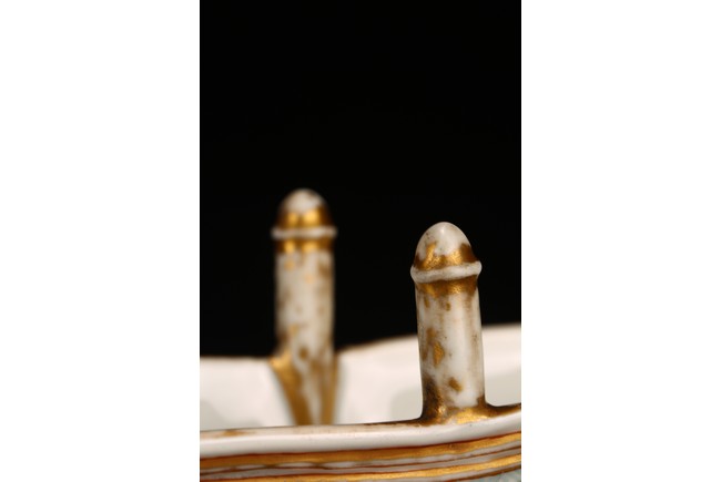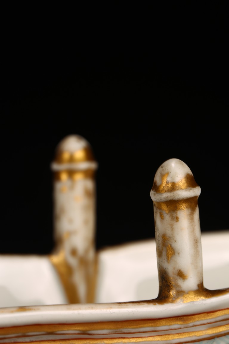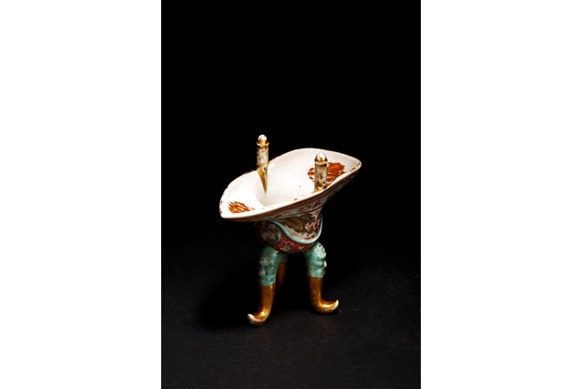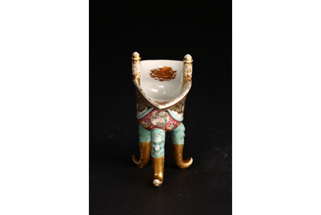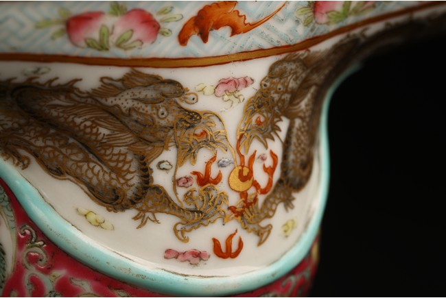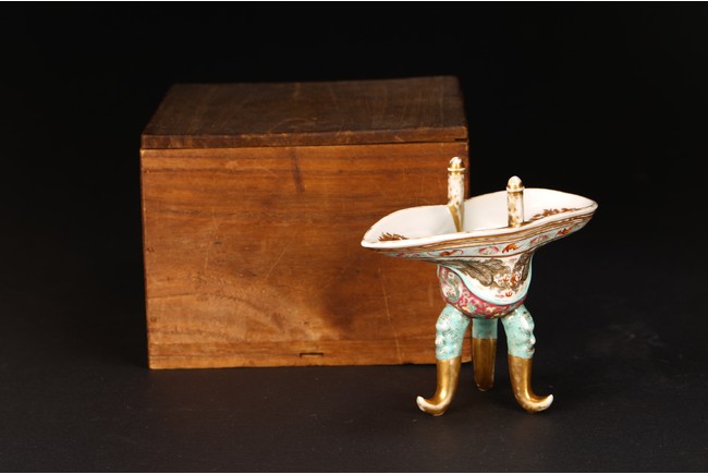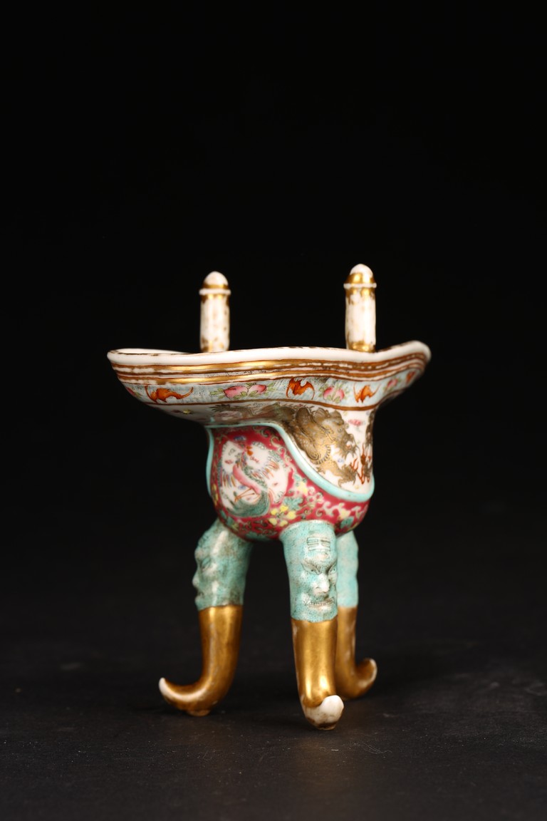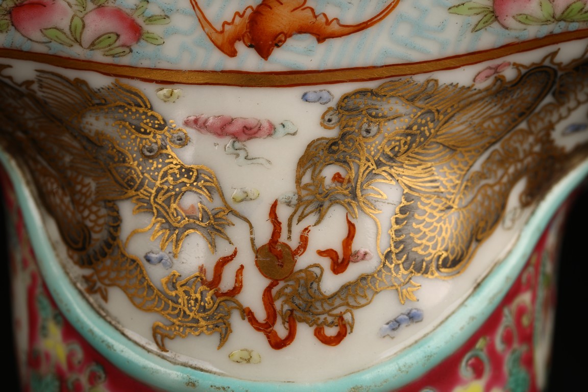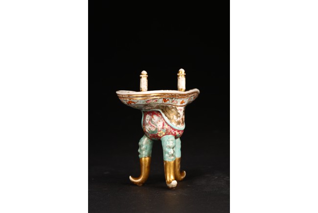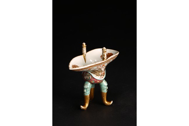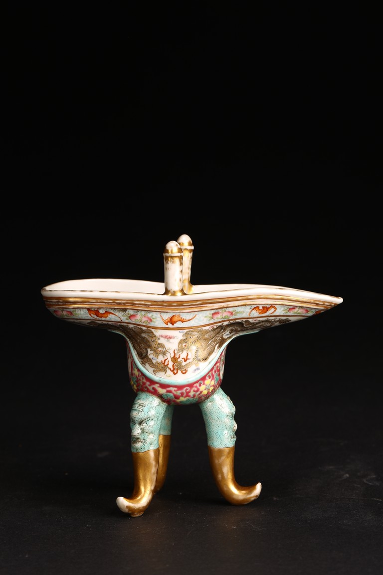 本品形制仿商周青銅爵,別緻古雅,爵口沿流至尾呈弧形,線條優美,敞口深腹,左右兩柱,下承三高撇足,爵身用粉彩繪“蝠壽紋”“雙龍戲珠紋”“纏枝花卉紋”,彩料妍美淡雅。足上以天藍釉為地繪“獸面紋”,其色淡雅恬靜,其質瑩潤光滑。柱子,口沿,足上撇部分描金,部分脫落。整體造型古樸,玲瓏精緻,極具典雅美感,繪畫細緻清晰,釉質瑩潤光滑。以古之造型,添新之紋飾,其品格之高猶可珍也。 “大清咸豐年制”款識。 (配木盒)