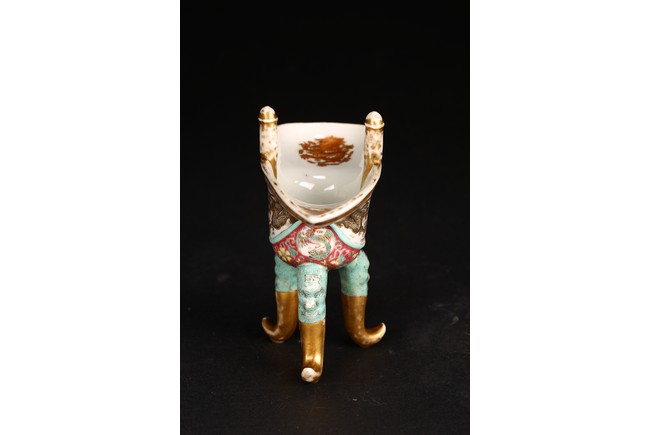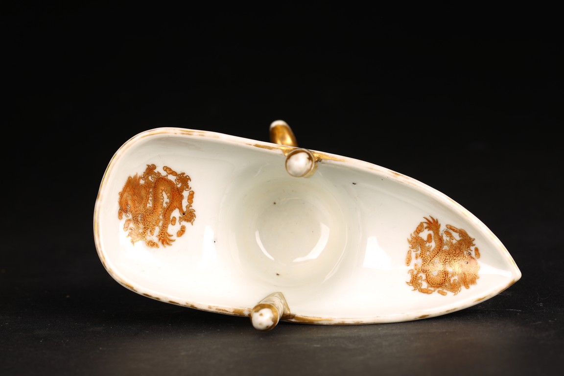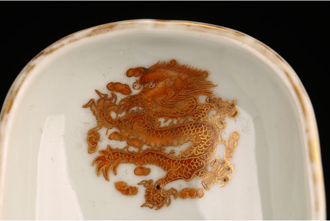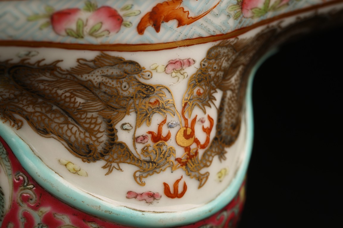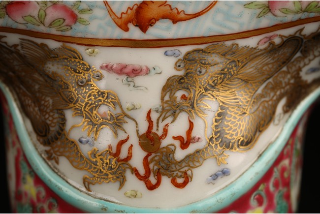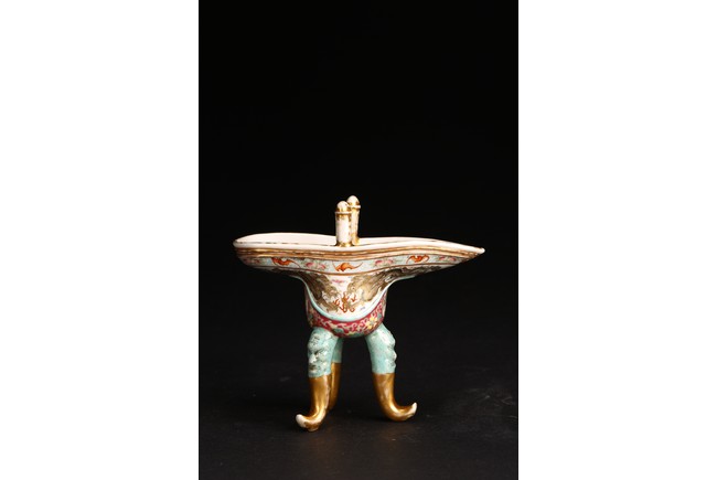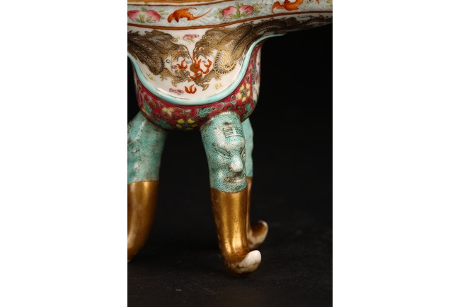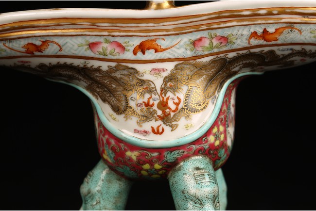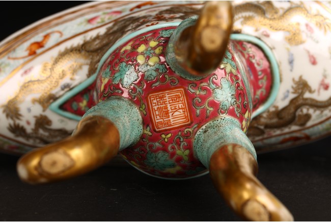 Qing Dynasty period. The U-shaped body raised on three splayed triangular feet, flaring at the rim, one side with a broad rounded extension, the other with a channeled spout tapering to a point, set with two short posts with rounded finials, the exterior enamelled with pair of confronting dragons chasing flaming pearl below band of auspicious bats and peaches, and above decorations of floral scrolls reserved on red ground, the underside inscribed with six character Xianfeng mark.