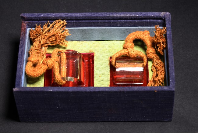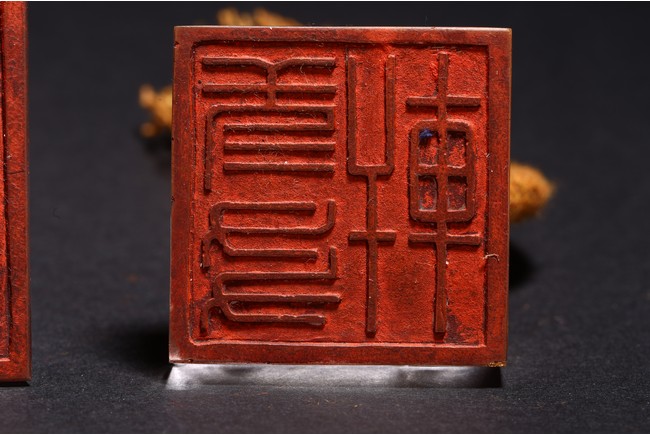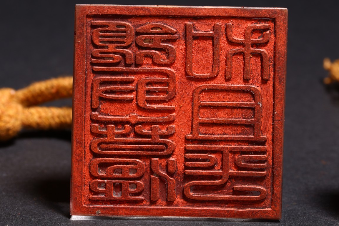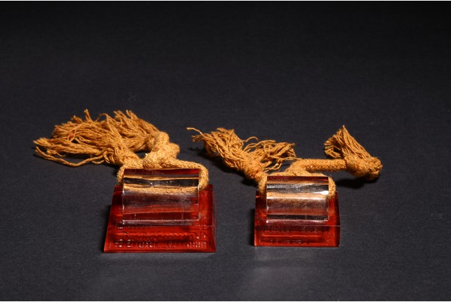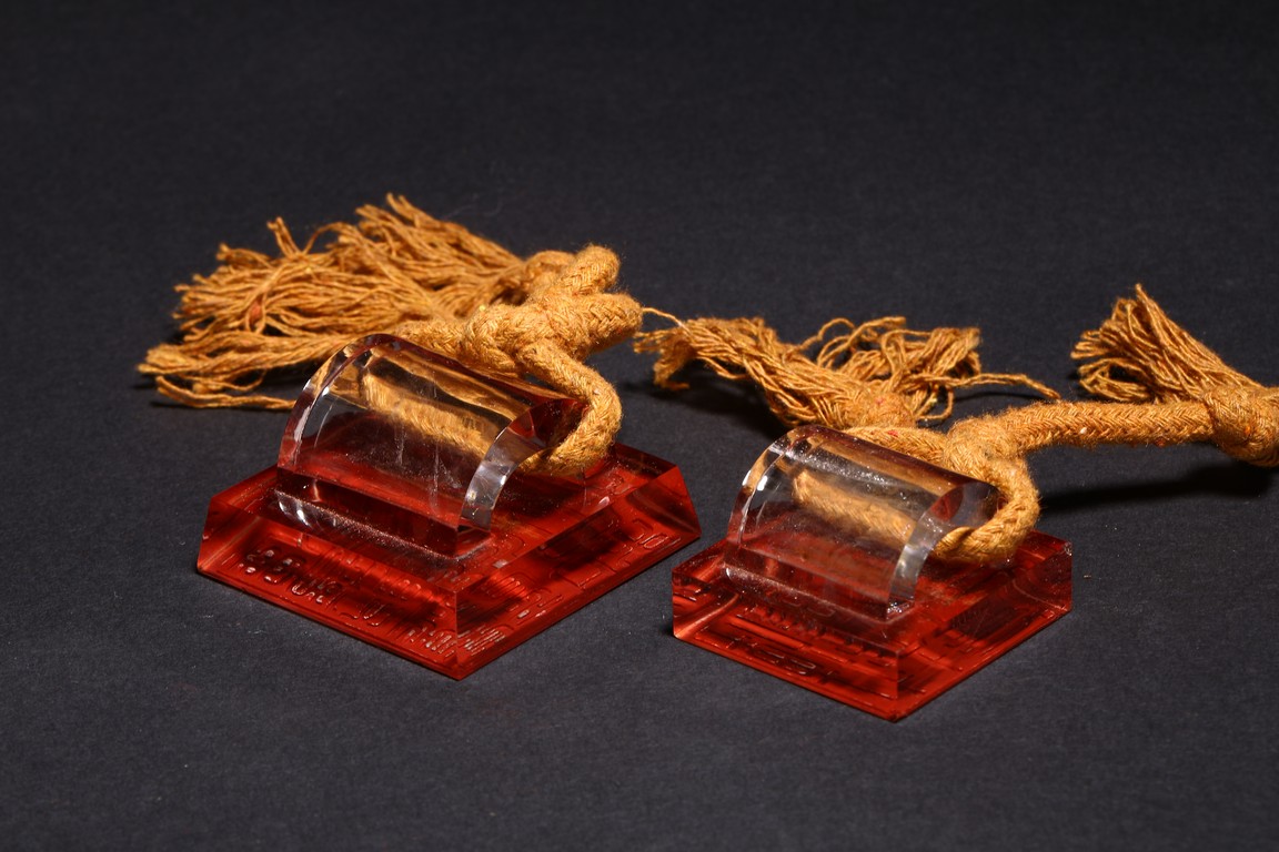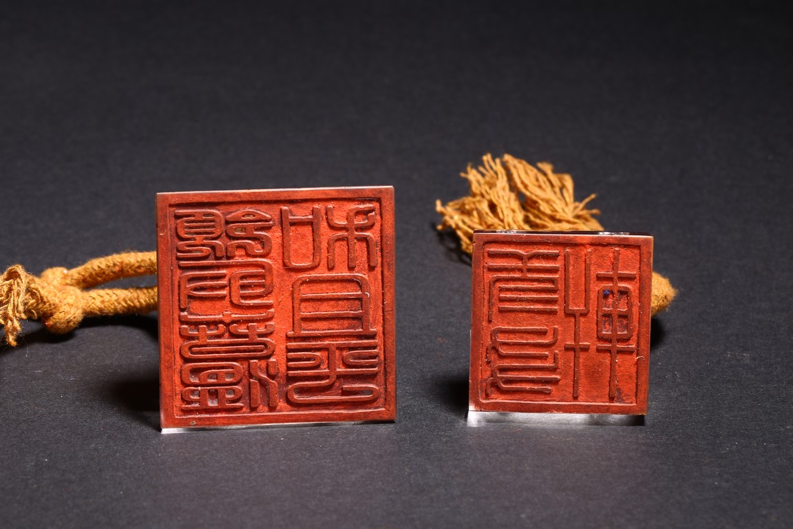 Each of square section, topped with an arched finial tied with yellow silk cord, seal face carved with inscriptions.