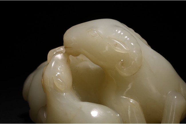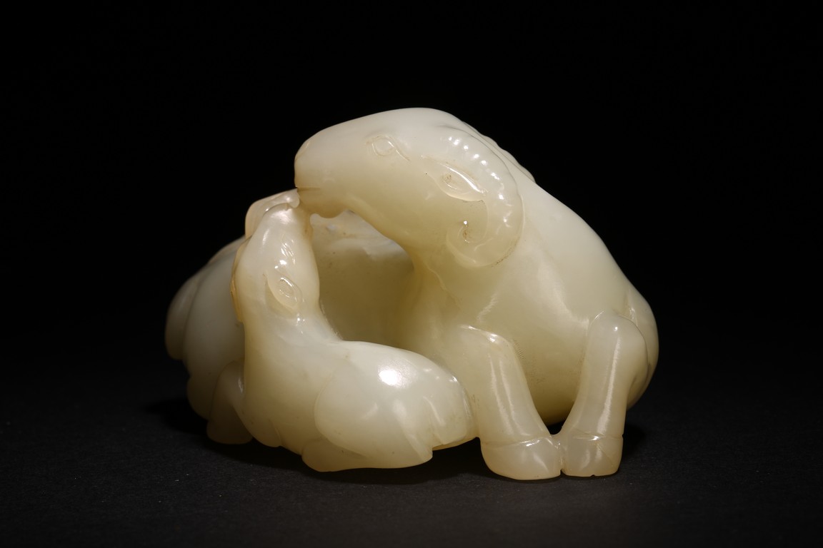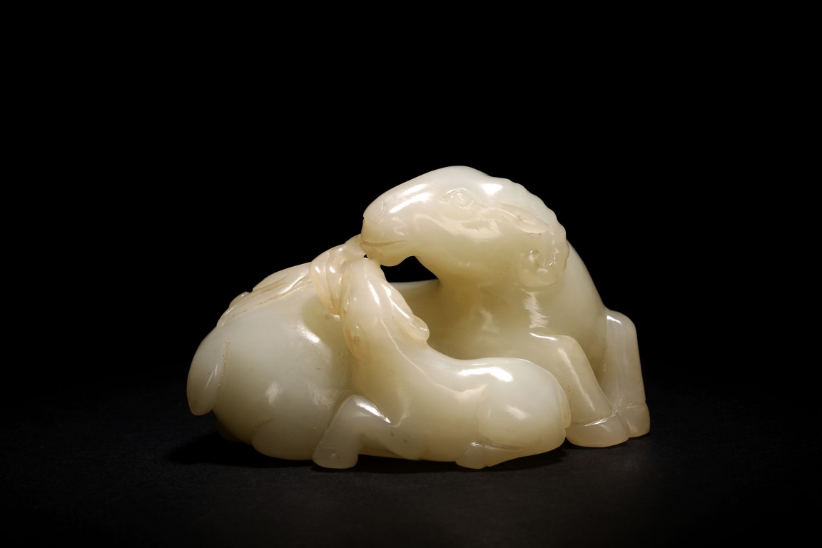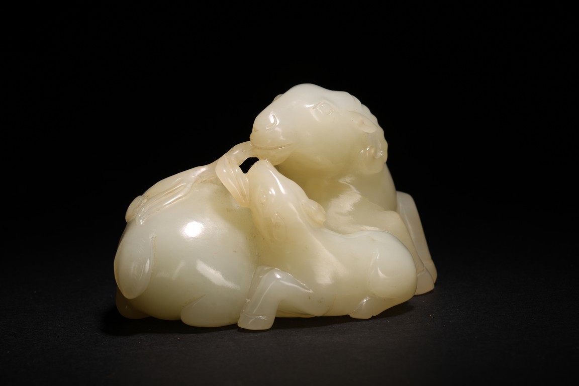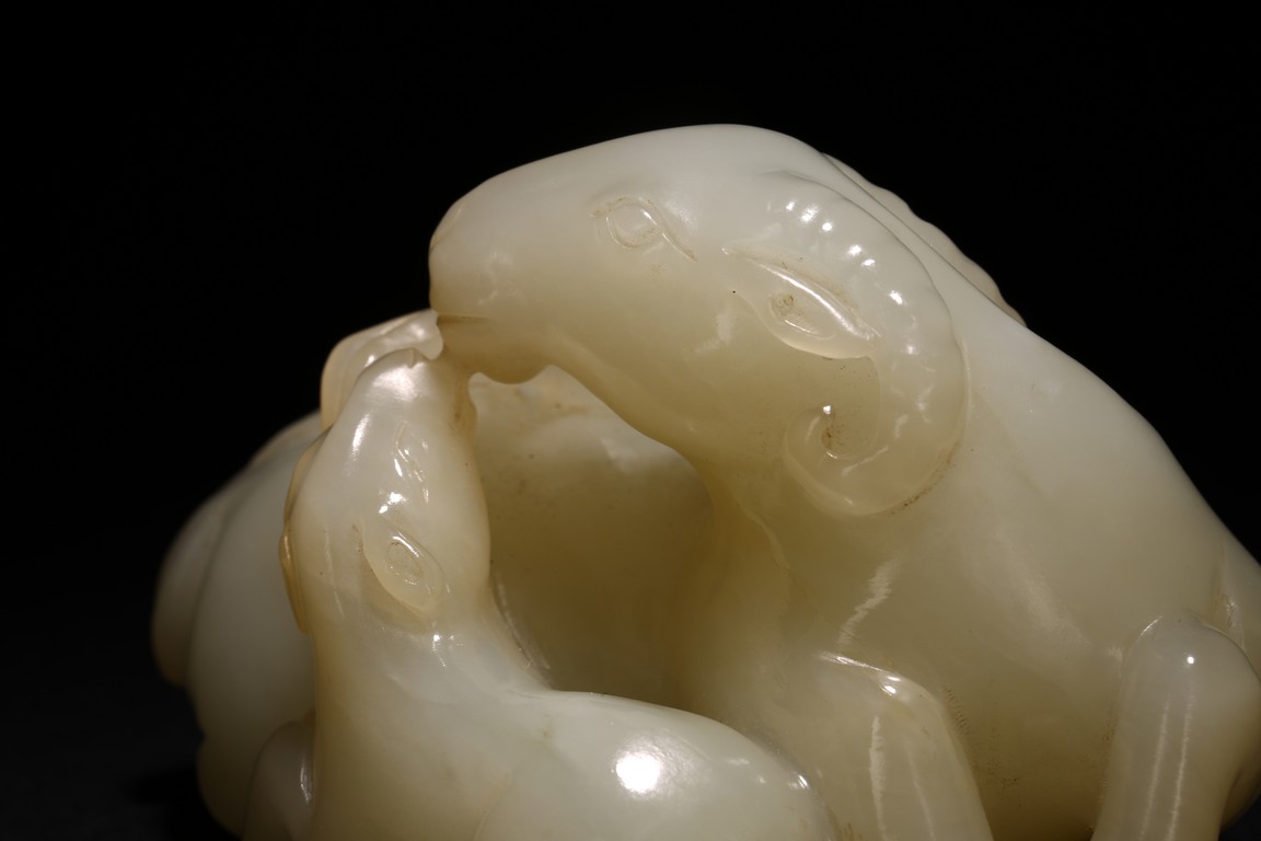 Qing Dynasty period. Carved as a large ram recumbent with its young nestled to the front, both grasping a lingzhi branch in mouths, the jade of an even white color.