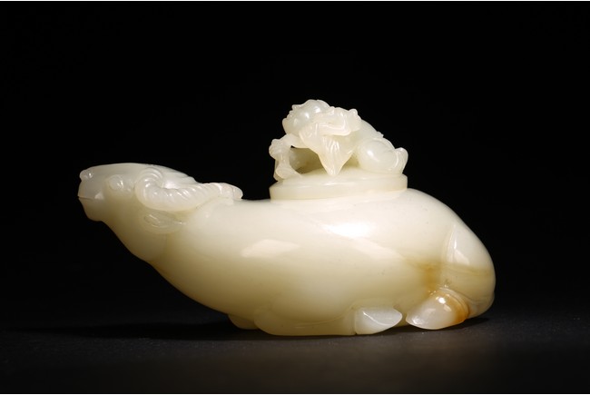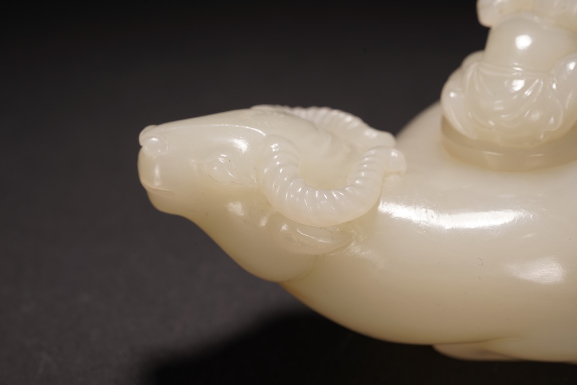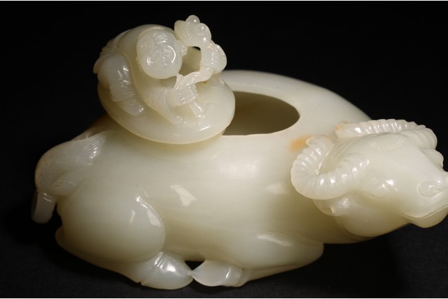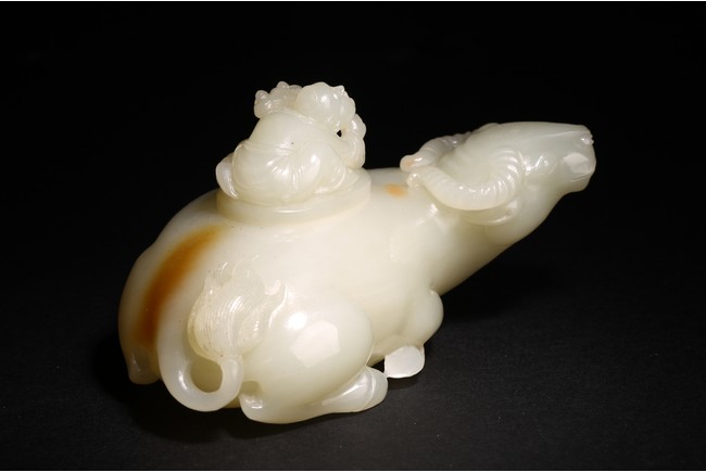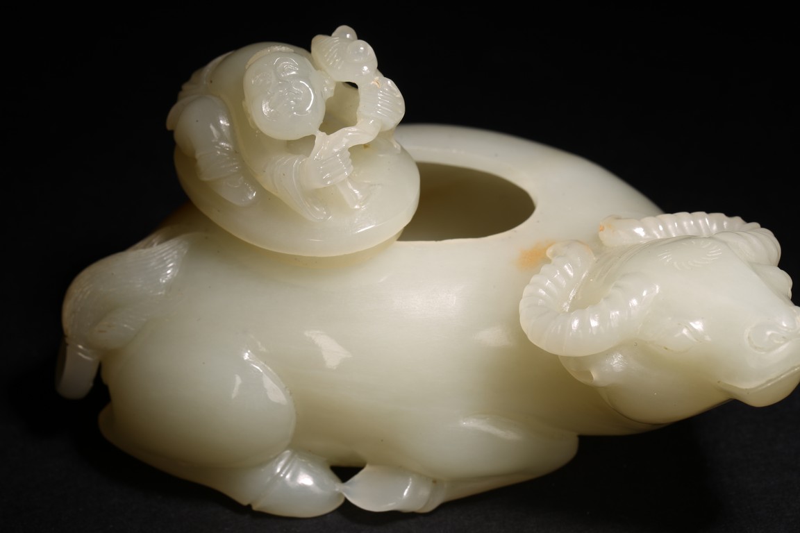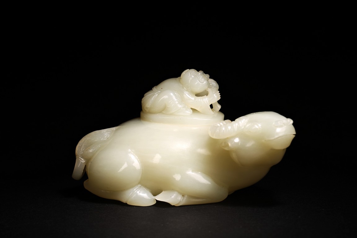 此水盂選用和田白玉為材,採用圓雕、浮雕工藝,雕琢一瑞牛,長角後盤,伸頭仰望,四肢俯臥,背上開槽,內部中空,鈕巧雕童子仰天狀,在牛背上一副幽然自得的景象。玉質細膩溫潤,表面略帶皮色,增加了許多韻味,值得收藏。