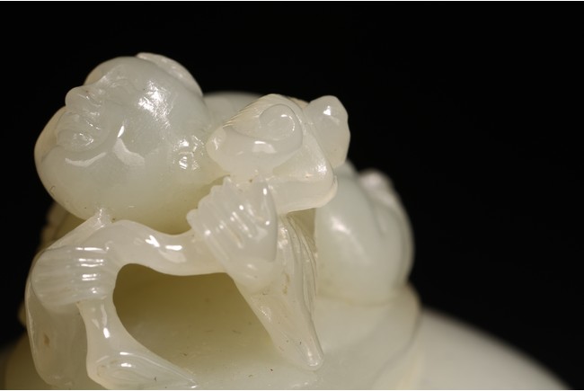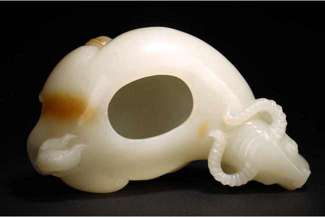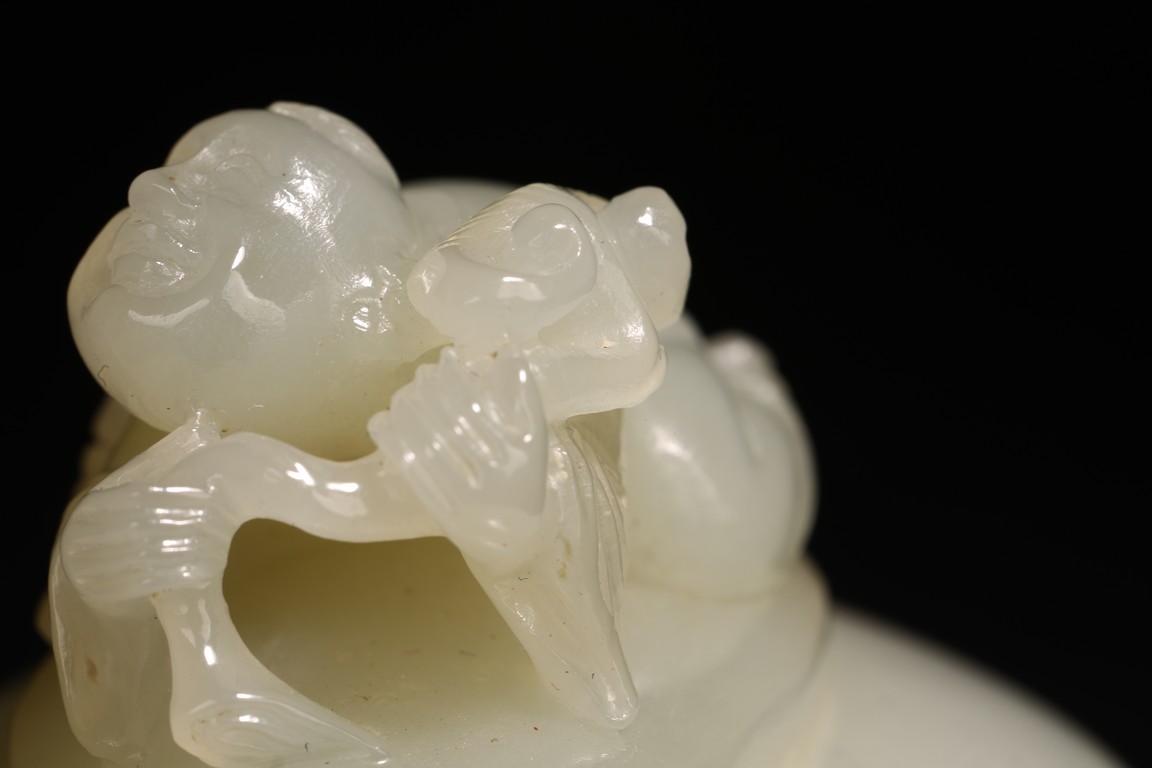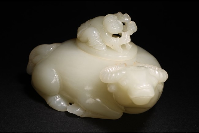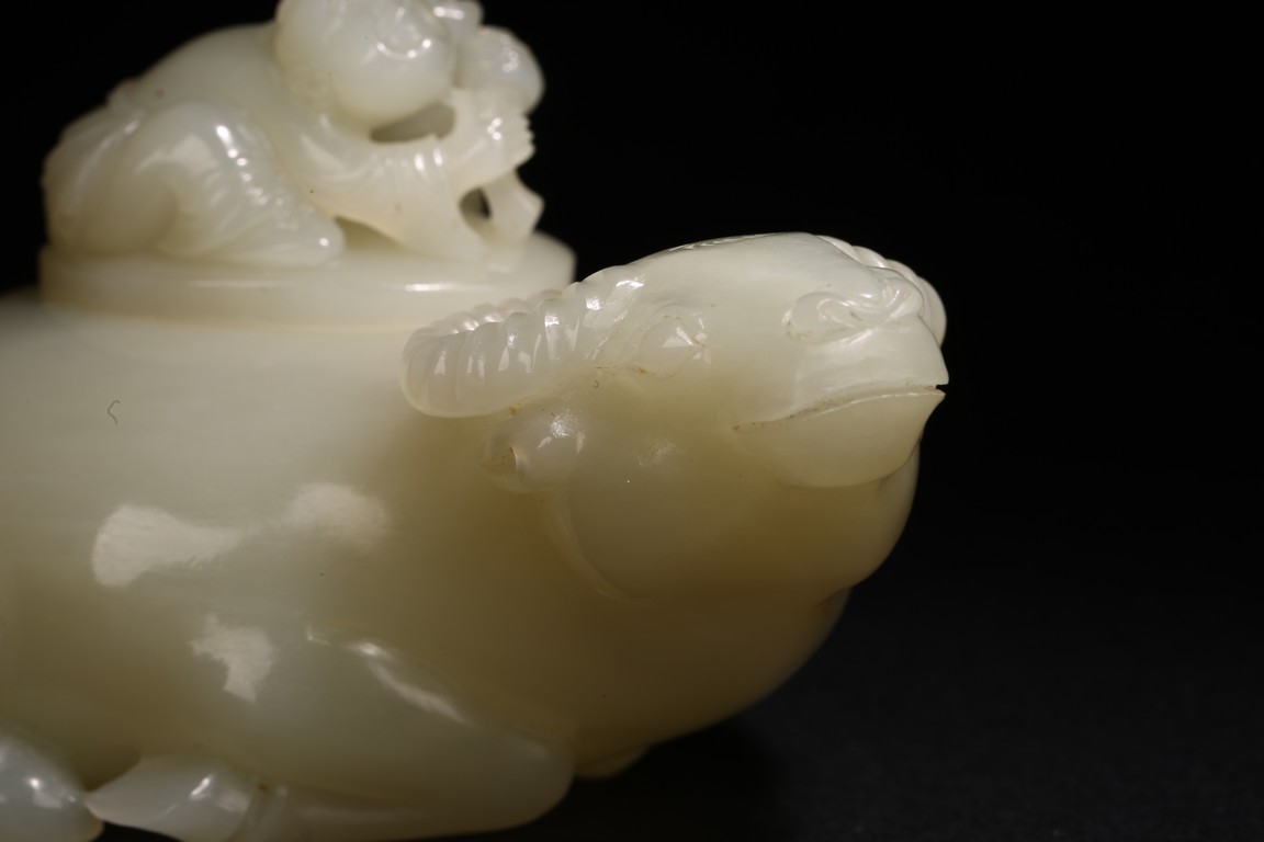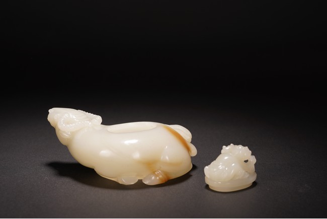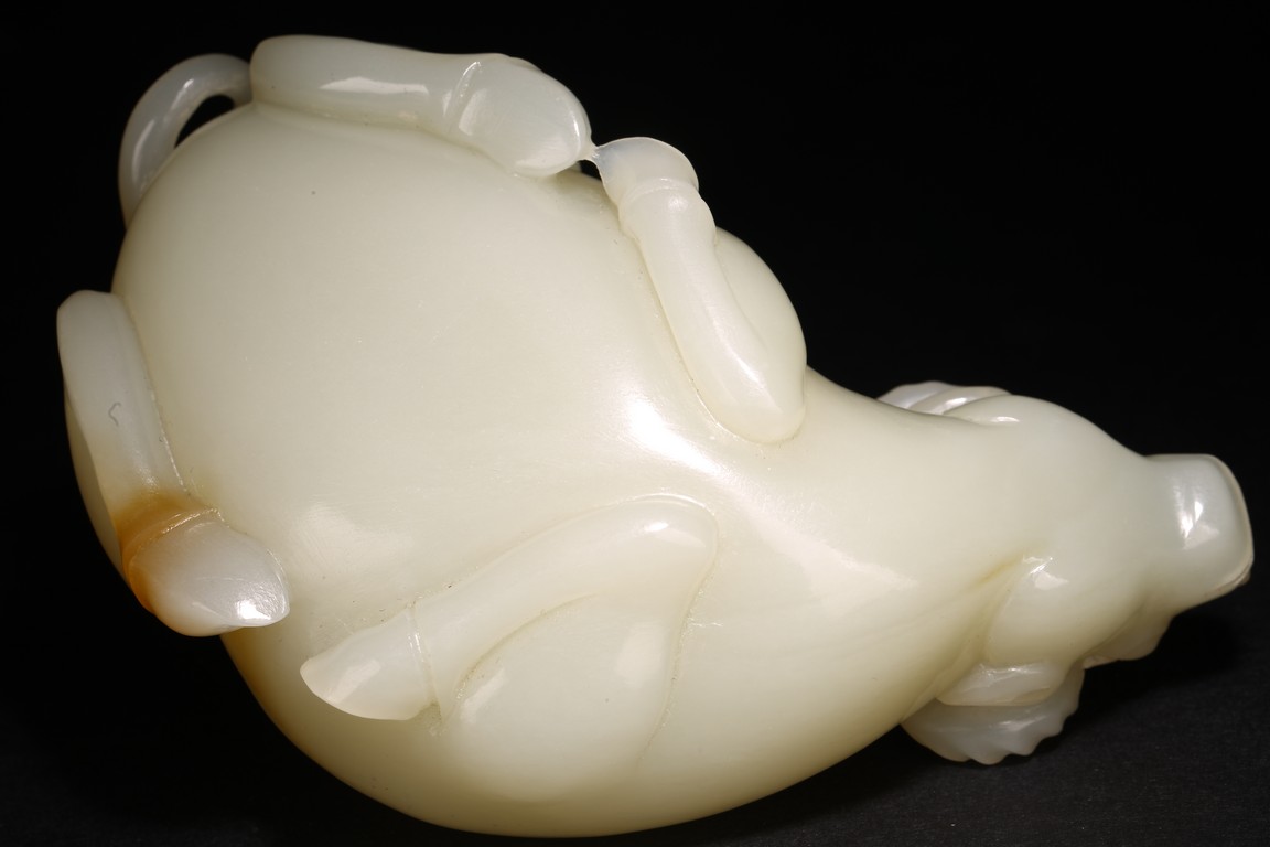 此水盂選用和田白玉為材,採用圓雕、浮雕工藝,雕琢一瑞牛,長角後盤,伸頭仰望,四肢俯臥,背上開槽,內部中空,鈕巧雕童子仰天狀,在牛背上一副幽然自得的景象。玉質細膩溫潤,表面略帶皮色,增加了許多韻味,值得收藏。