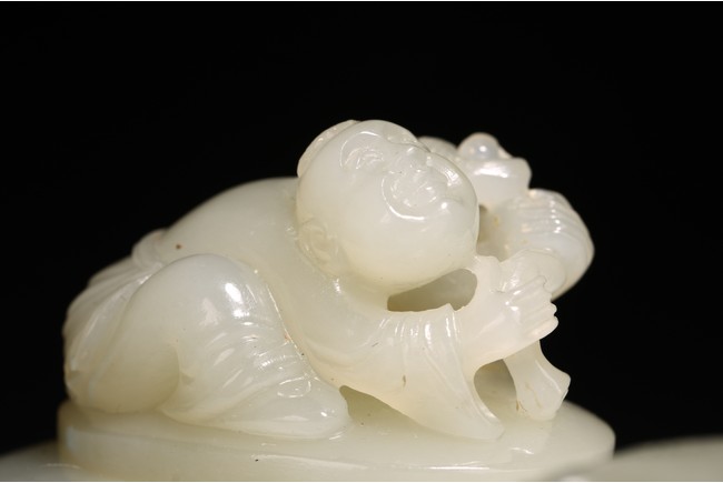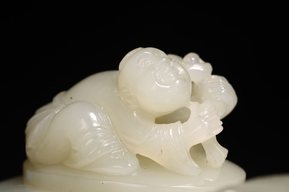 Finely carved with a recumbent buffalo, the cover on its back further carved with a boy, the stone is of smooth white tone with russet inclusions.