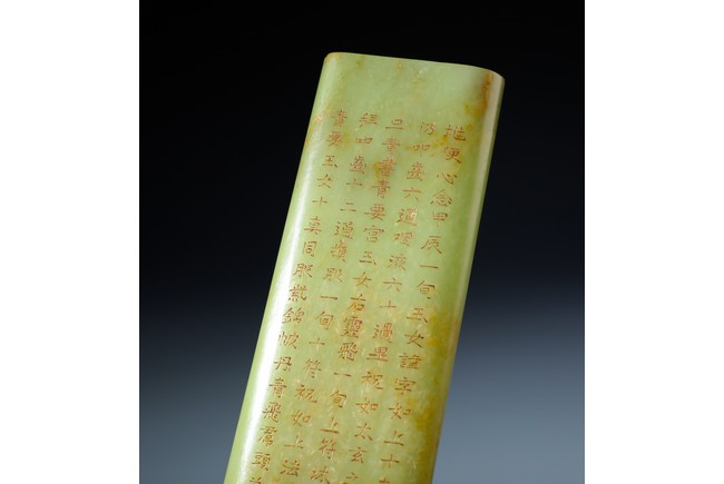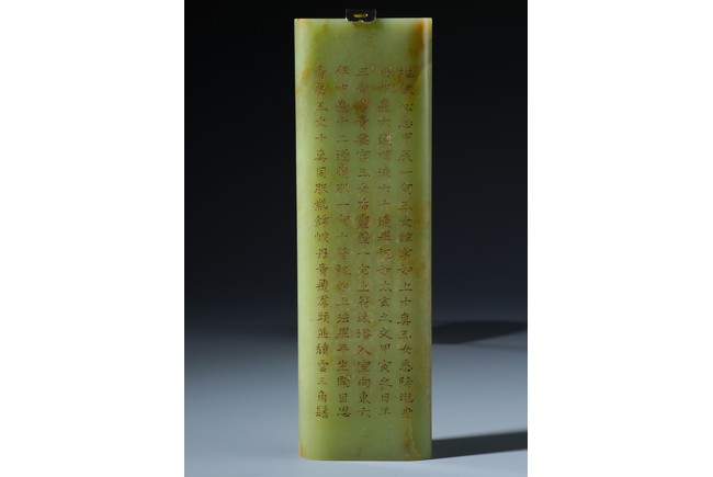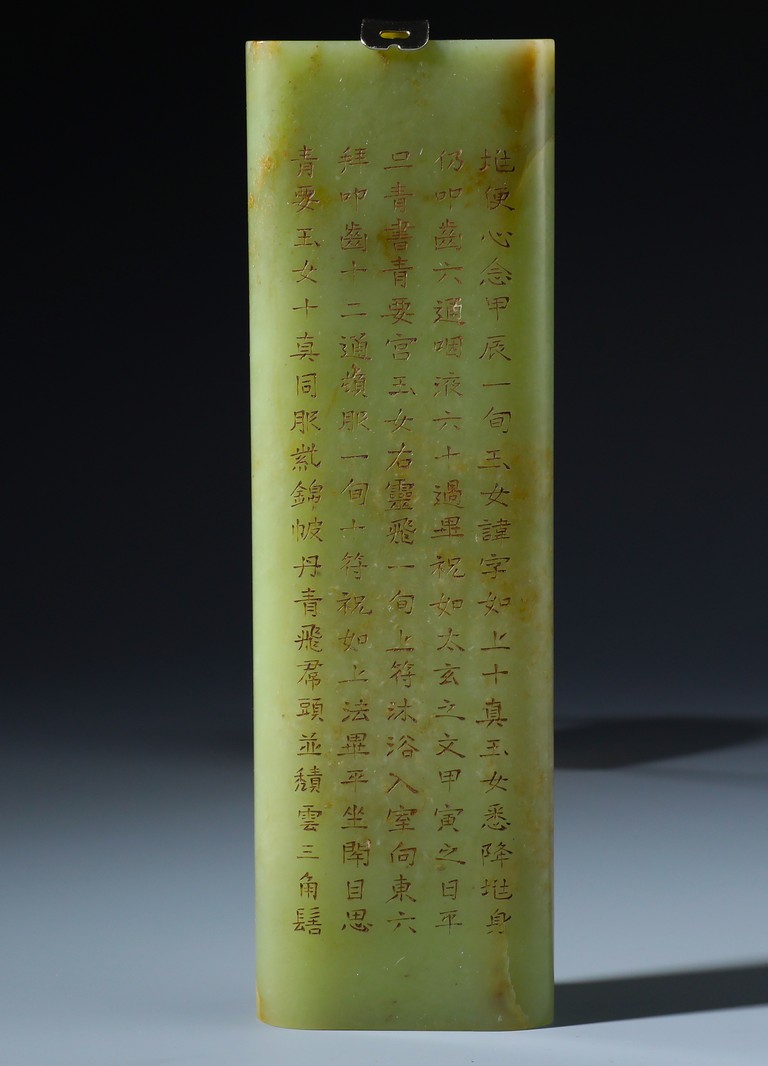 Of arched form, the convex surface finely inscribed with calligraphic inscriptions, the stone is of greenish yellow tone.
