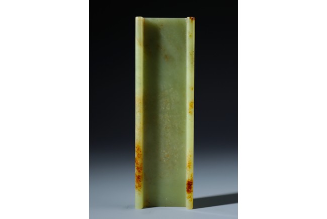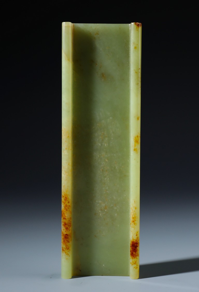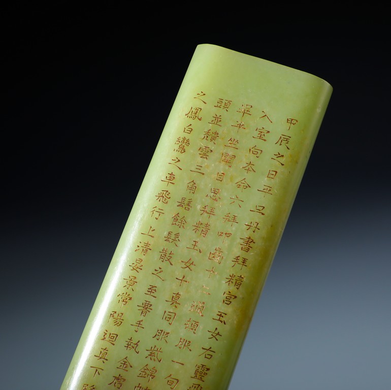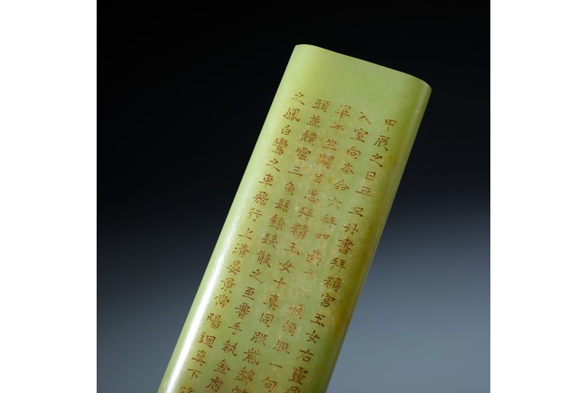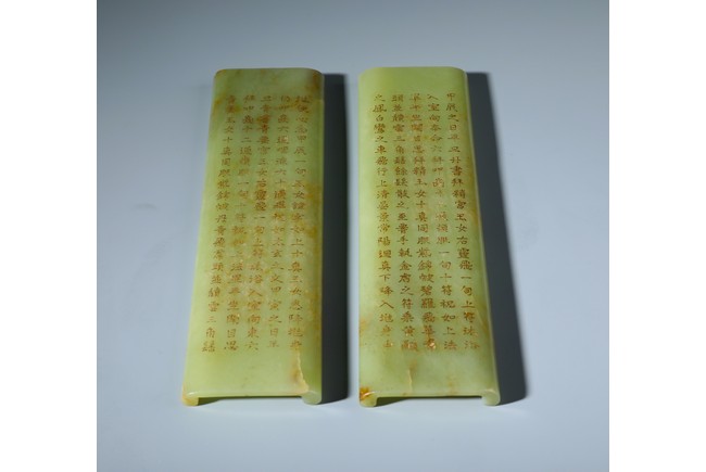 臂擱是寫字時⽤來墊臂肘的⽂房⽤具,⼜稱腕枕、秘閣,俗稱⼿枕。同時臂擱由於也成⻓條⽅狀,與鎮尺相類,也可充當鎮紙,壓在上⾯,防⽌紙⾯被⻛掀起。此臂擱以⻩⽟雕琢,⾊澤均勻濃郁,質地細膩,打磨光滑,瑩亮⽔潤。臂擱上陰刻詩⽂,字體⼯整,⼀絲不茍,排列整⻬。成對保存,實屬不易。