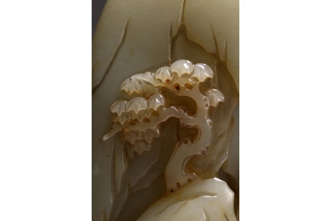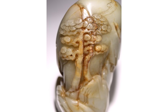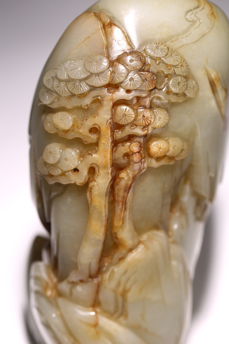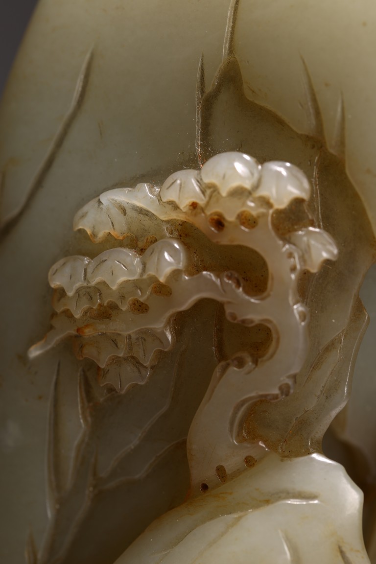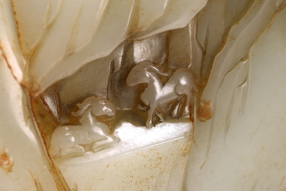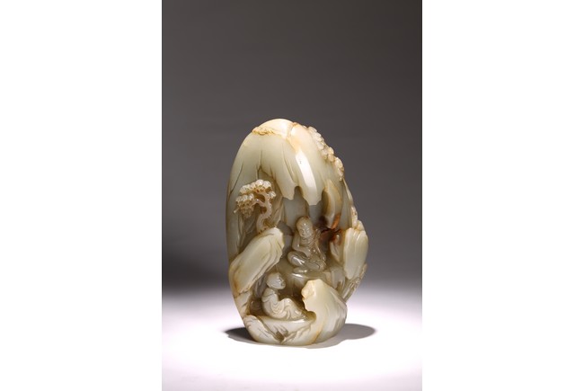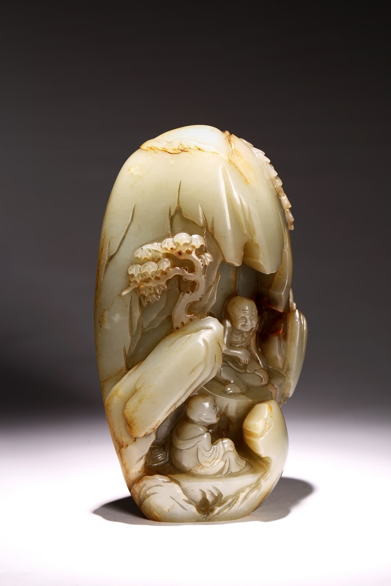 Qing Dynasty period. The boulder carved in high relief to one side with two luohan seated within a rocky grotto, the reverse carved with pine trees and two deer, the stone of white tone with russet veins and inclusions, with carved hardwood stand.