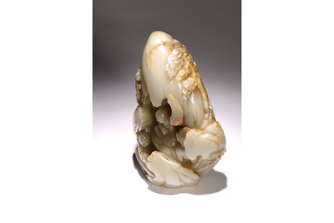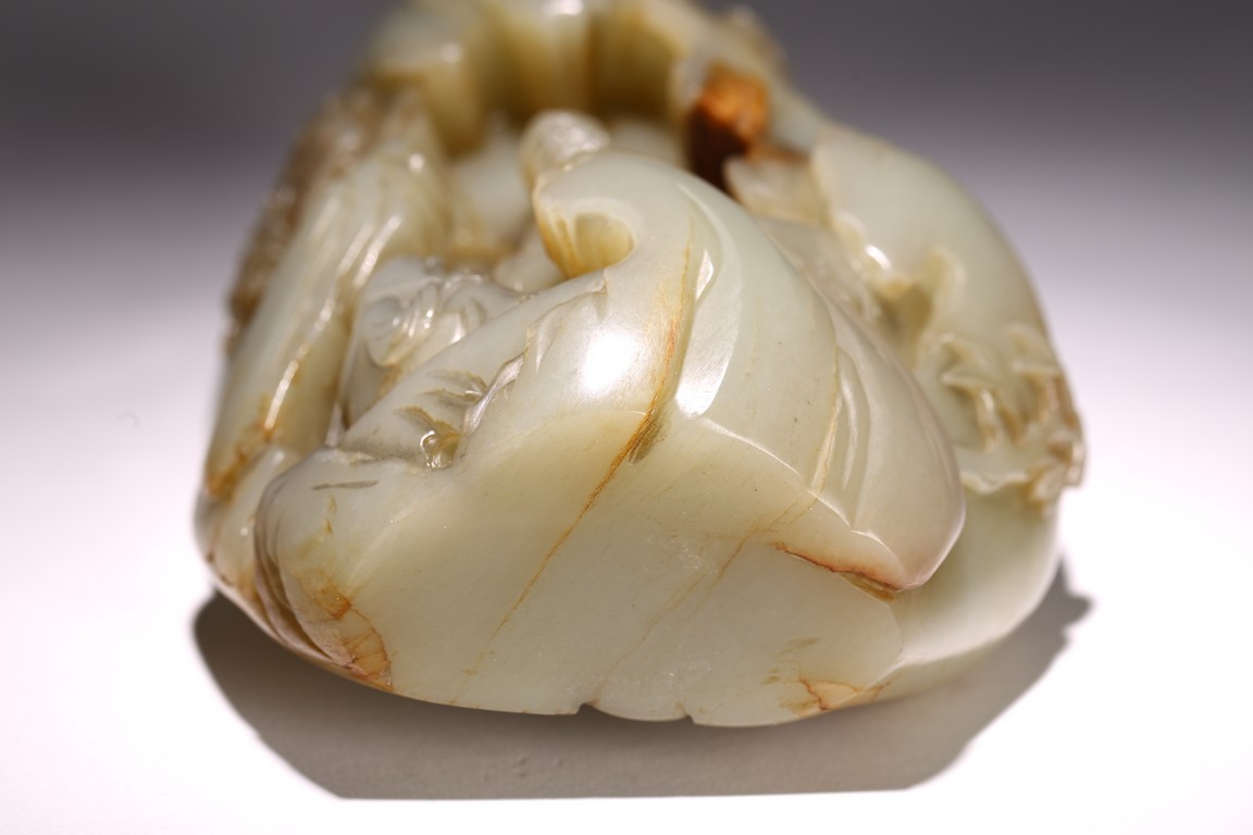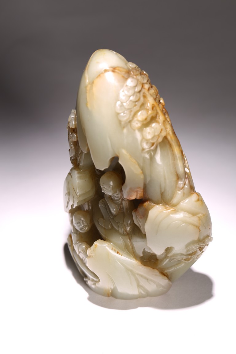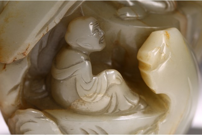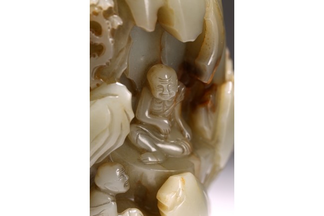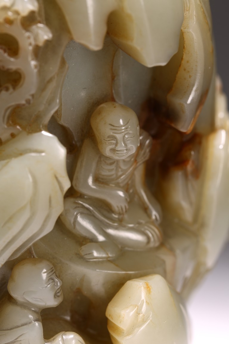 此作品青白色玉質,玉質瑩潤,整器隨形而雕,其上山峰聳立,奇石蒼勁,嶙峋突兀,峻峭挺拔,蒼松挺拔,二羅漢五官清晰,衣紋飄飄,單膝盤坐石上,上下相望,羅漢面容含笑,頗有清心寡欲,怡然自得之趣,意境深遠。