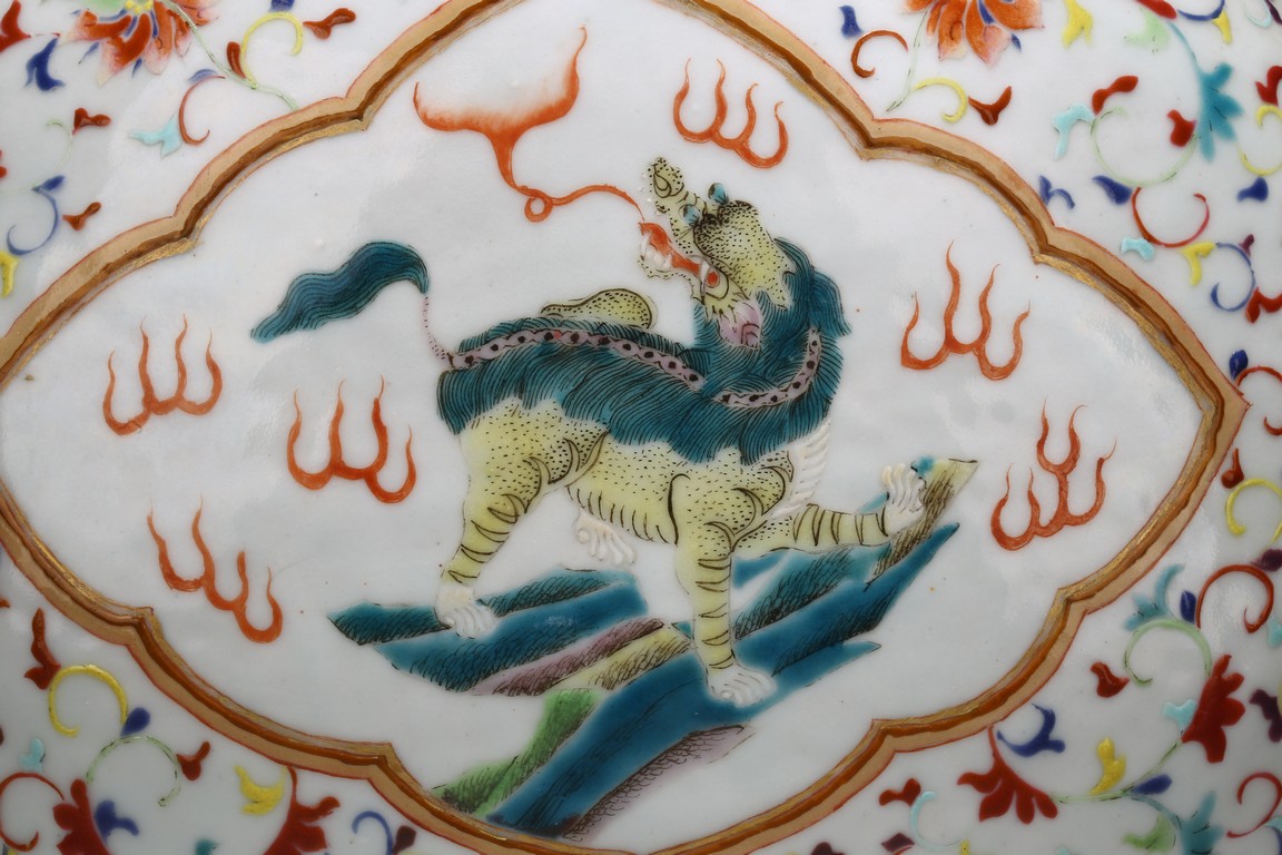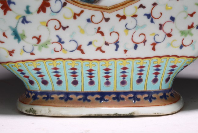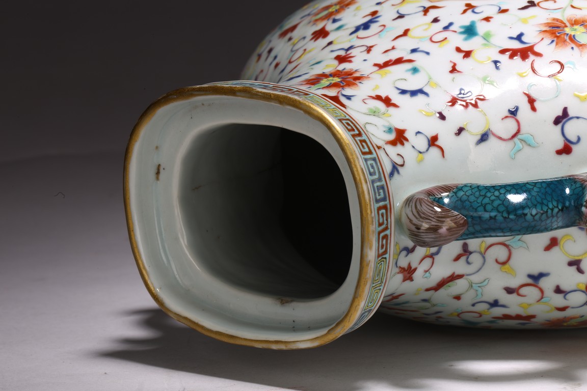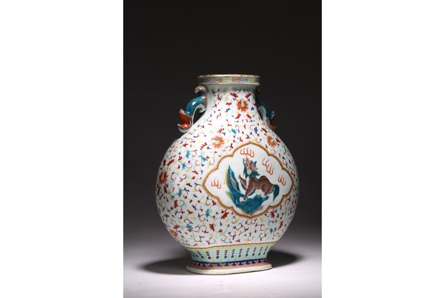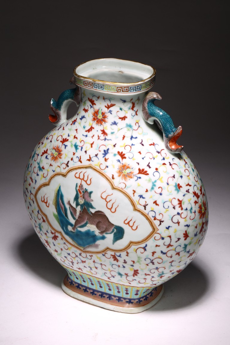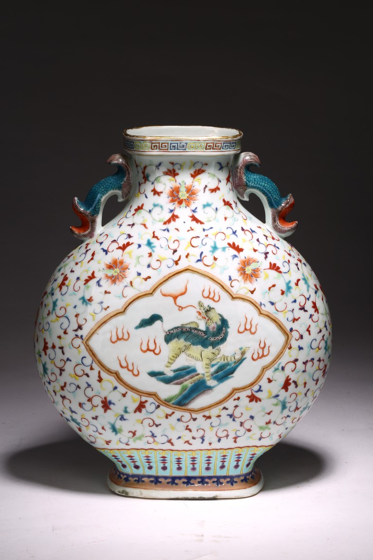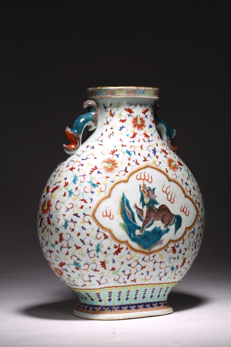 Qing Dynasty period. Of flattened circular form, the body enamelled with a Qilin enclosed in shaped cartouche, surrounded by meandering lotus scrolls, the waisted neck flanked by pair of 'carp' handles.