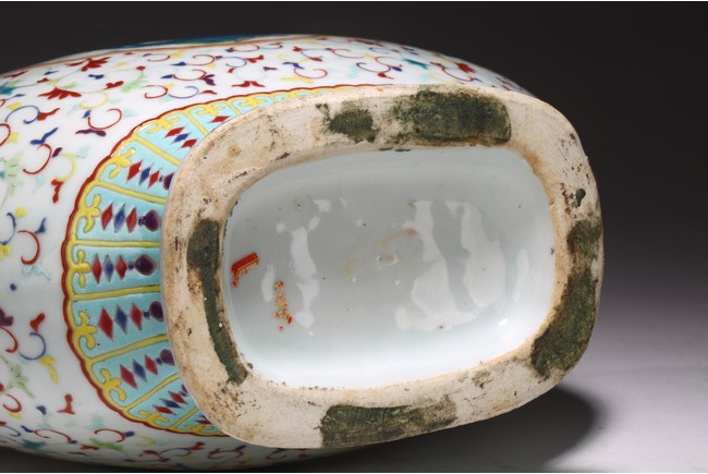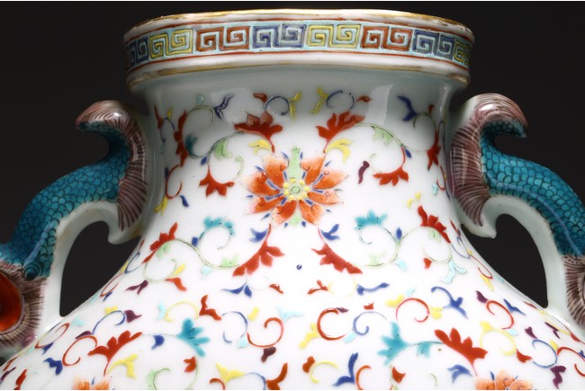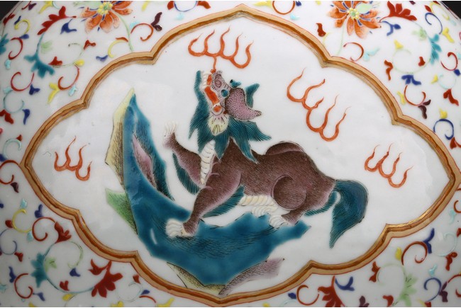 直口,粗頸,扁圓腹,橢圓形圈足,頸肩處飾雙魚耳。通體粉彩為飾,口沿繪“迴紋”,器身以“纏枝花卉紋”為地,開光畫“麒麟紋”,麒麟呈立姿,牛蹄形足,前肢一足抬起,作行走狀,麒麟顧盼回首,口吐煙雲,祥雲圍繞四周。麒麟,亦作“騏麟”,是中國古代傳說中的仁獸、瑞獸, 象徵祥瑞。