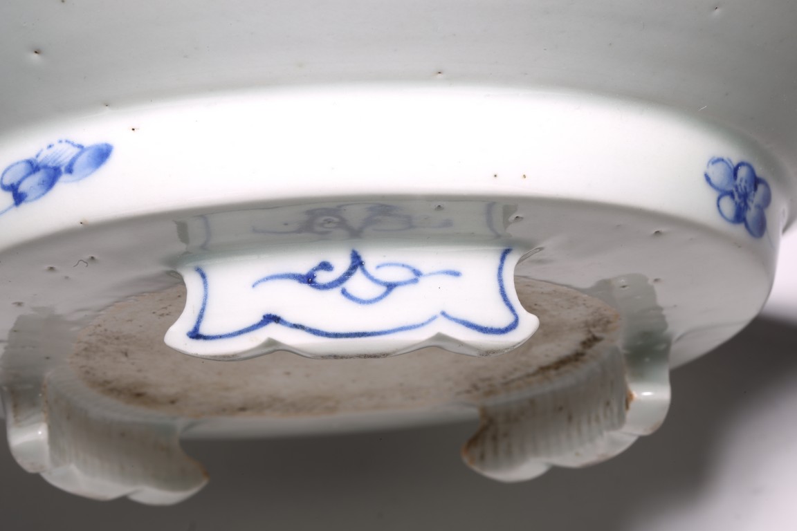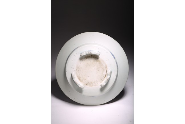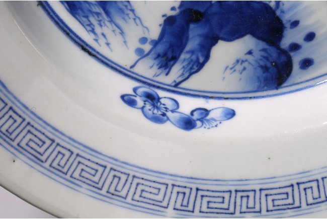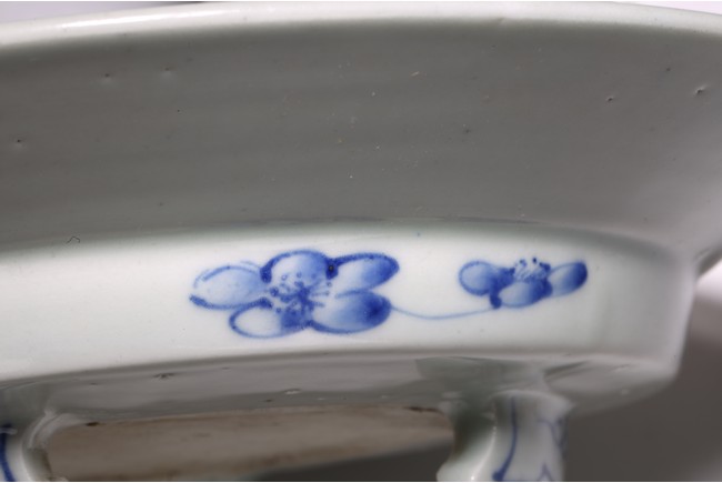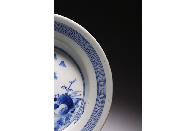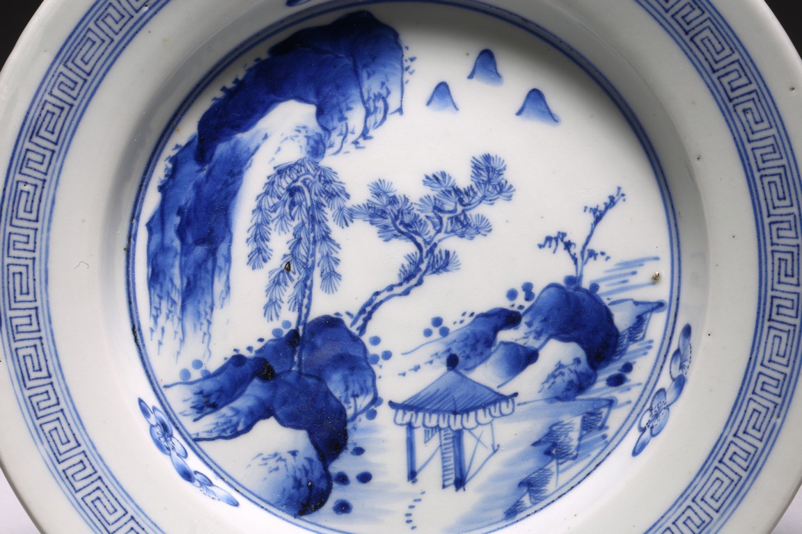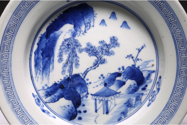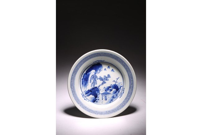 廣口折沿,直腹,圈足,帶有三足。口沿青花飾“迴紋”一周,盤心青花繪“山水紋”,構圖完整,重山疊嶂、松樹挺立、小亭聳立、一派生機勃勃的自然景象,文人氣息十足。整體畫面構圖繁複,筆法靈活,採用斧劈皴繪成,線條硬朗流暢,為康熙民窯難得精品。