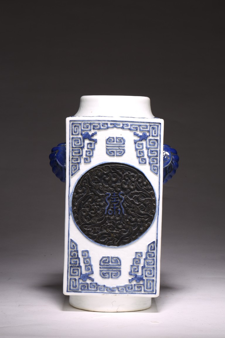 Qing Dynasty period. Of archaic cong form, the tall rectangular body rising from a broad circular base to a short tapered neck with rounded rim, the body carved with medallion enclosing pair of chi dragons flanking stylized character in black glaze, in between raised blue glazed archaistic scrolled borders, the sides flanked by pair of moulded elephant handles, base bearing a mark.
