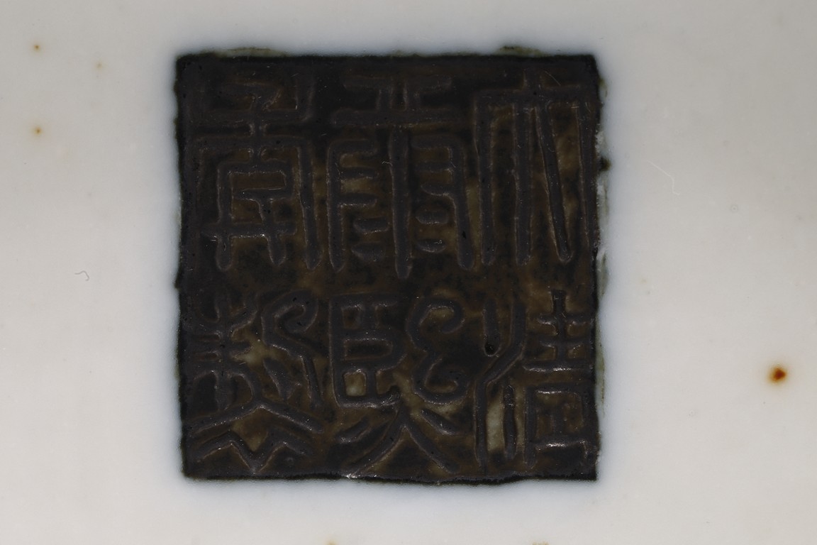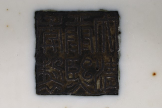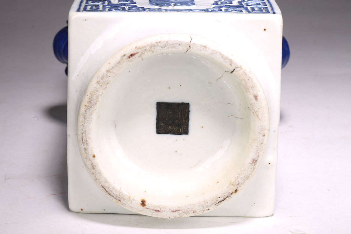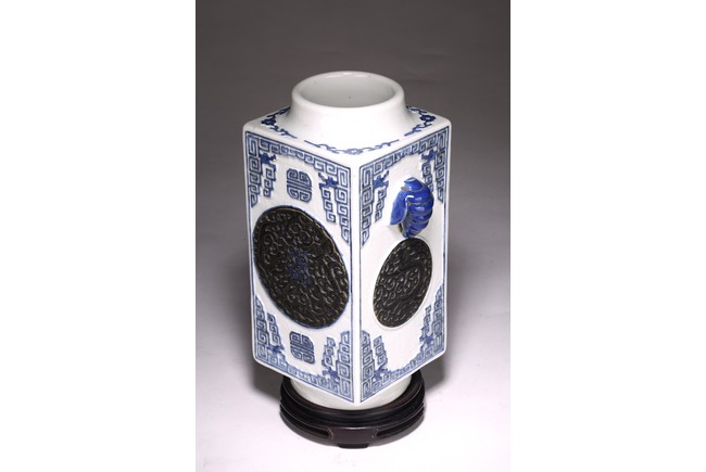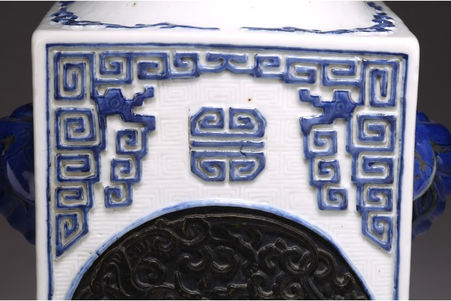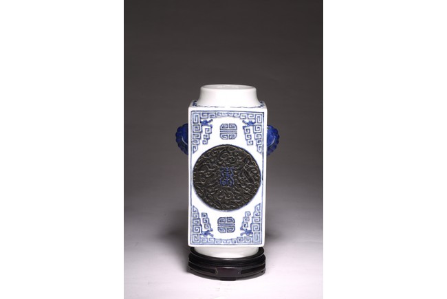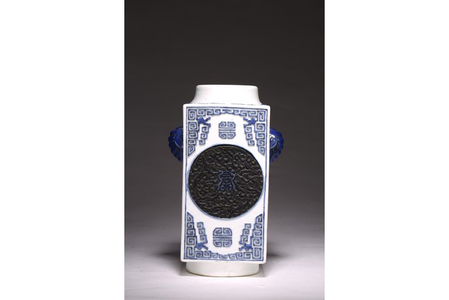 圓口方形器身,以代天圓地方,兩象耳塑於瓶身,象耳是後人增加吉祥用意的寫照,合指天下太平之意。上繪“迴紋”“壽字紋”“雙龍捧壽紋”,紋飾清晰,排列規矩。 “大清康熙年制”款識。
