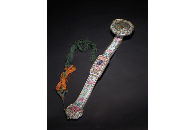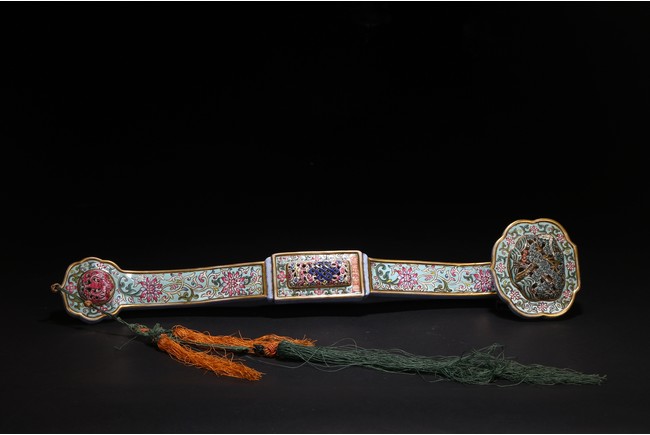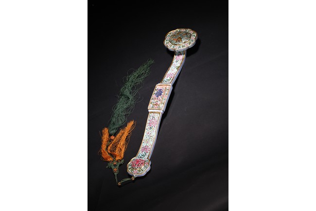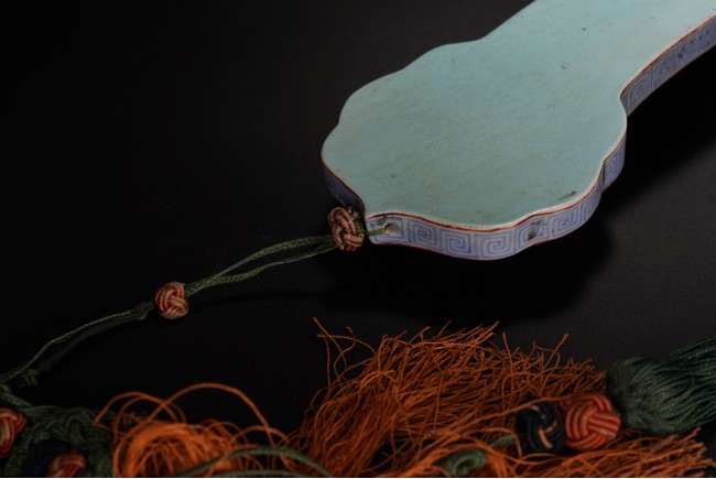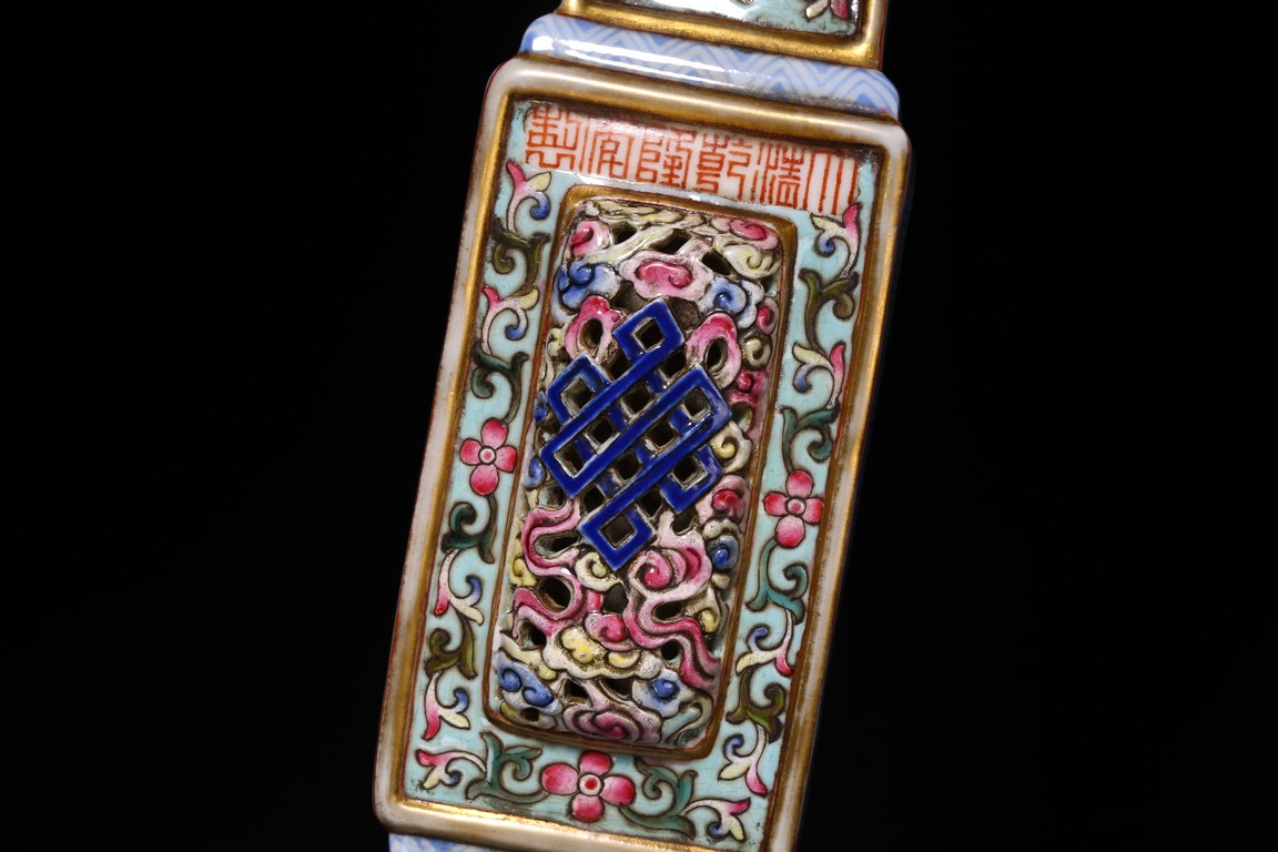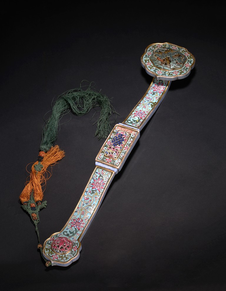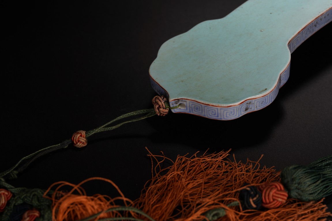 清代如意被視為吉祥瑞器,成為朝賀、祝壽、喜慶時不可或缺之物,宮禁之內,寶座、臥榻、案頭等方方面面都少不瞭如意的形影。現北京故宮博物院珍藏各式如意近三千柄,然而在故宮所藏大量各種材質的如意中,瓷質如意數量最少,可見其名貴。瓷如意先由內府造辦處下屬如意館繪出畫樣,得皇帝允准後發付江西景德鎮禦窯廠燒造,製作工藝複雜,不易保存,存世稀少。瓷如意本身就稀有,此品更是採用鏤刻技法,因而更是鮮見。此如意呈瑞芝狀,整體以鬆石綠釉為地,上有細小不規則開片,宛如真綠松石一般,細節到位。四周裝飾洋彩“纏枝花卉紋”,邊沿均以金彩勾勒裝飾,極為富麗堂皇。首面隆起,鏤空雕“靈芝松樹紋”。中軸隆起鏤雕佛教八寶紋飾“吉祥結紋飾”,曲柄末端亦鏤雕琢蝙蝠,寓意福保平安,表現了清代宮廷審美,圖必有意,意必吉祥的用意。整體佈局均衡,填色精準,是一件極其罕見的佳器。橫書紅款“大清乾隆年制”款識。 來源:紐約重要私人藏家收藏。可參考一件類似清代粉彩福壽紋描金如意,藏於北京故宮博物院; 以及佳士得紐約拍品號1575,2012年9月,成交價USD 40,000 Provenance: Property from an important collection, New York. For a similar Qing Dynasty famille rose ruyi scepter , please compare with a related piece in the collection of Beijing Palace Museum; and Lot 1575 sold for USD 40,000 in Christie's' New York Sept. 2012