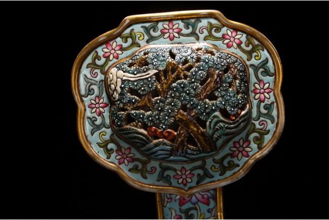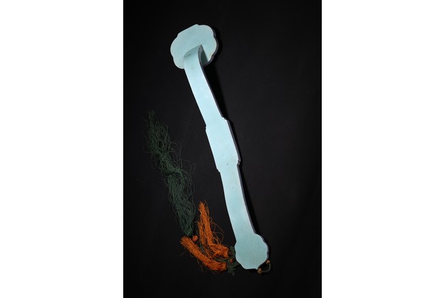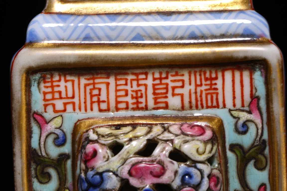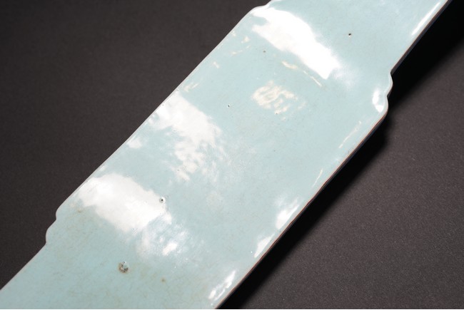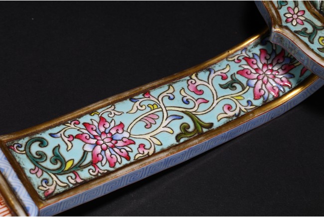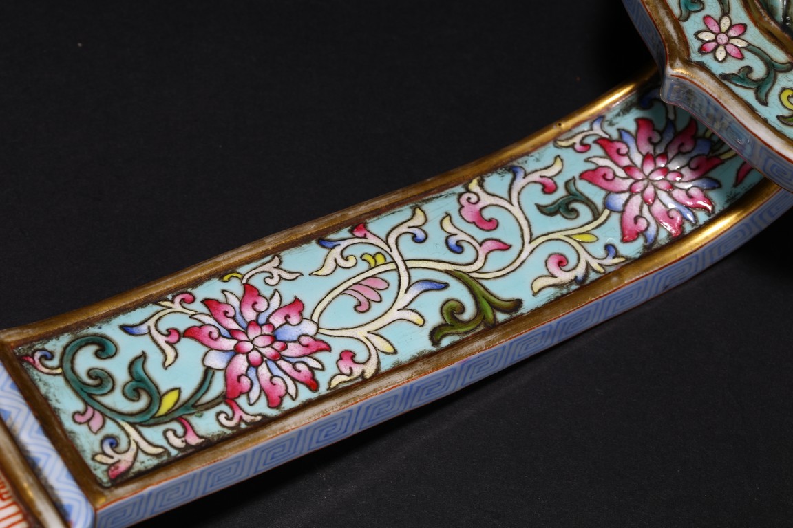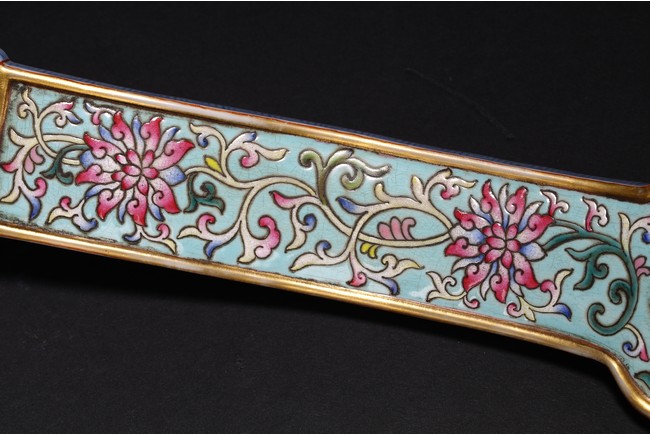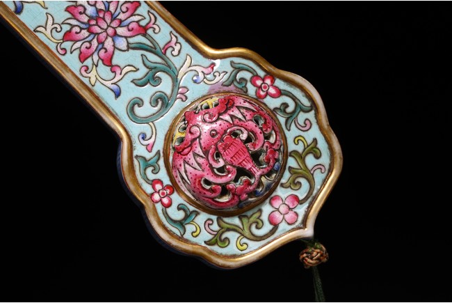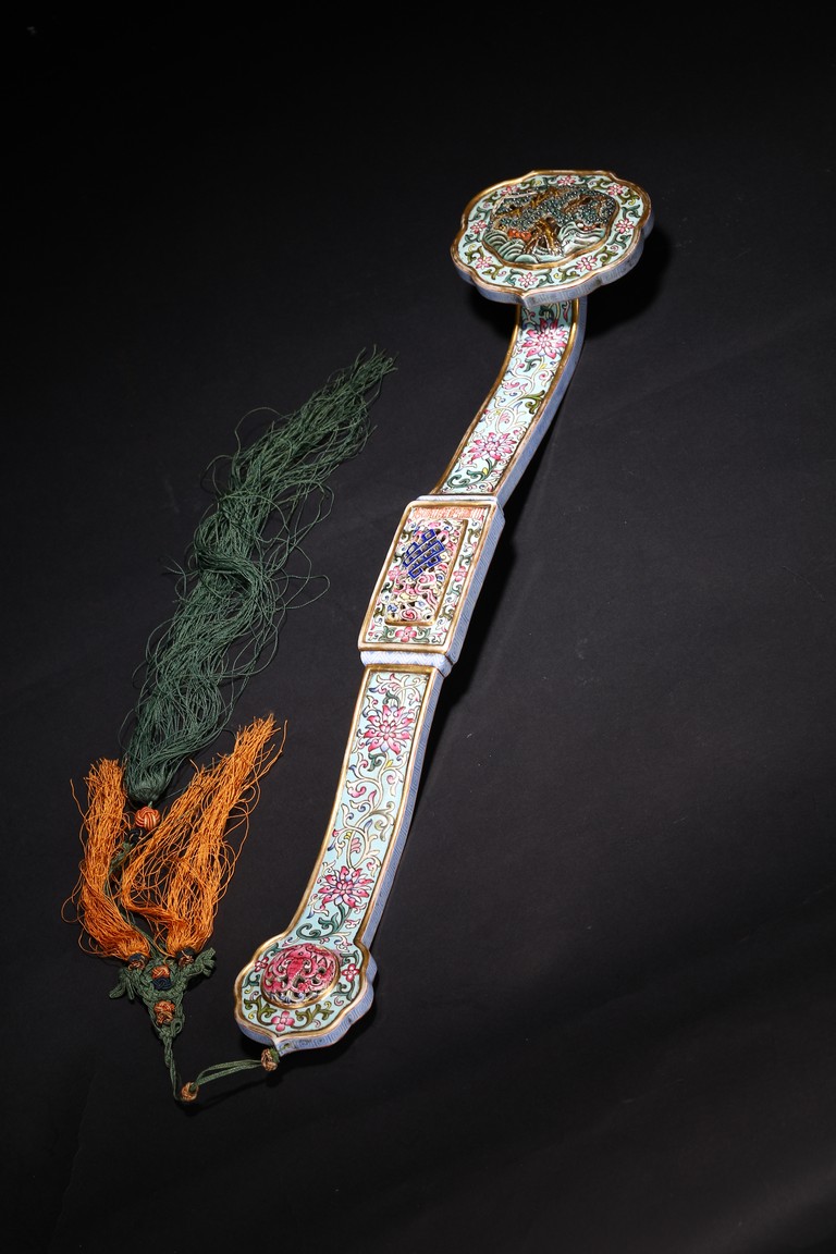 清代如意被視為吉祥瑞器,成為朝賀、祝壽、喜慶時不可或缺之物,宮禁之內,寶座、臥榻、案頭等方方面面都少不瞭如意的形影。現北京故宮博物院珍藏各式如意近三千柄,然而在故宮所藏大量各種材質的如意中,瓷質如意數量最少,可見其名貴。瓷如意先由內府造辦處下屬如意館繪出畫樣,得皇帝允准後發付江西景德鎮禦窯廠燒造,製作工藝複雜,不易保存,存世稀少。瓷如意本身就稀有,此品更是採用鏤刻技法,因而更是鮮見。此如意呈瑞芝狀,整體以鬆石綠釉為地,上有細小不規則開片,宛如真綠松石一般,細節到位。四周裝飾洋彩“纏枝花卉紋”,邊沿均以金彩勾勒裝飾,極為富麗堂皇。首面隆起,鏤空雕“靈芝松樹紋”。中軸隆起鏤雕佛教八寶紋飾“吉祥結紋飾”,曲柄末端亦鏤雕琢蝙蝠,寓意福保平安,表現了清代宮廷審美,圖必有意,意必吉祥的用意。整體佈局均衡,填色精準,是一件極其罕見的佳器。橫書紅款“大清乾隆年制”款識。 來源:紐約重要私人藏家收藏。可參考一件類似清代粉彩福壽紋描金如意,藏於北京故宮博物院; 以及佳士得紐約拍品號1575,2012年9月,成交價USD 40,000 Provenance: Property from an important collection, New York. For a similar Qing Dynasty famille rose ruyi scepter , please compare with a related piece in the collection of Beijing Palace Museum; and Lot 1575 sold for USD 40,000 in Christie's' New York Sept. 2012