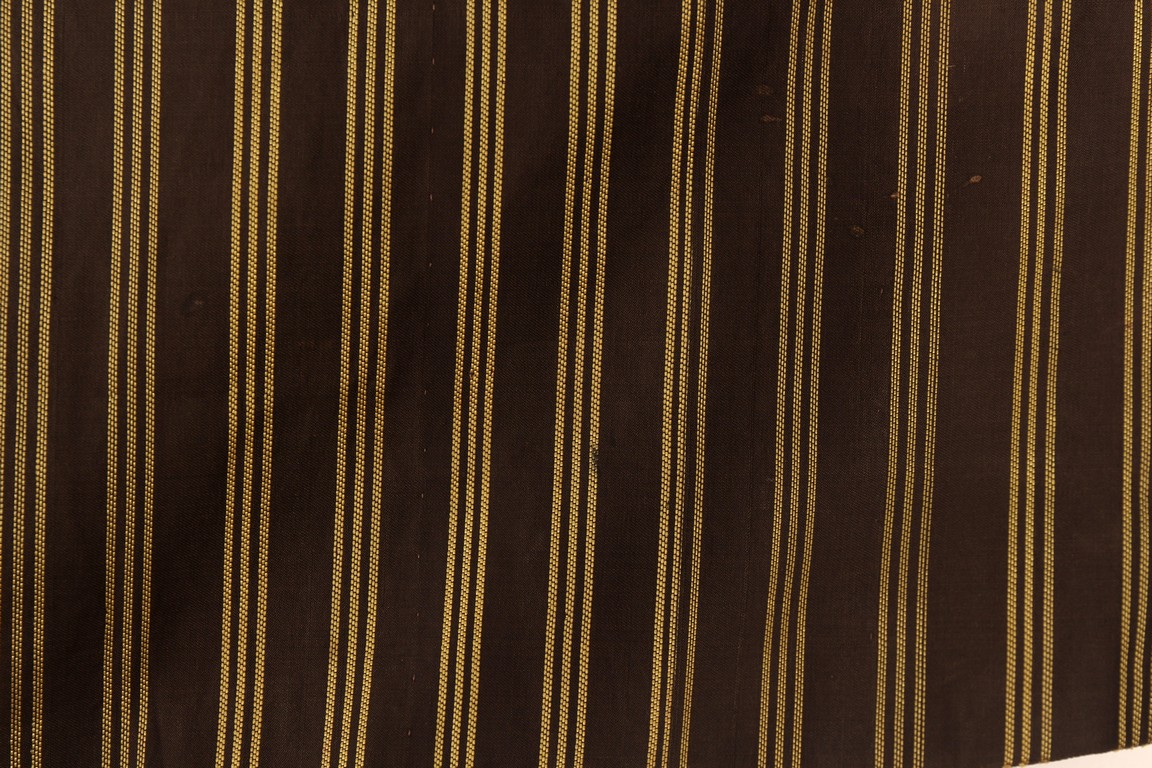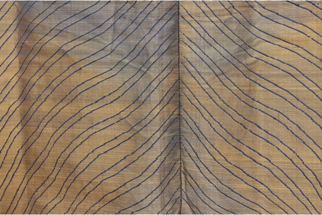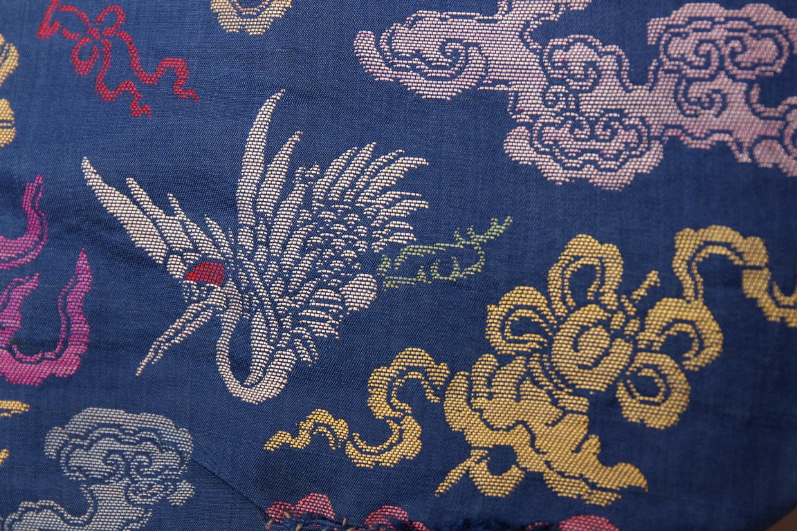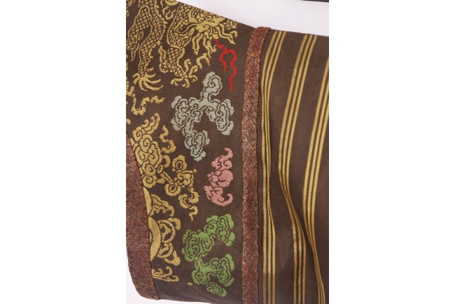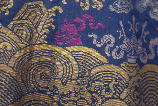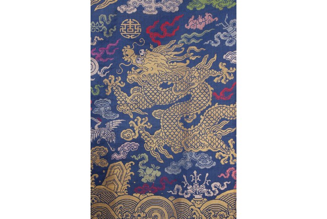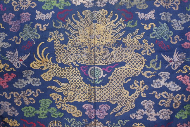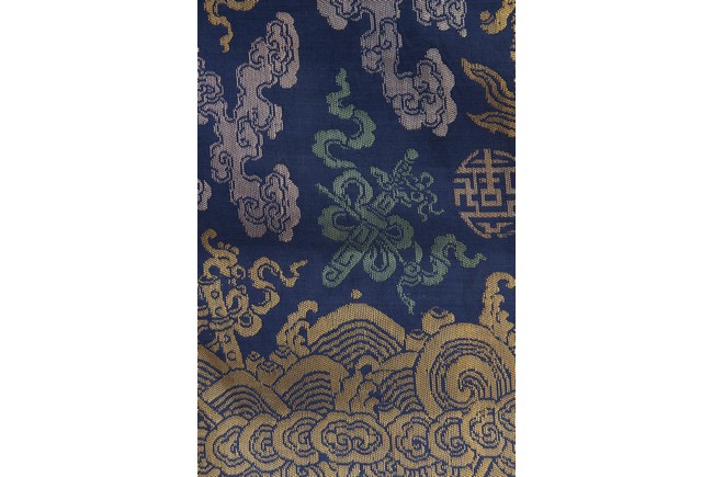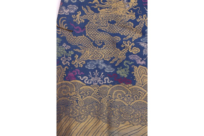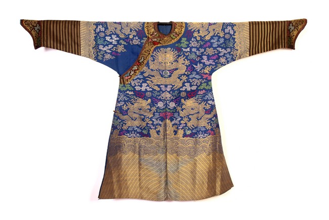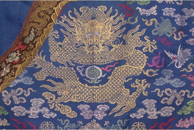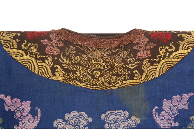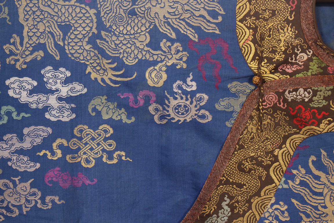 此袍圓領右襟,馬蹄式袖口,藍色綢地,以盤金繡工藝滿飾龍紋,雲蝠紋和八寶紋等。所繡龍紋均用金絲高繡而成,光彩奪目,造型生動、形像傳神。整件龍袍祥雲遍布,姿態萬千,洪蝠迭現,靈瑞咸集,採用釘繡套針、纏針等刺繡方法,紋飾繁密豐富,曲線圓順,繡面平服,絲縷端正,針距均勻,無露無疊,富麗典雅、盡顯皇家風範。
