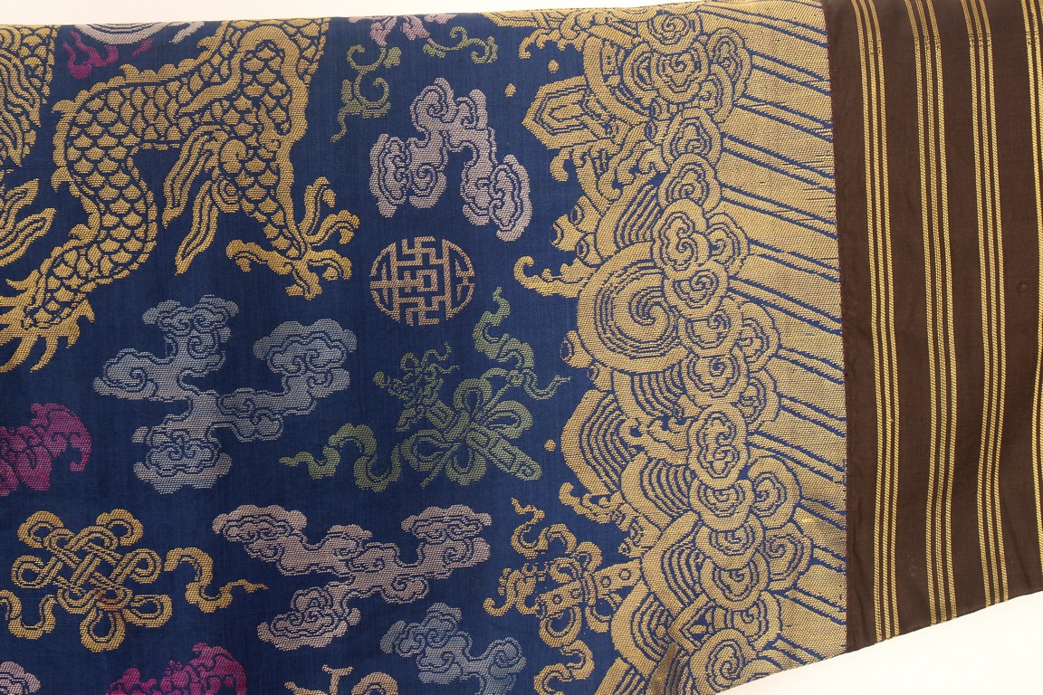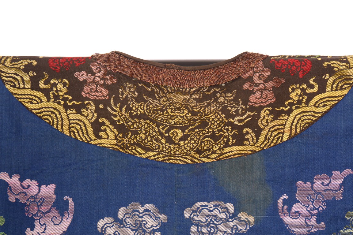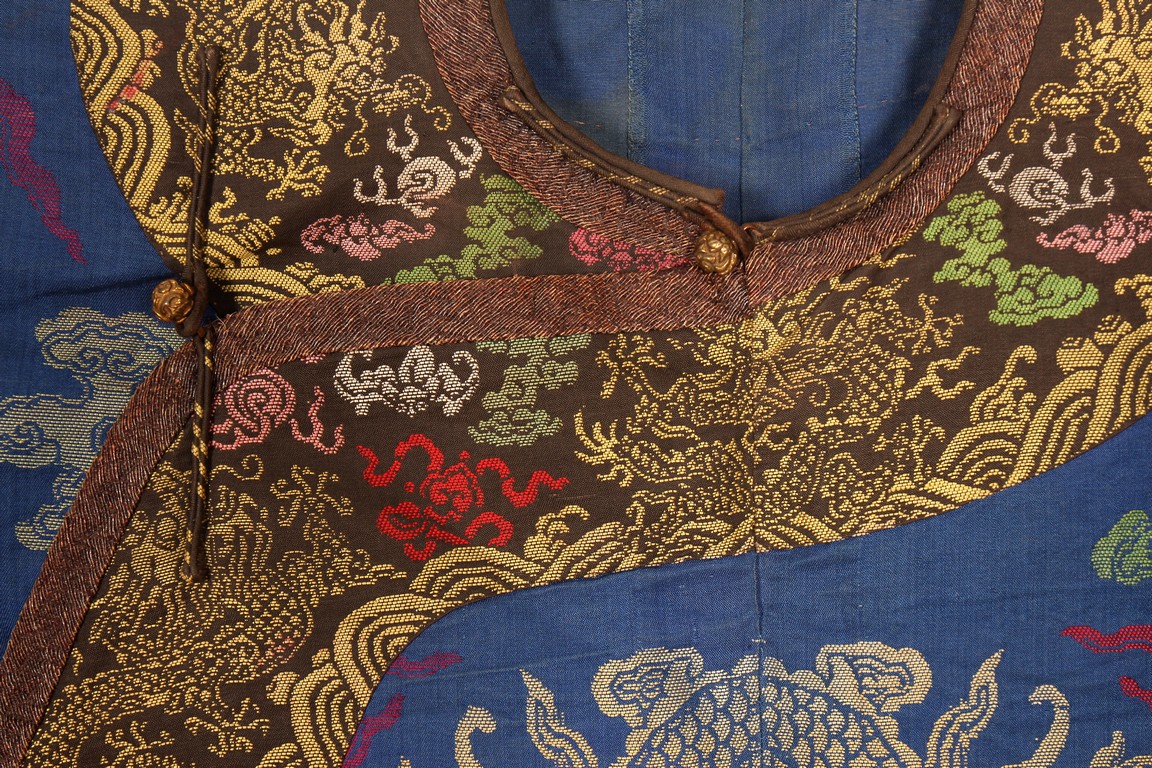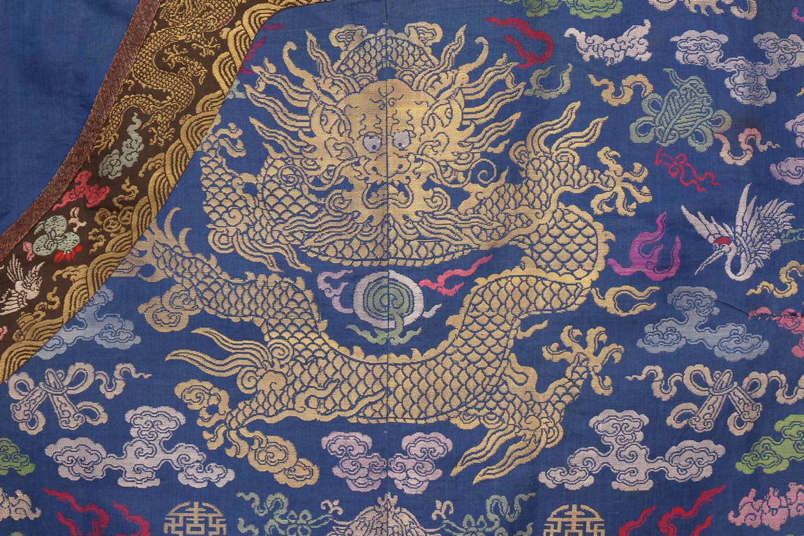 Qing Dynasty period. The blue ground embroidered with gold-wrapped and bright silk threads with eight five-clawed dragons pursuing 'flaming pearls' amidst clouds, cranes, and auspicious emblems above crashing waves and lishui stripe.