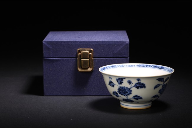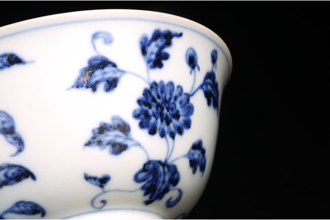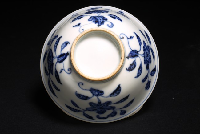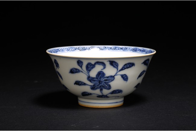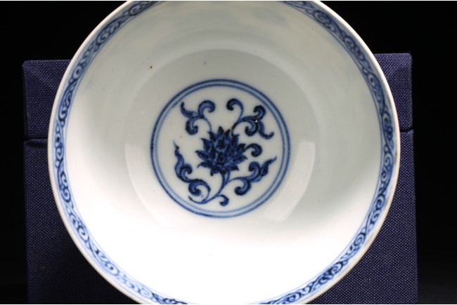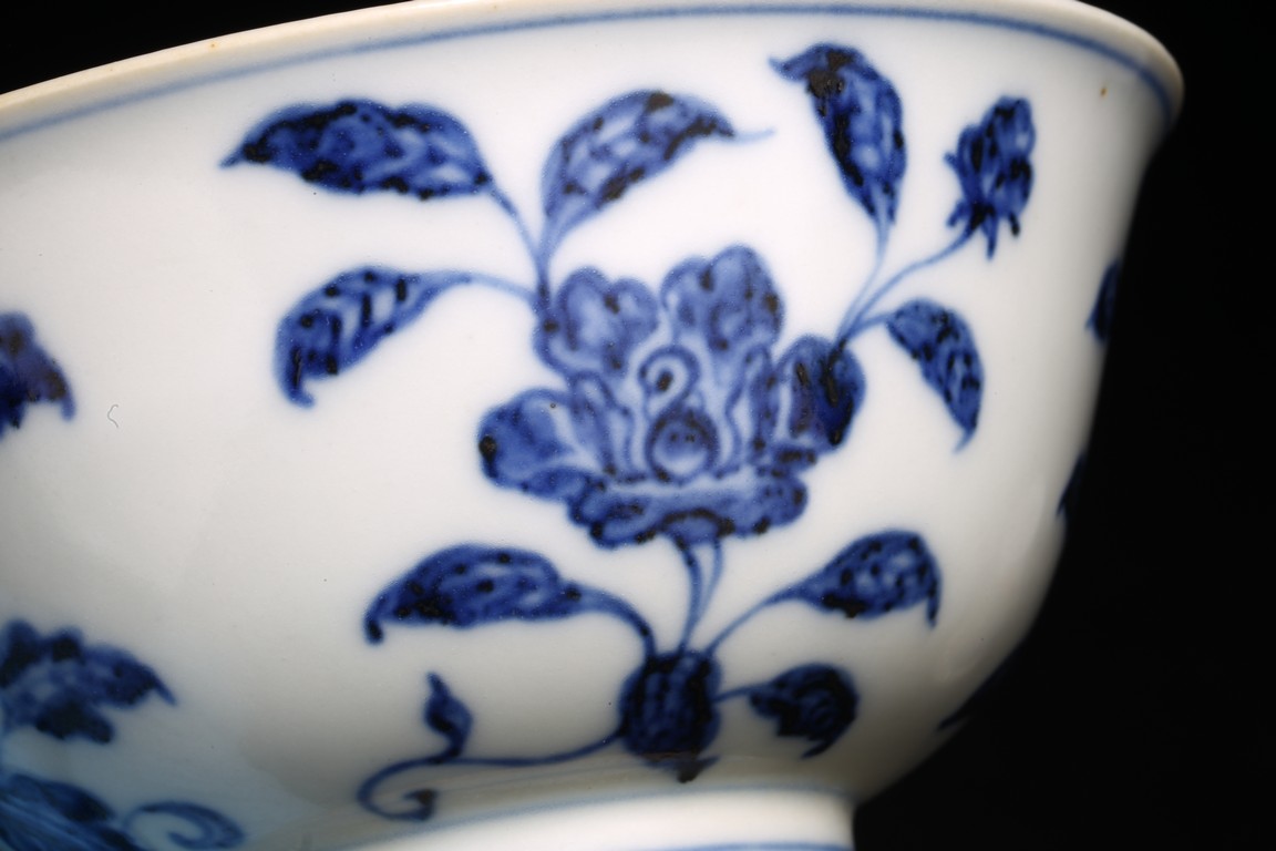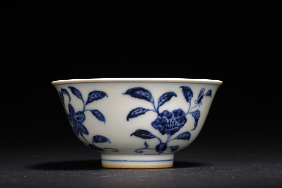 Ming Dynasty period or later. Finely potted with deep rounded sides resting on short foot and rising to a flared rim, finely painted in dark cobalt blue to the exterior with lotus, peony, camellia, chrysanthemum, between single line borders, the interior with a central medallion enclosing a lotus spray, base in white glaze.