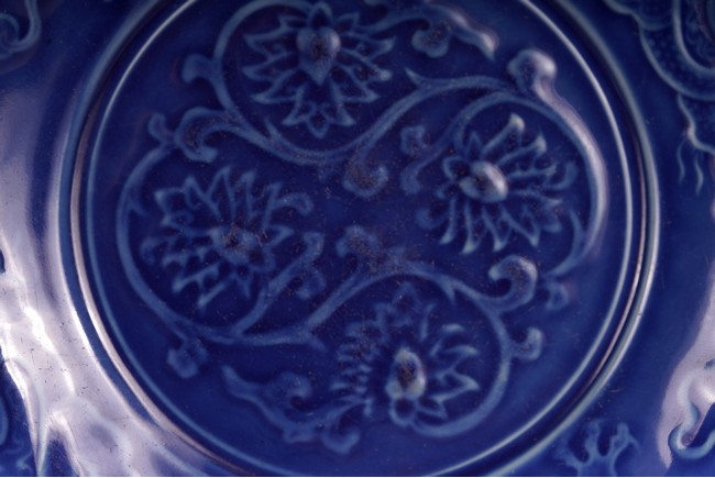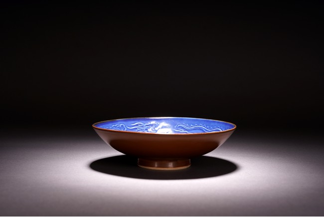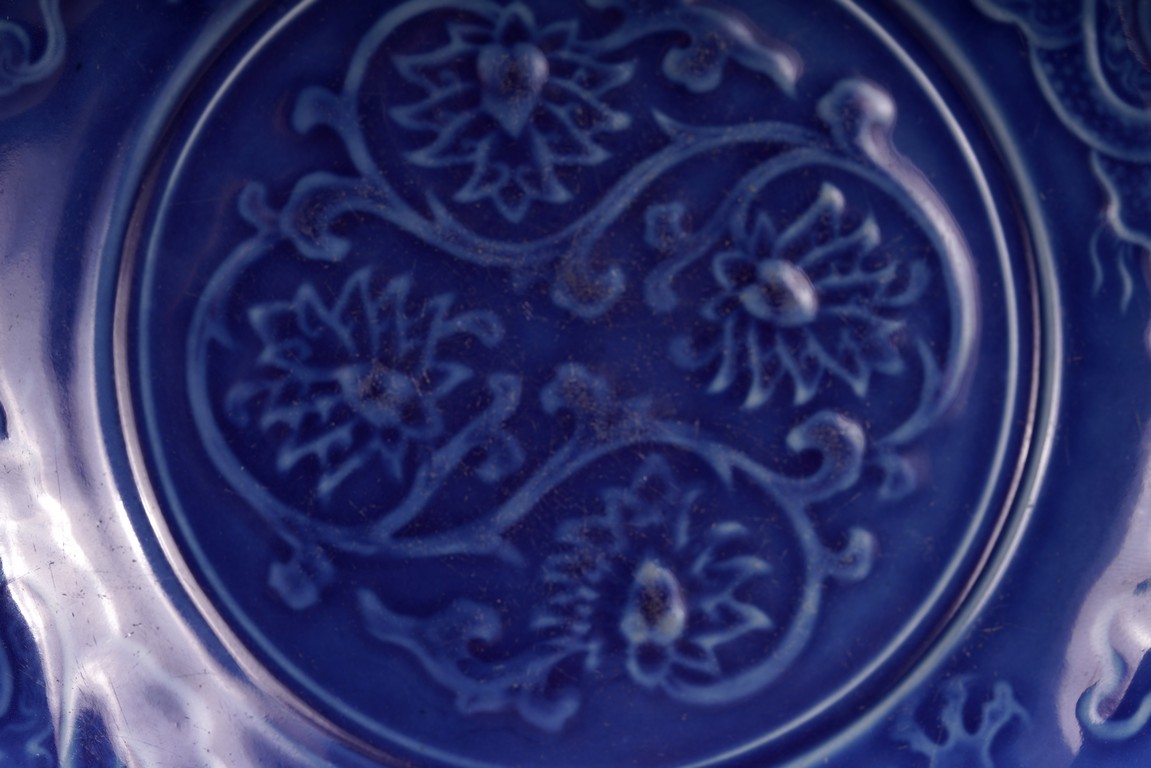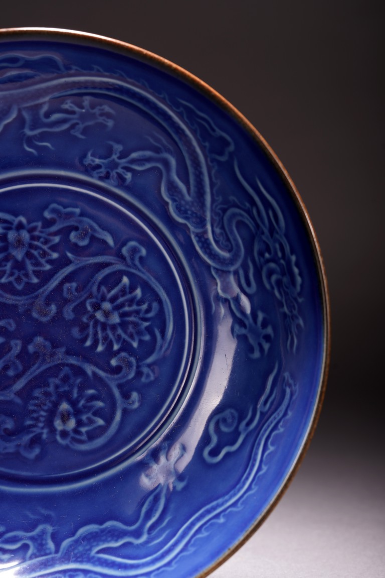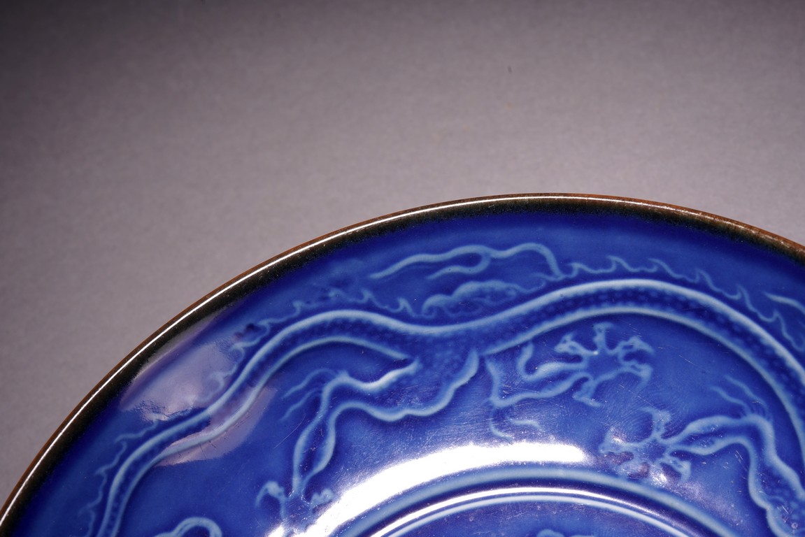 With rounded sides, the interior decorated with four lotus blooms surrounded by pair of dragons to the well, all reserved on blue ground, the reverse covered in brown glaze.