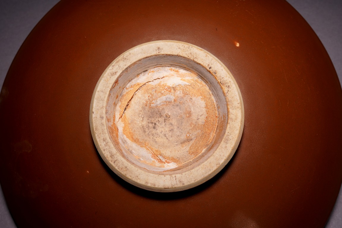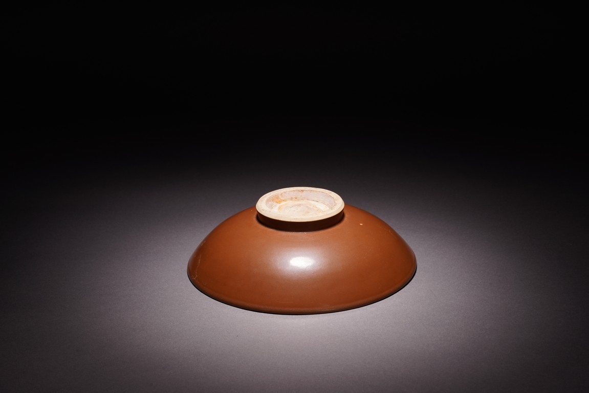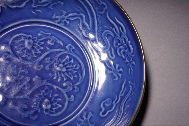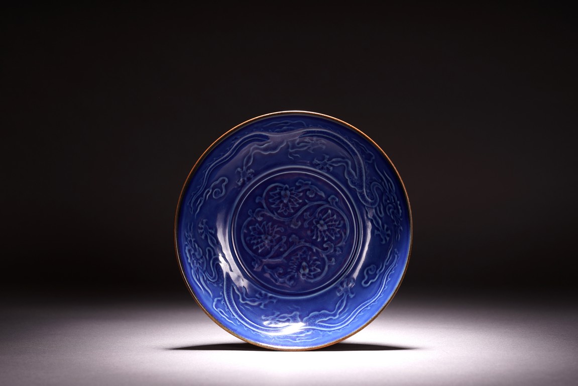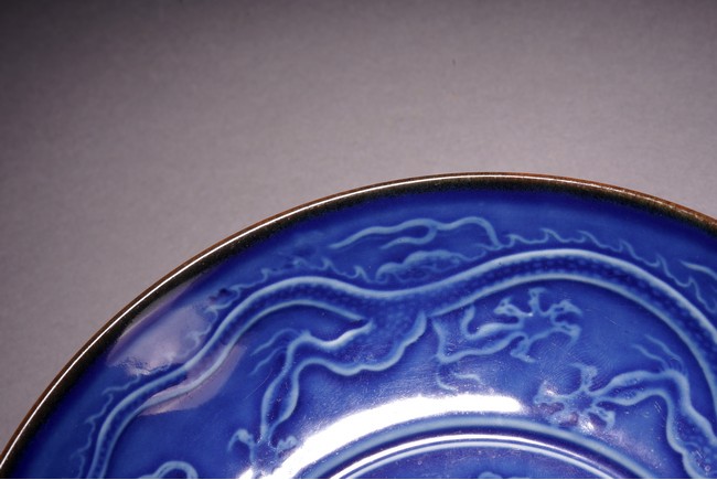 With rounded sides, the interior decorated with four lotus blooms surrounded by pair of dragons to the well, all reserved on blue ground, the reverse covered in brown glaze.