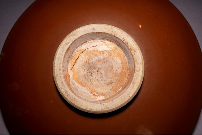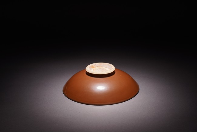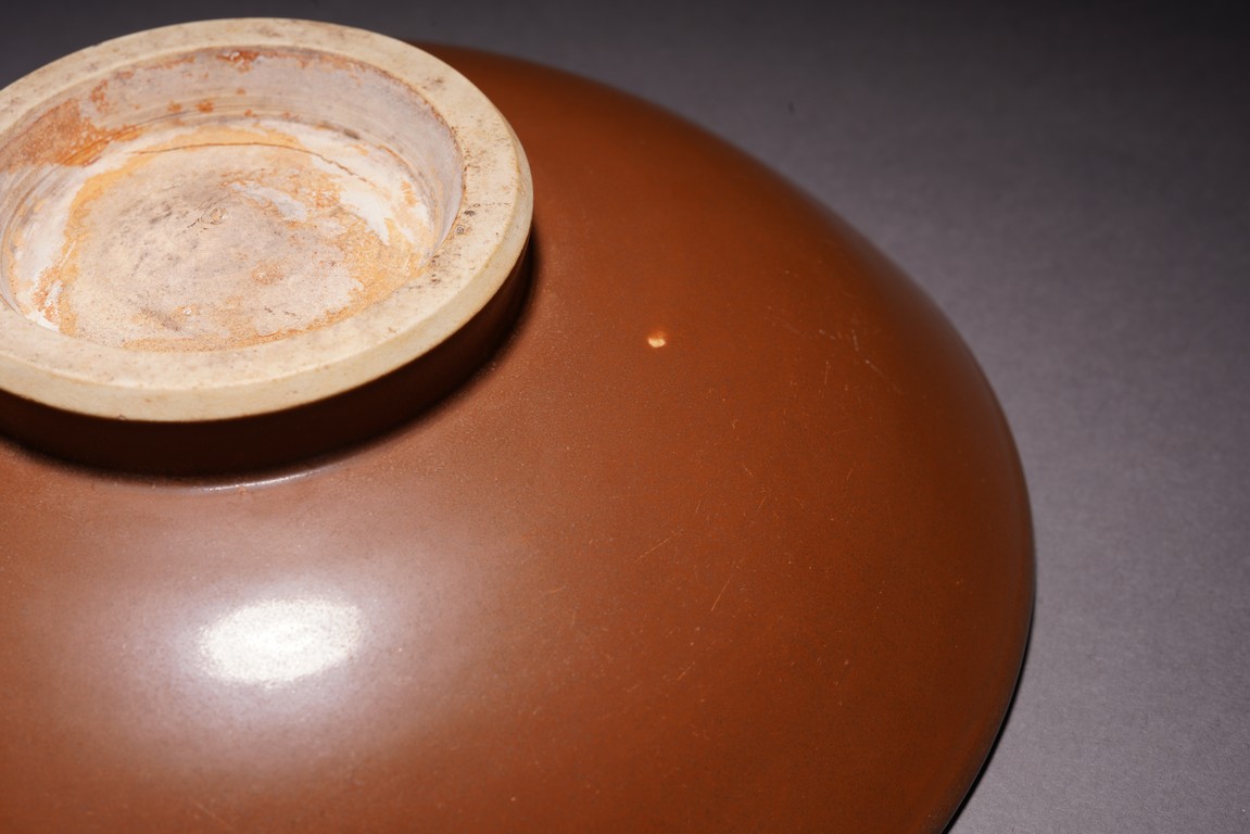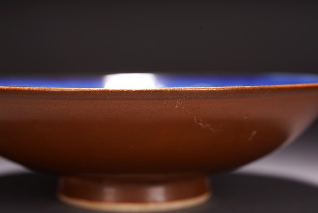 此碗敞口、弧腹、矮圈足。外壁整體施紫金釉,內部施霽藍釉,採用留白工藝繪雙龍紋,碗心繪纏枝菊紋,顏色搭配相得益彰,釉色沉穩大氣,胎質細膩堅實,形制規整周正,有明顯的時代風格,保存完好,值得收藏。