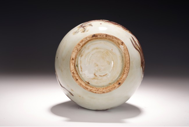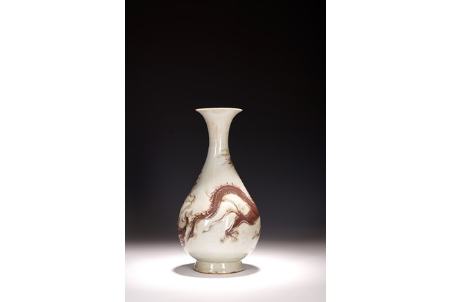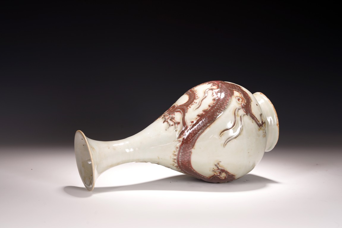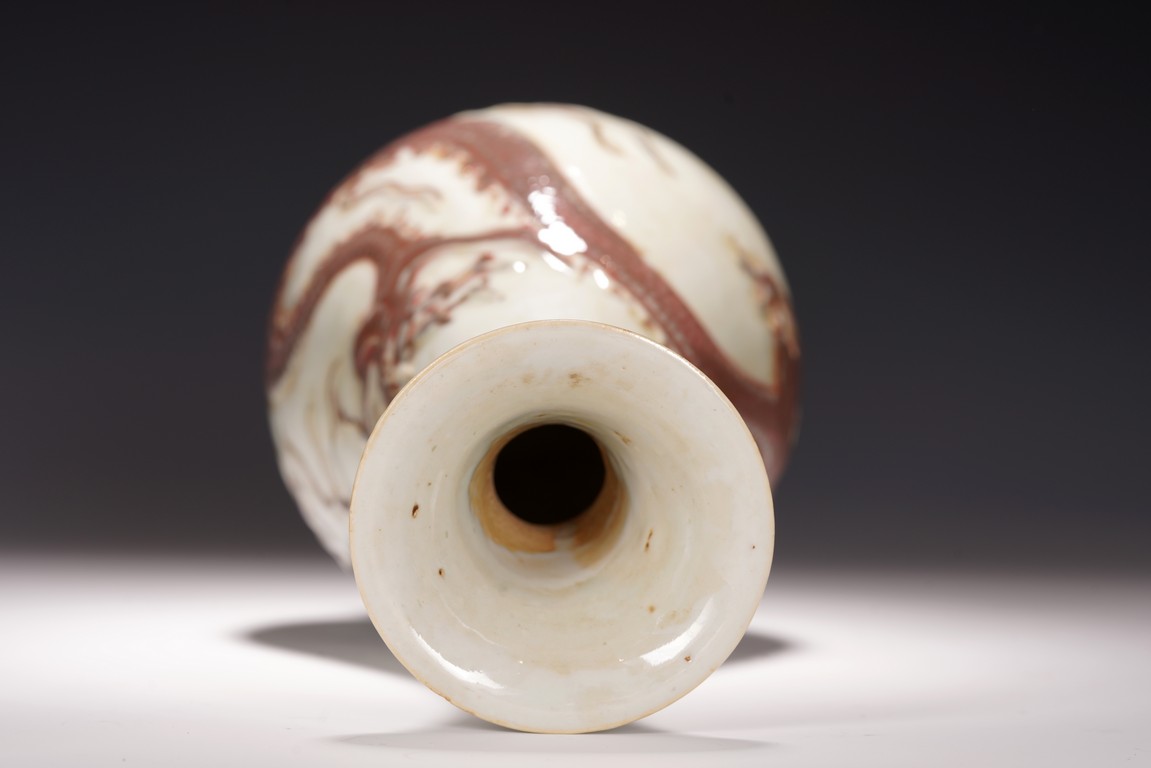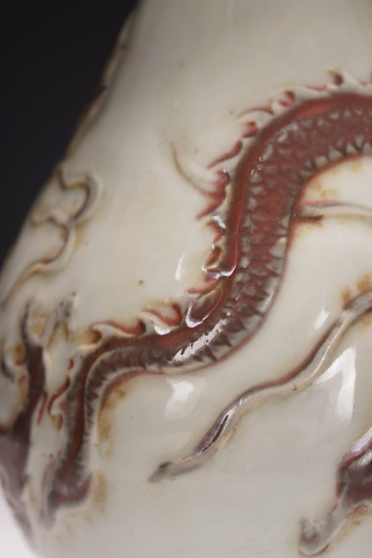 此瓶撇口,束頸,斜肩,垂腹,淺圈足。通體施白釉,以堆塑釉裡紅裝飾,瓶身主體釉裡紅繪以龍紋主題,祥龍形式威武,呈騰龍飛翔狀,顯得生動逼真。整器製作規整,線條流暢,造型優美,釉裡紅精緻濃鬱,畫工精湛,紋飾層次分明,形制經典,保存完好,朝代特徵明顯,收藏佳器。玉壺春瓶的造型定型於北宋時期,在當時是一種裝酒的使用器具,後來逐漸演變為觀賞性的陳設瓷,是中國瓷器造型中的一種典型器形。