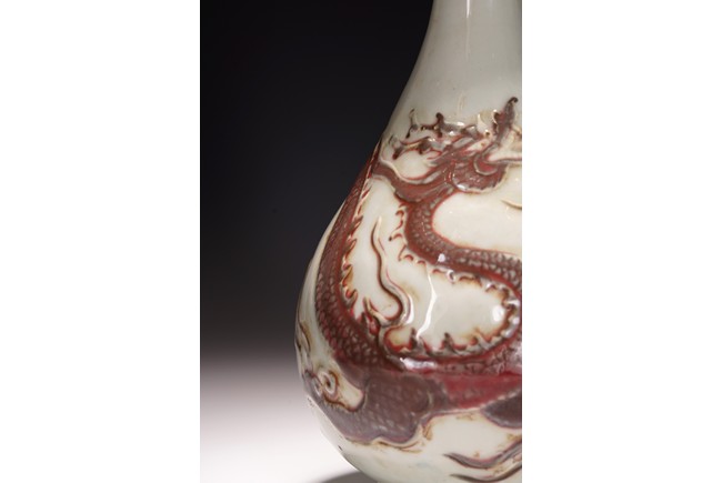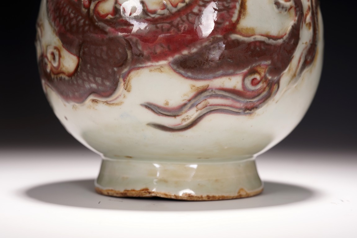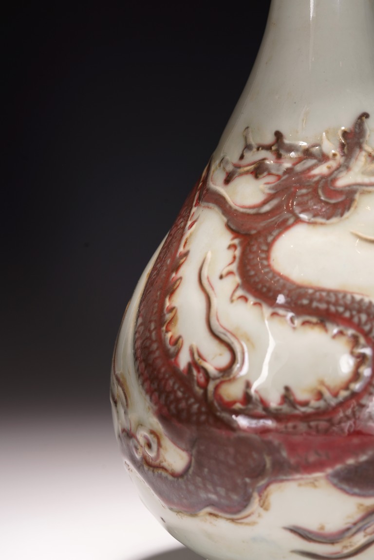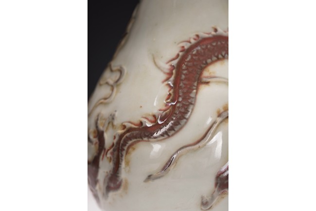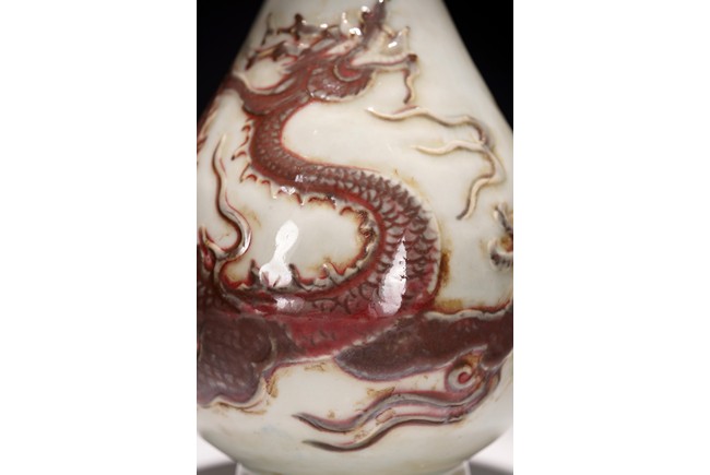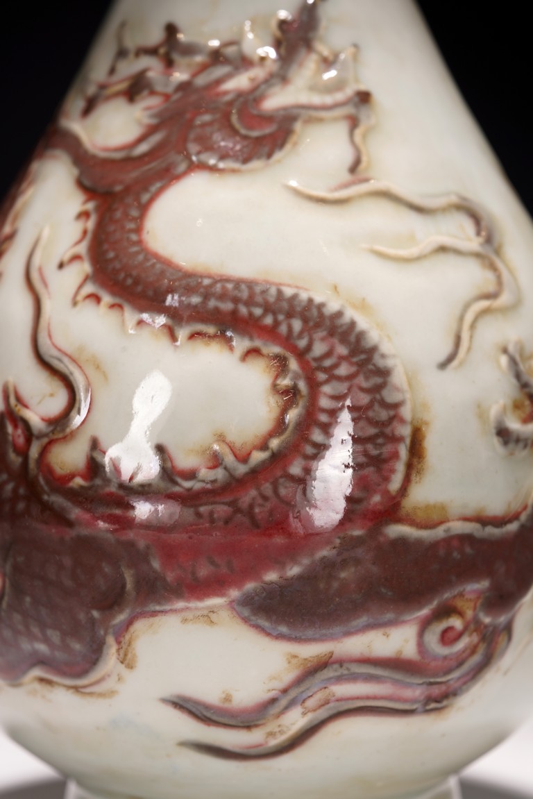 The pear shaped body carved in shallow relief with red glazed dragon.