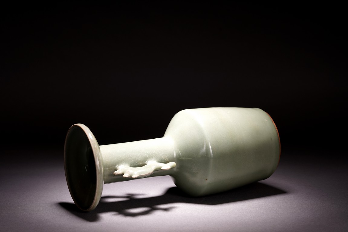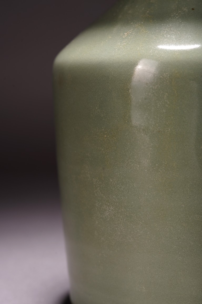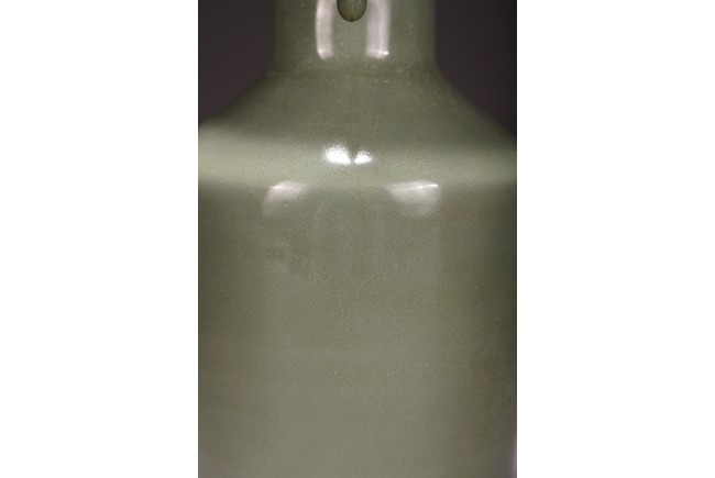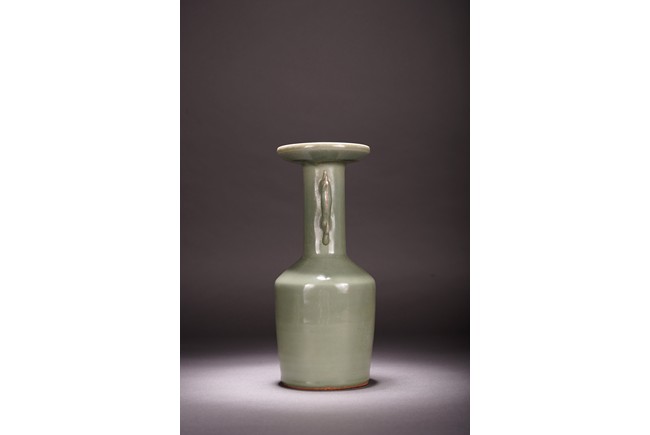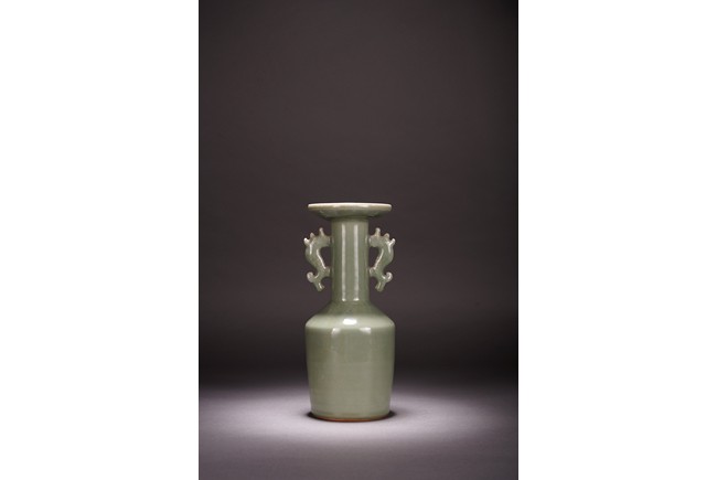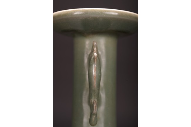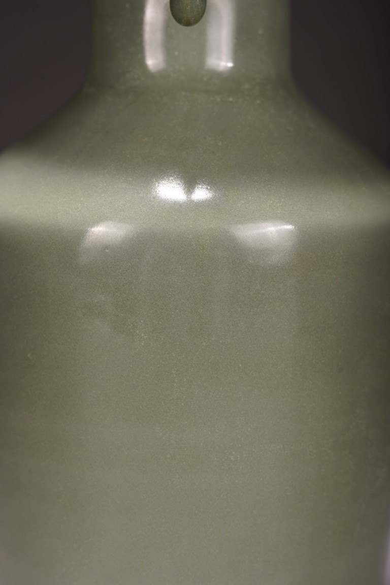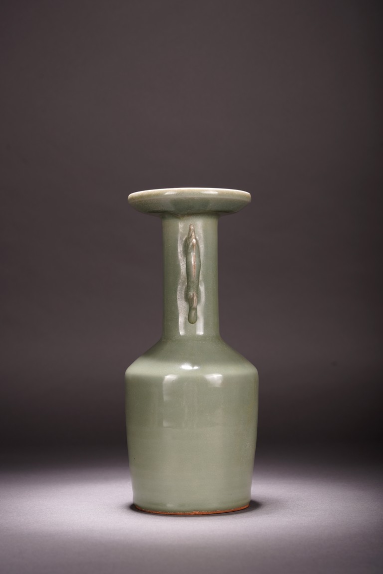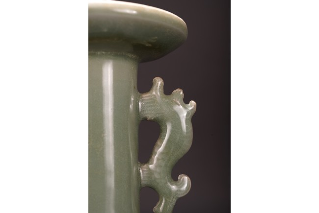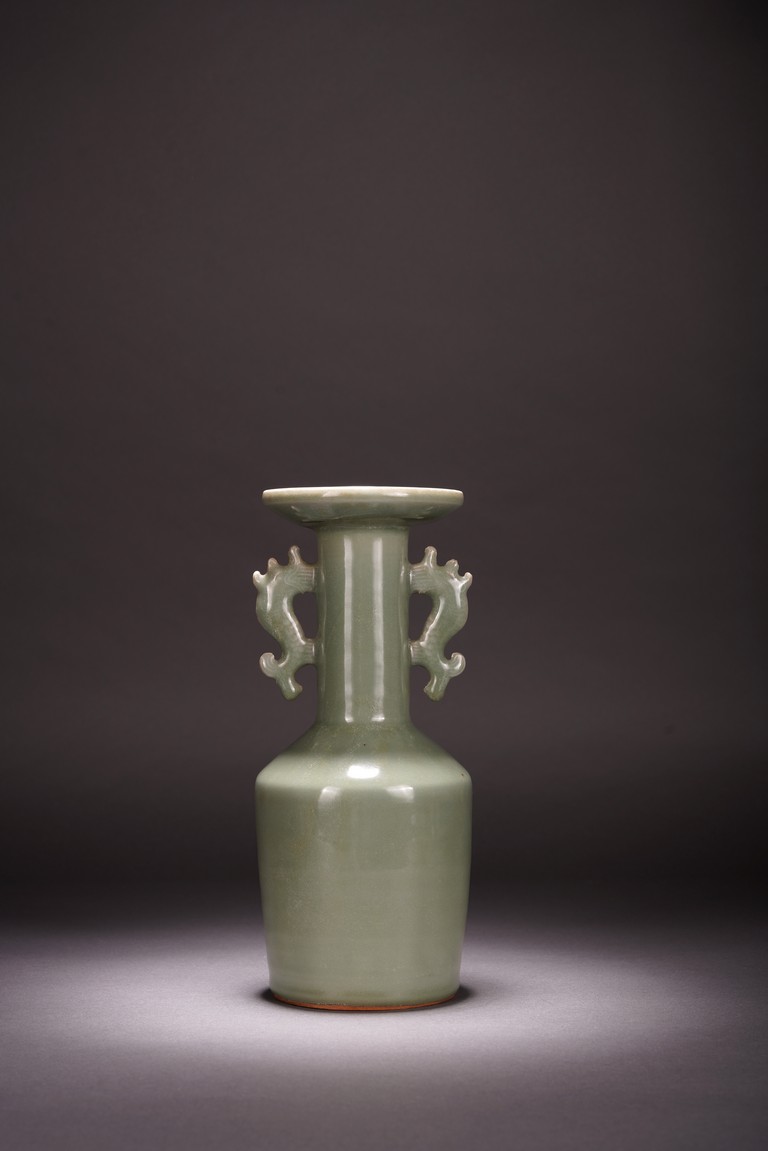Ming Dynasty period. The vase is robustly potted with a mallet-shaped body with angular, sloping shoulders, rising to a tall neck flanked by a pair of handles in the form of dragon-headed fish, below the widely flared, dish-shaped mouth. The vase is covered overall with glaze of celadon green color, leaving the foot ring unglazed.
