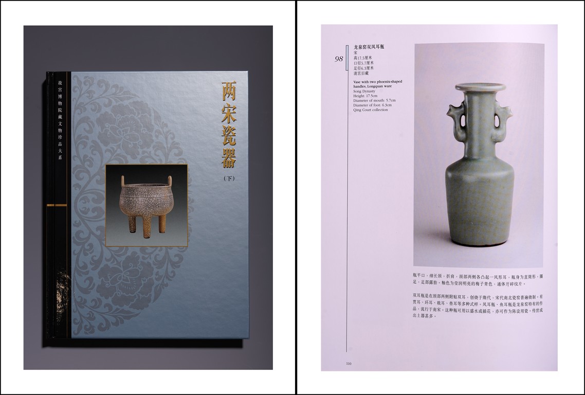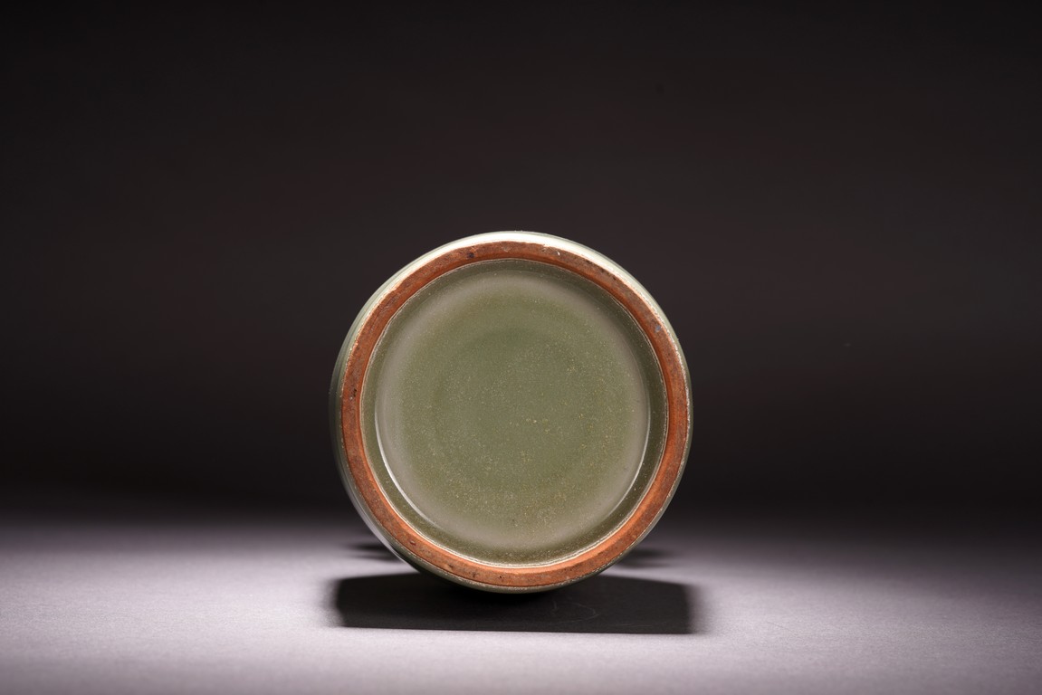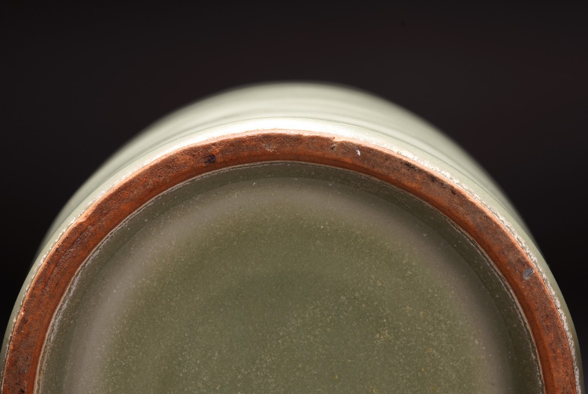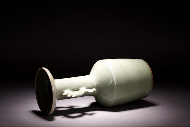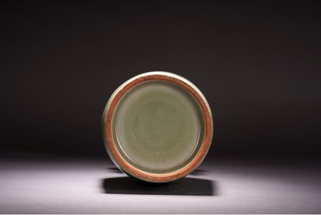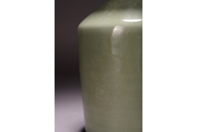 此瓶盤口、長頸、折肩、直筒腹、淺圈足。外施青釉,胎骨稍厚,頸部兩側置摩羯耳,足沿呈赭色。器形端莊,釉色素美,時代特徵明顯。