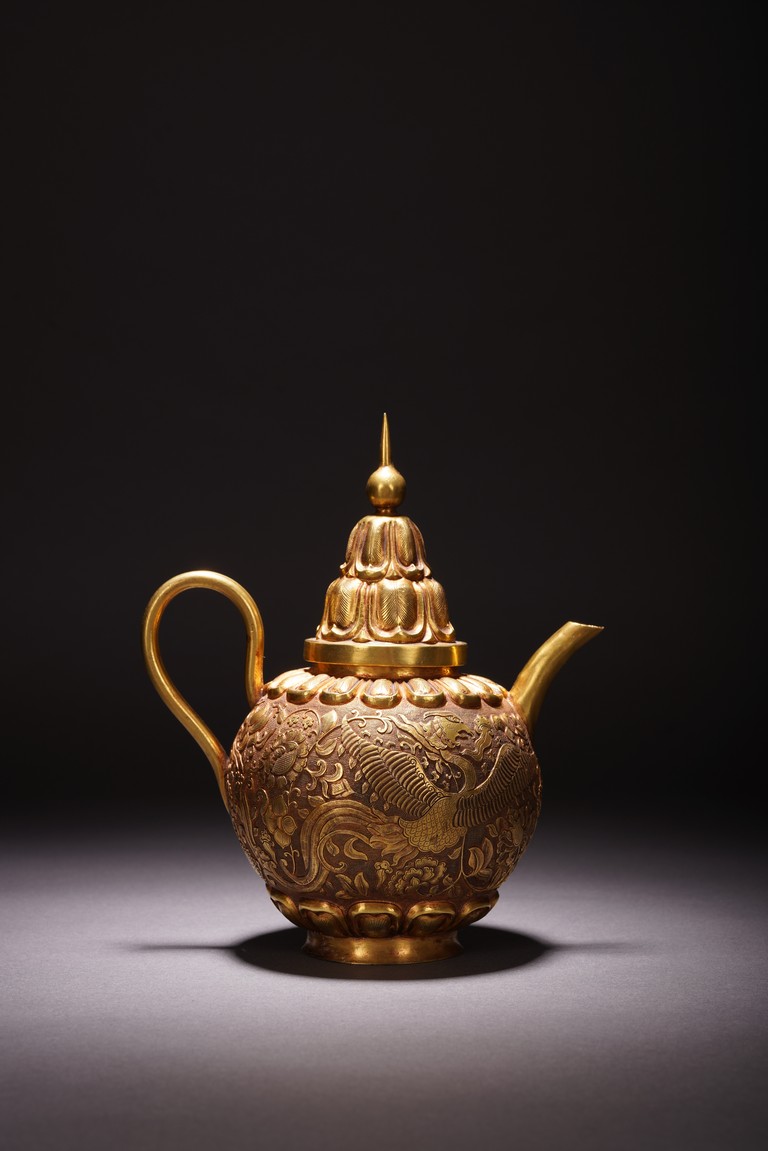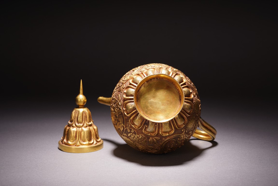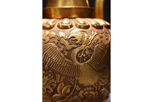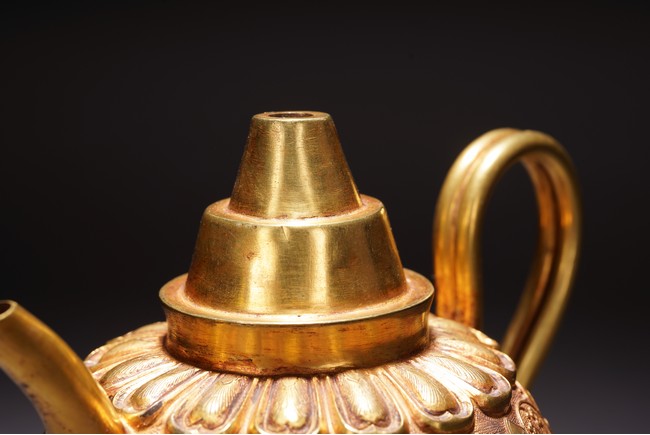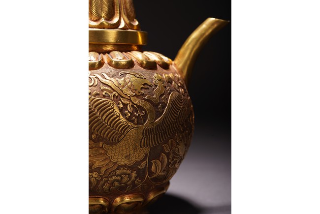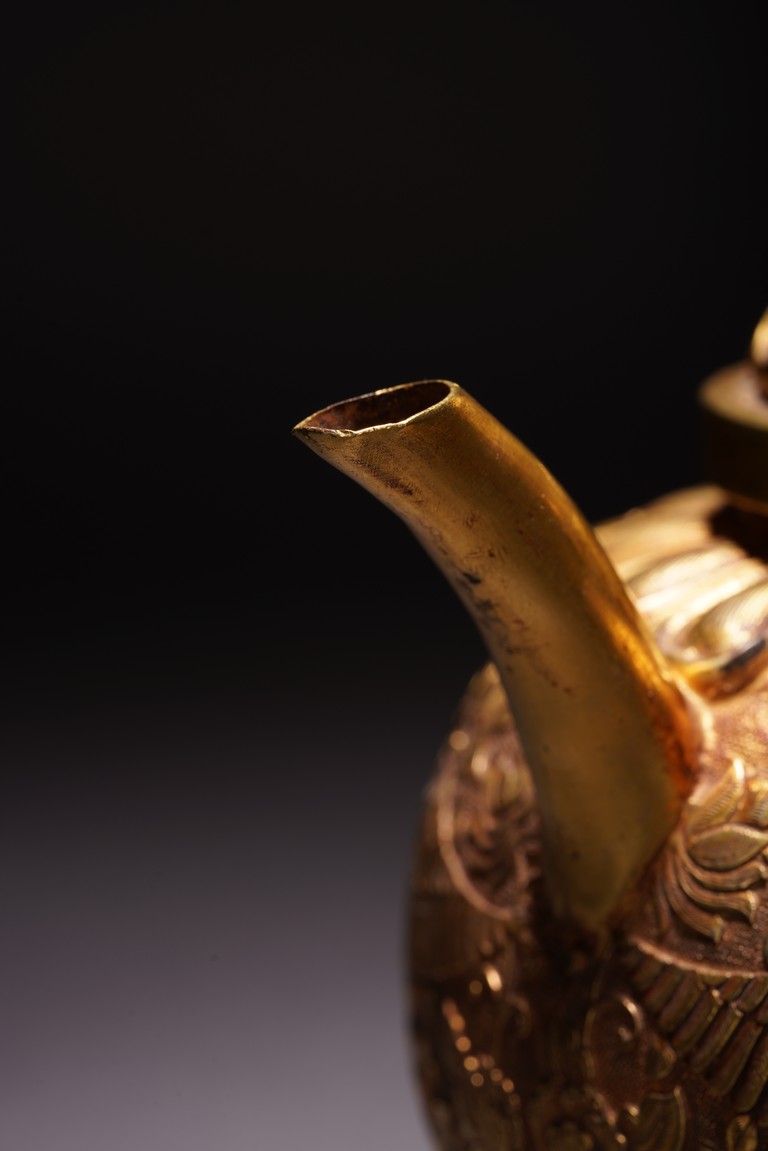 此執壺以銅為材,通體鎏金,壺蓋為雙層覆蓮紋,上頂寶珠。肩部及足脛處各飾蓮瓣紋,肩兩側雙飾細流、曲把,腹部採用鏨刻工藝滿刻穿花鳳紋飾。工藝精湛,線條流暢,器形優美,製作精良,難得的茶酒器,值得收藏。