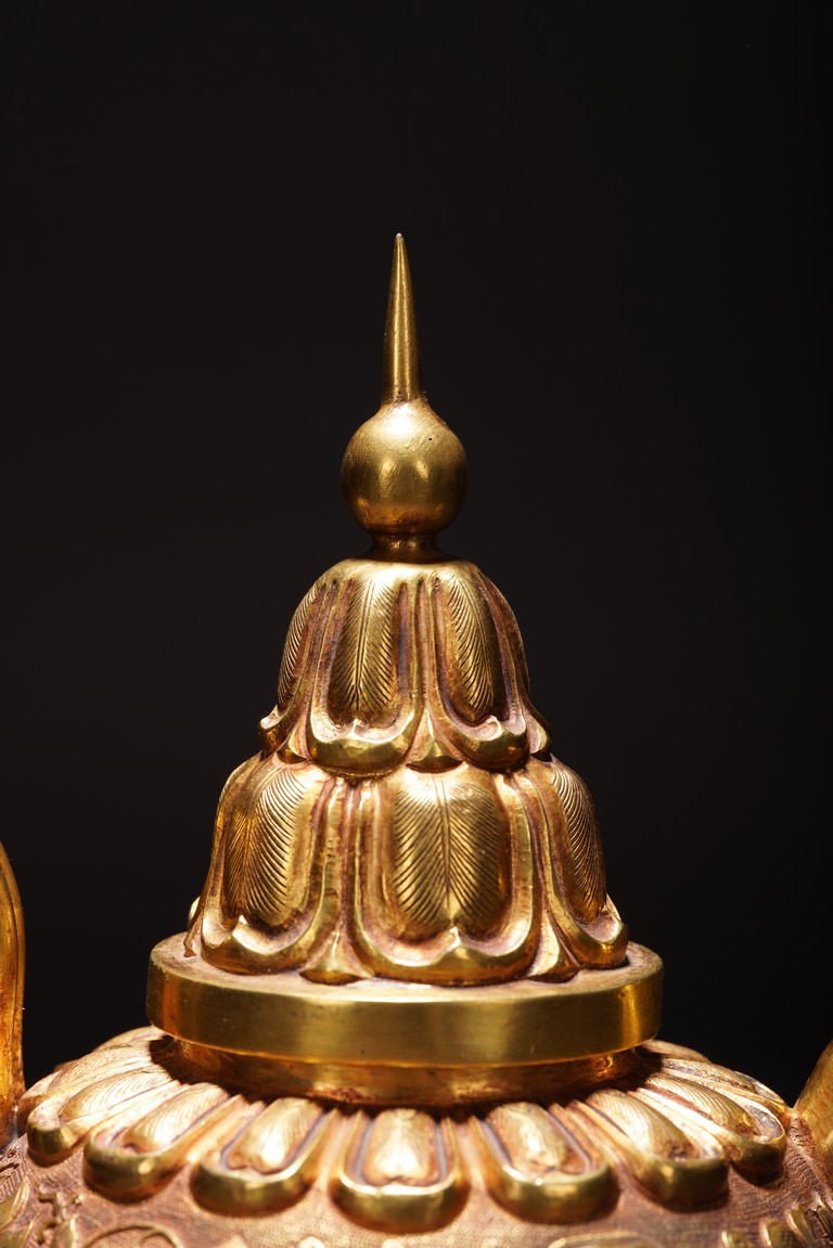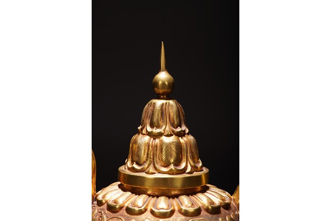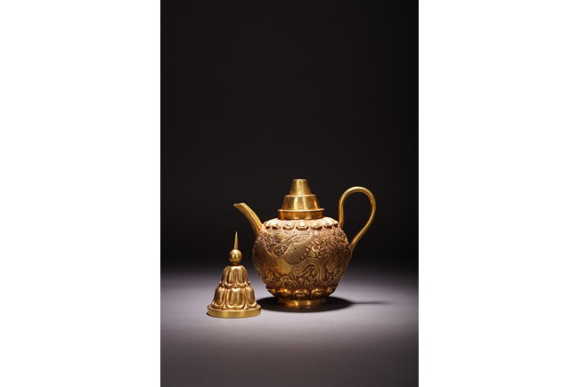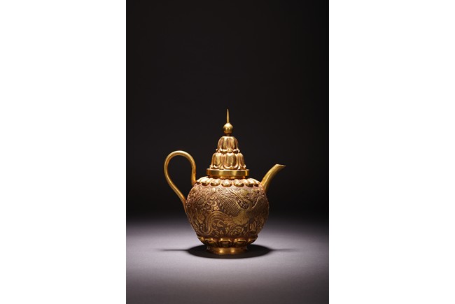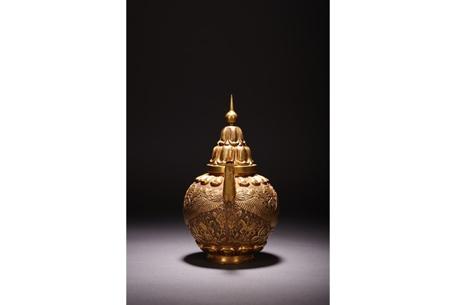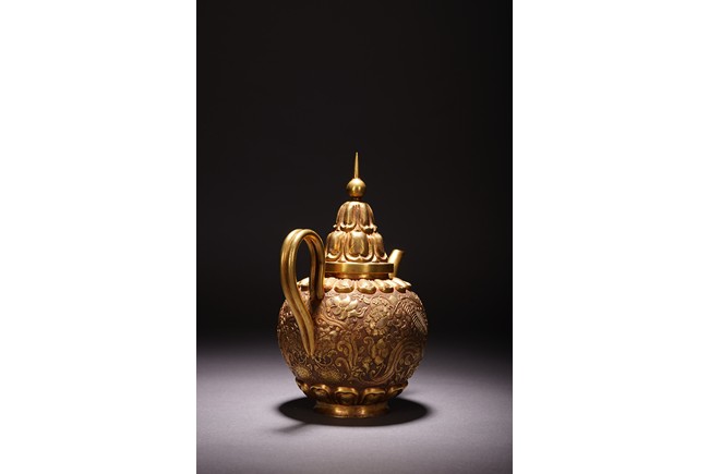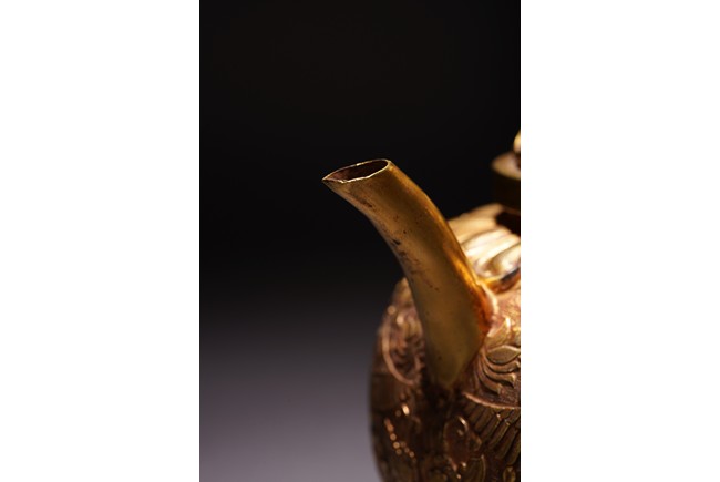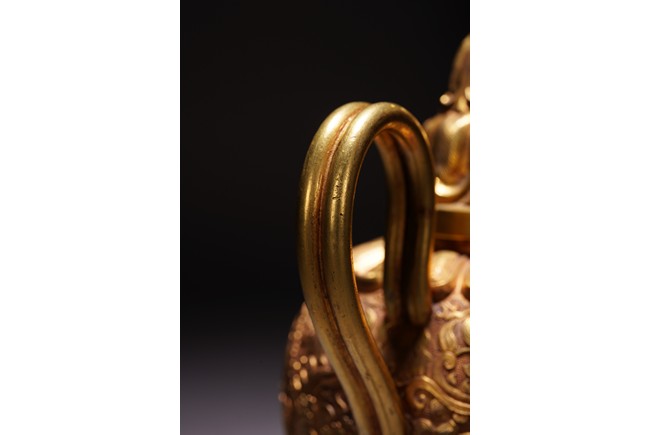此執壺以銅為材,通體鎏金,壺蓋為雙層覆蓮紋,上頂寶珠。肩部及足脛處各飾蓮瓣紋,肩兩側雙飾細流、曲把,腹部採用鏨刻工藝滿刻穿花鳳紋飾。工藝精湛,線條流暢,器形優美,製作精良,難得的茶酒器,值得收藏。
