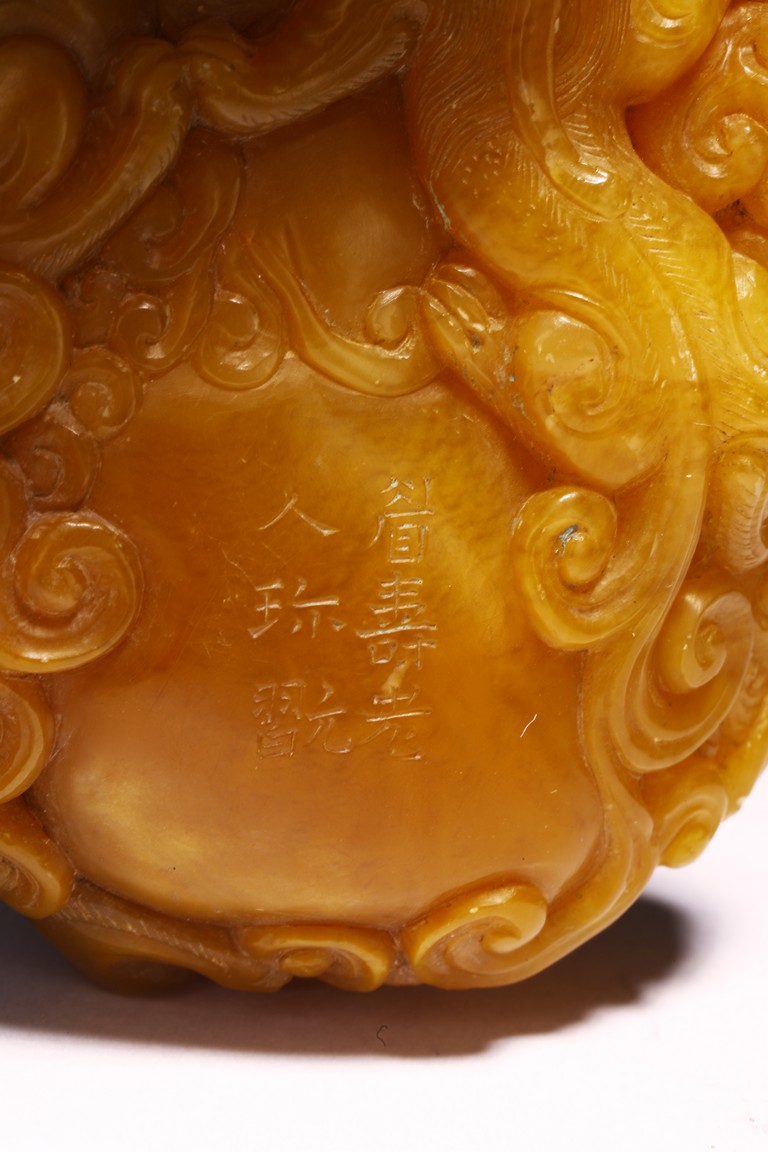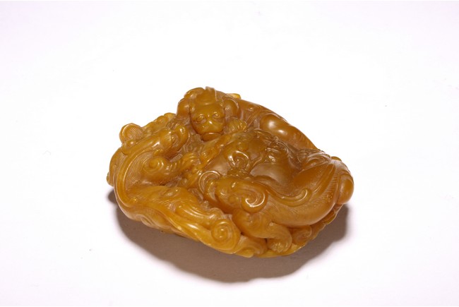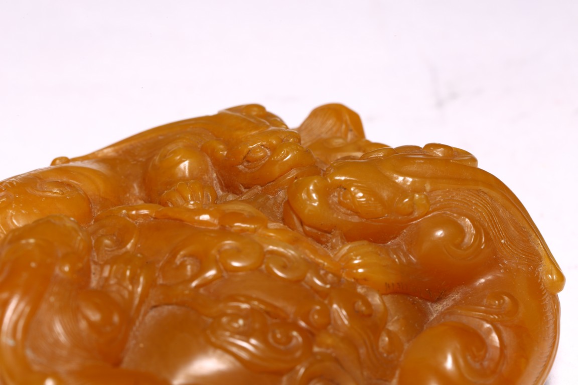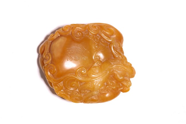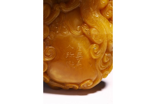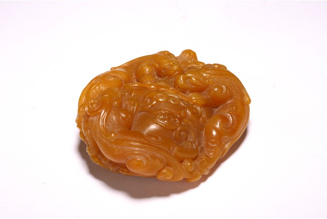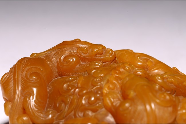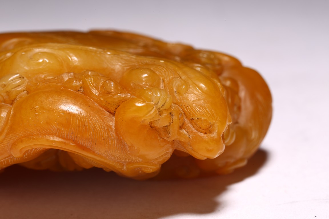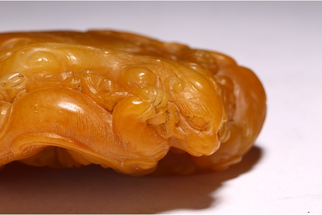 質地凝結純凈,色澤古雅飽滿,色澤呈明麗的橘黃色,蘿卜絲紋清晰可見。浮雕三瑞獸,比例勻稱協調,造型渾樸,線條圓潤,栩栩如生,作交織纏繞嬉戲狀,顧盼留連、神態各異,肌骨豐腴圓潤,充滿了勃勃生機。