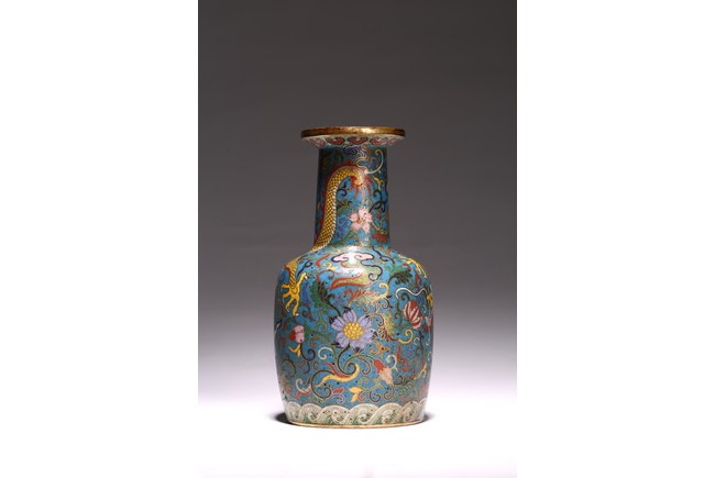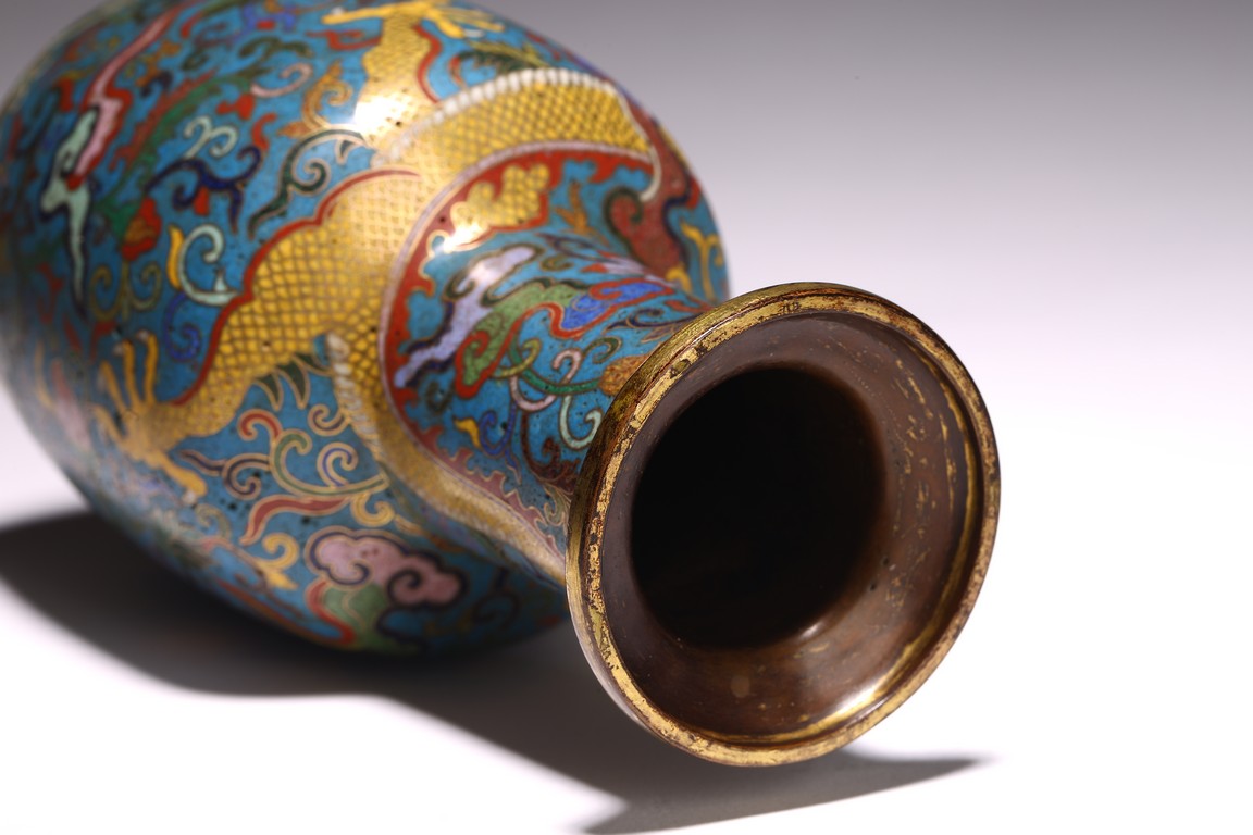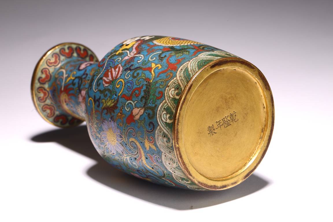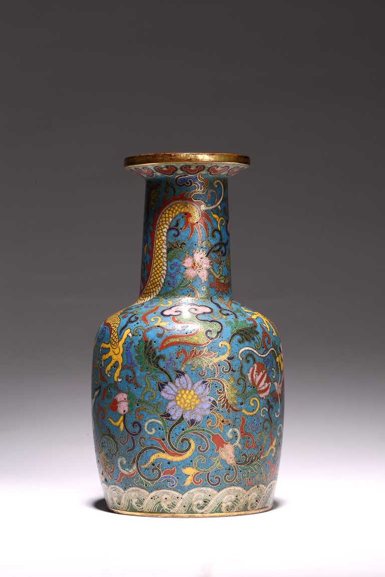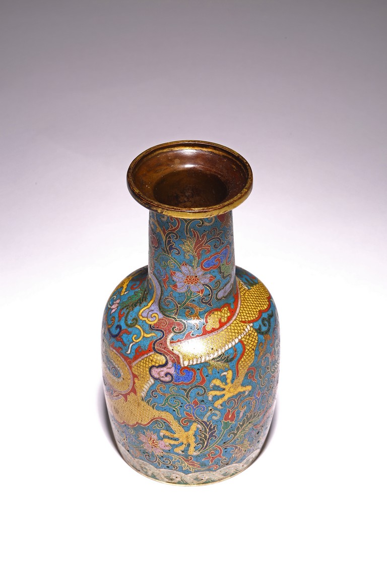 口外侈,束頸,溜肩,直筒形腹。此器主體以天藍色琺瑯釉為地,紋飾分別以紅、寶藍、黃、豆綠、紫白相間等多種琺瑯色,交錯分佈,錯落有致,周身滿飾“雲龍紋”,氣勢威嚴。整體層次感強。整器釉色純正,色調搭配和諧,掐絲技法嫻熟,線條簡練流暢,圖案佈局疏密有致。 “乾隆年制”款識。 来源:洛杉磯私人藏家提供 Provenance: Property from a private collection, Los Angeles