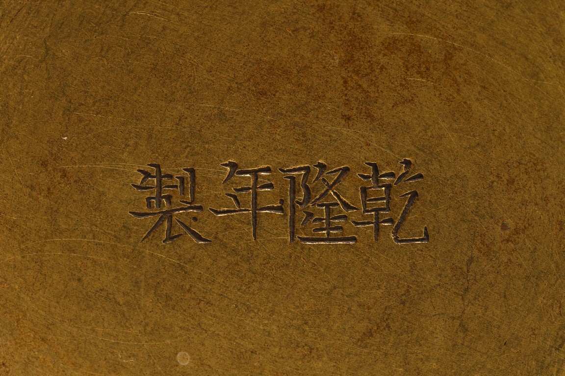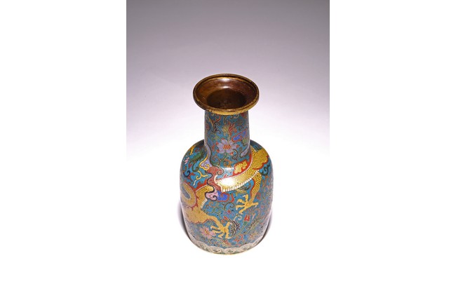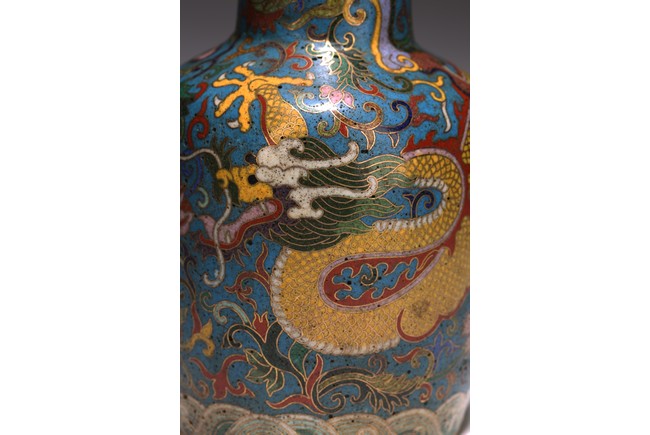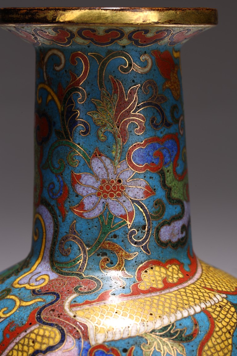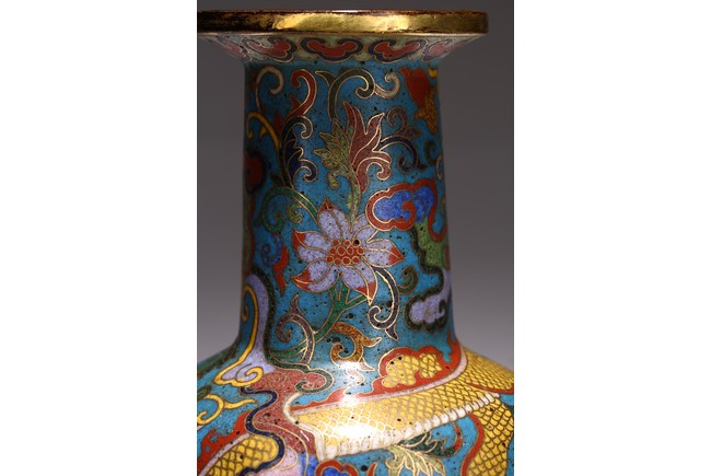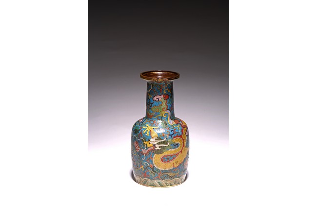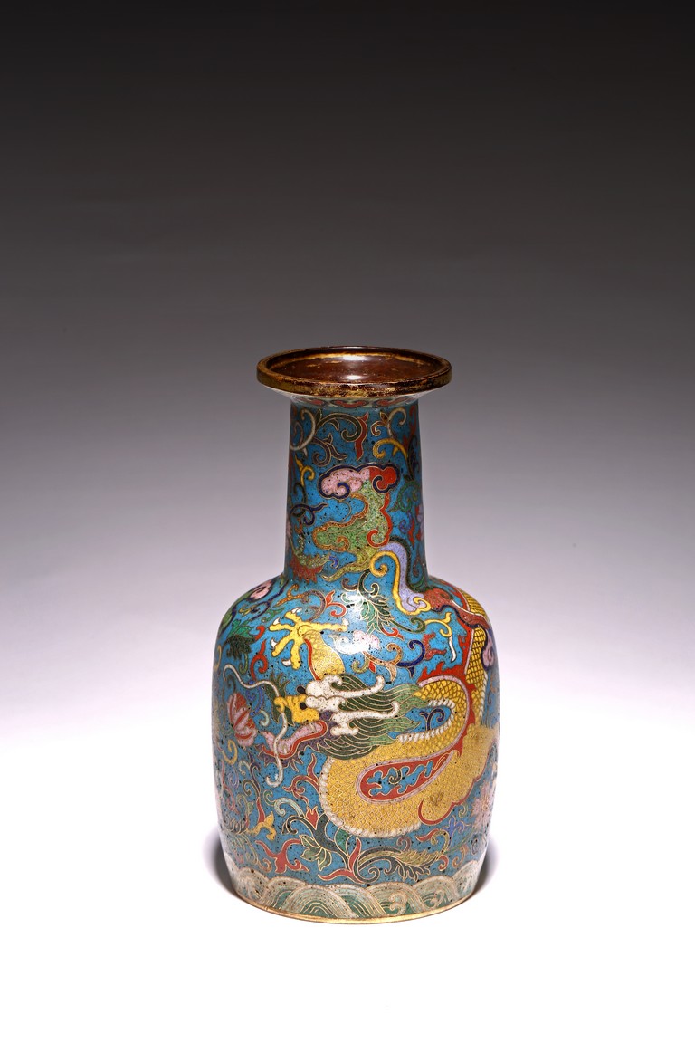 口外侈,束頸,溜肩,直筒形腹。此器主體以天藍色琺瑯釉為地,紋飾分別以紅、寶藍、黃、豆綠、紫白相間等多種琺瑯色,交錯分佈,錯落有致,周身滿飾“雲龍紋”,氣勢威嚴。整體層次感強。整器釉色純正,色調搭配和諧,掐絲技法嫻熟,線條簡練流暢,圖案佈局疏密有致。 “乾隆年制”款識。 来源:洛杉磯私人藏家提供 Provenance: Property from a private collection, Los Angeles