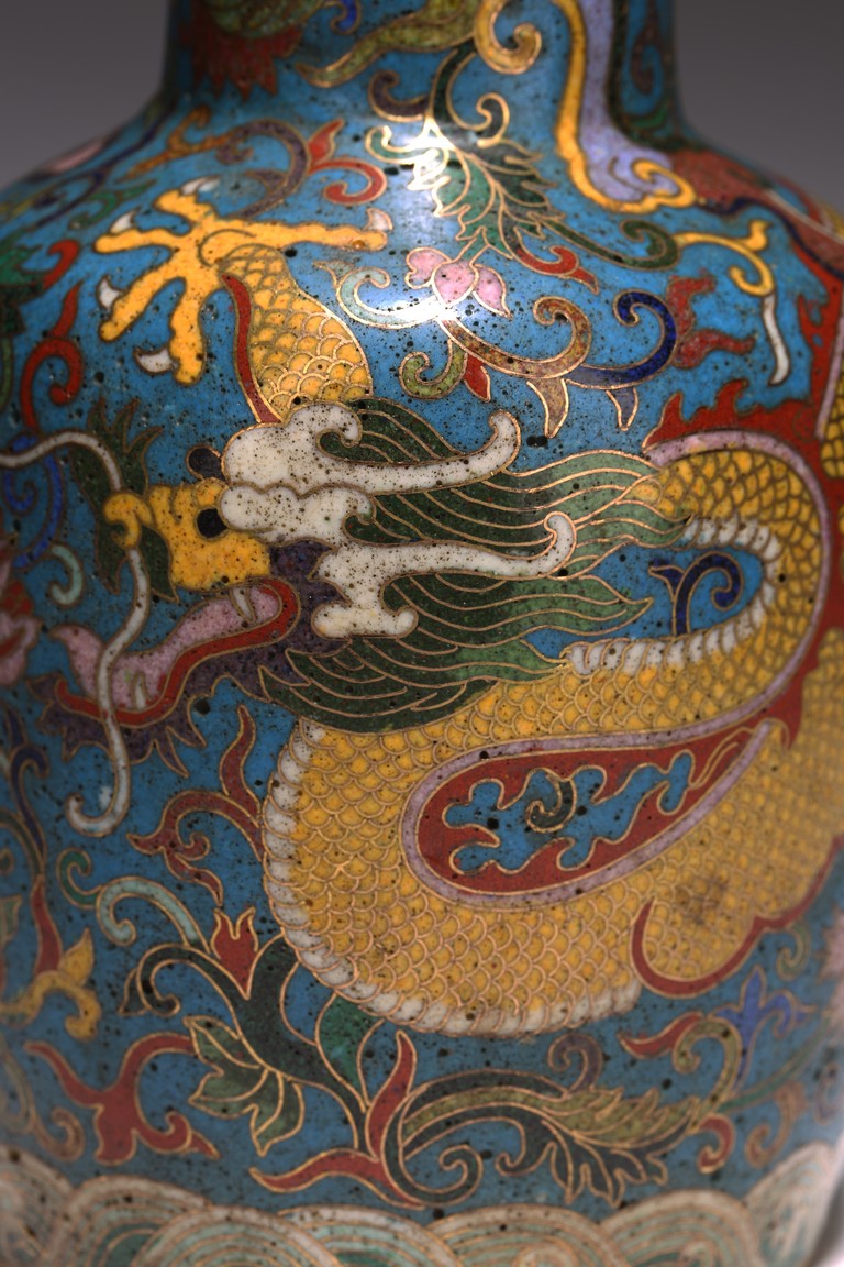 Qing Dynasty period. The vase is finely enamelled with various tones to depict a continuous scene of dragon traveling through meandering floral scrolls reserved on turquoise ground above a band of turbulent waves around the base, the mouth rim and base gilted bearing a four character reign mark.