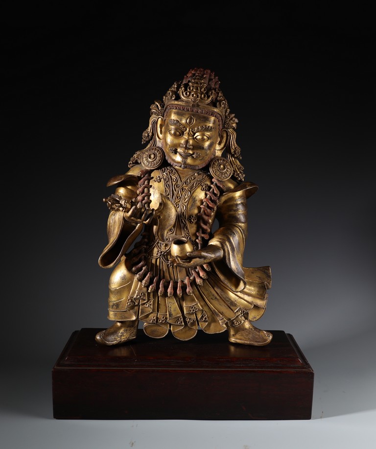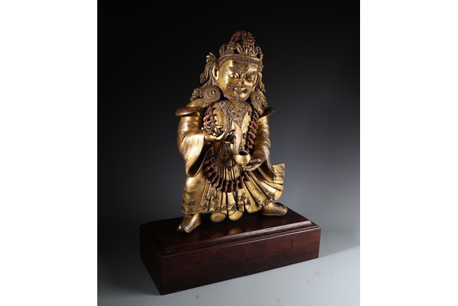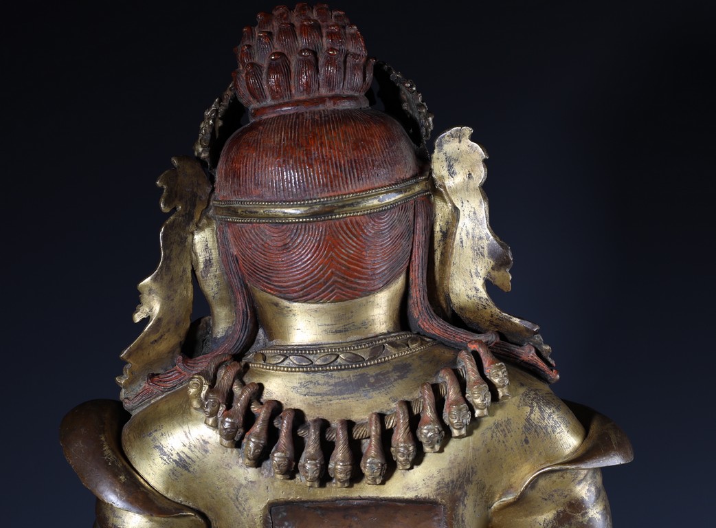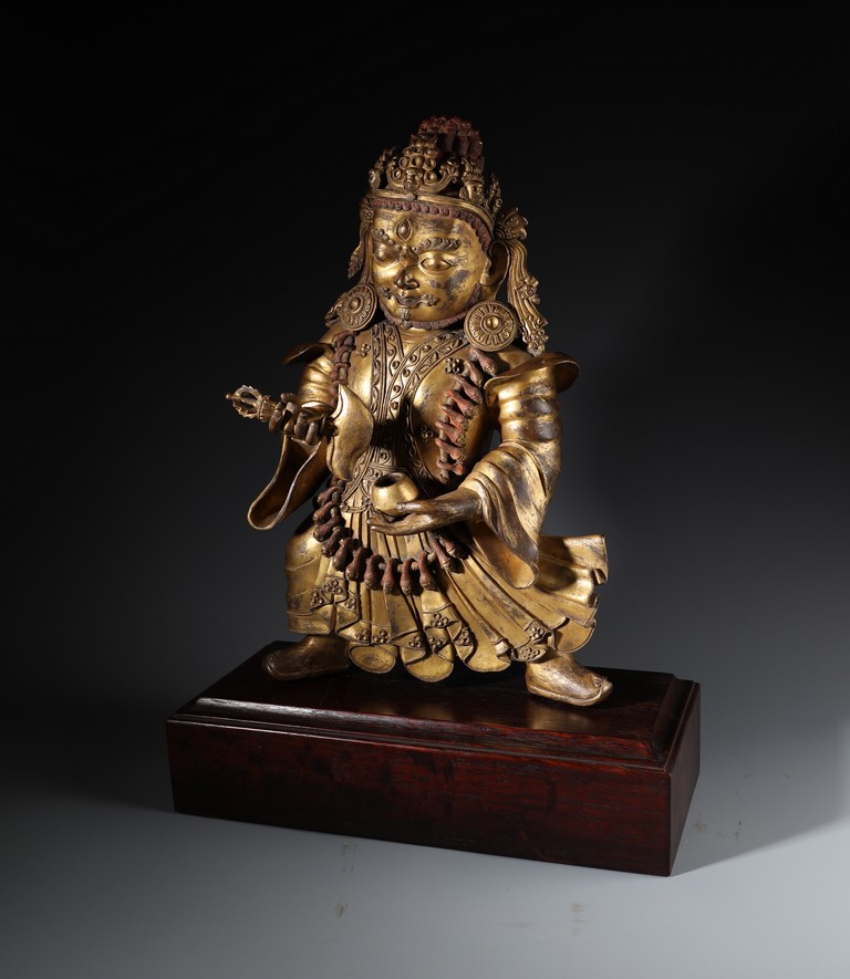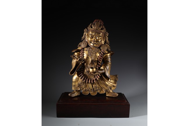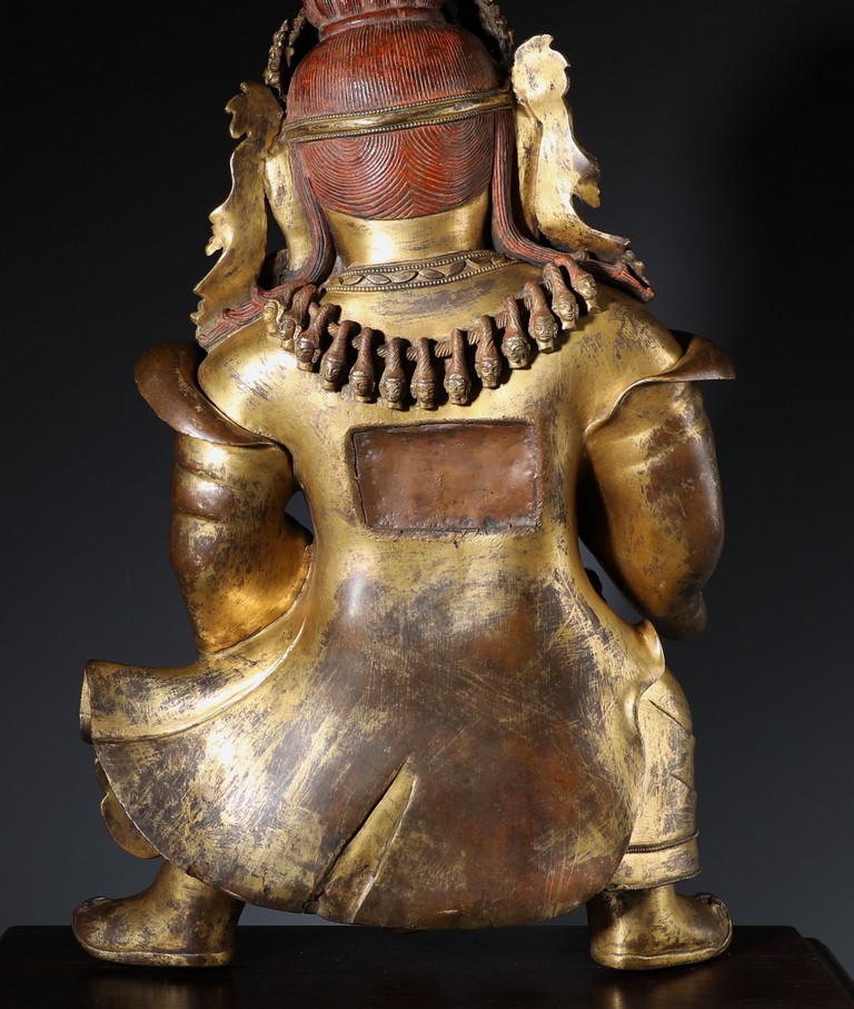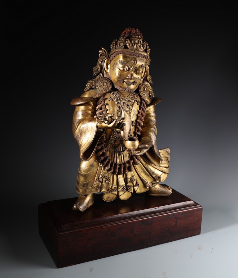 Qing Dynasty period. Standing on wood base, holding a chopper in his right hand and a cup in his left, wearing multiple necklaces and a garland of heads, his wrathful expression with bared fangs and bulging eyes, centered by third eye, topped by a skull crown behind which the flaming red hair is drawn into a high chignon.