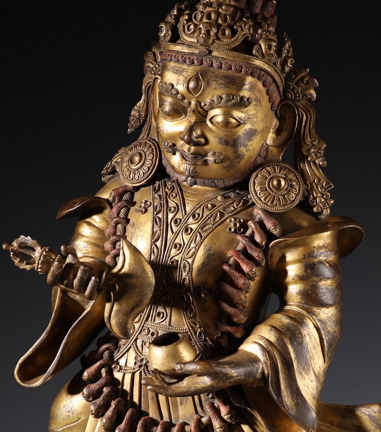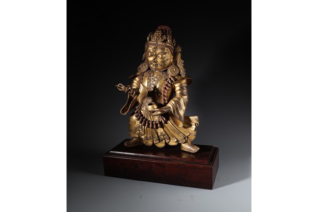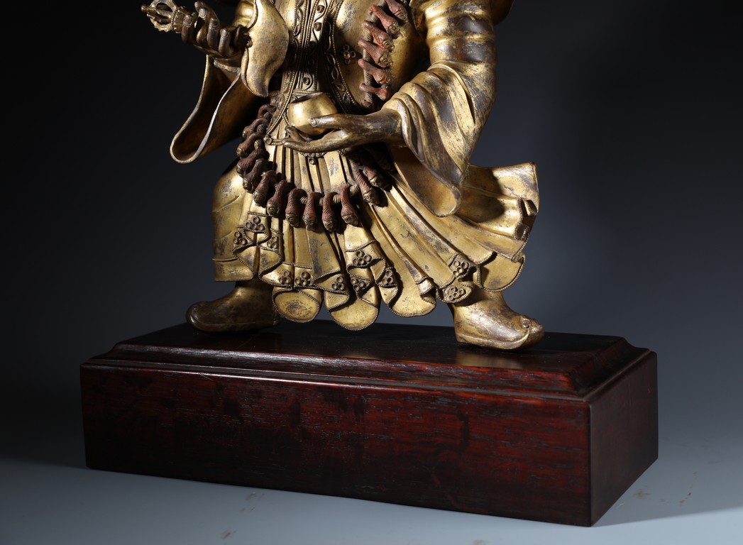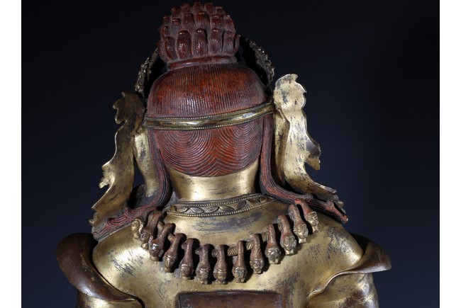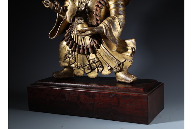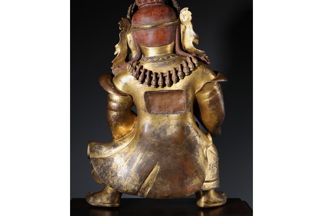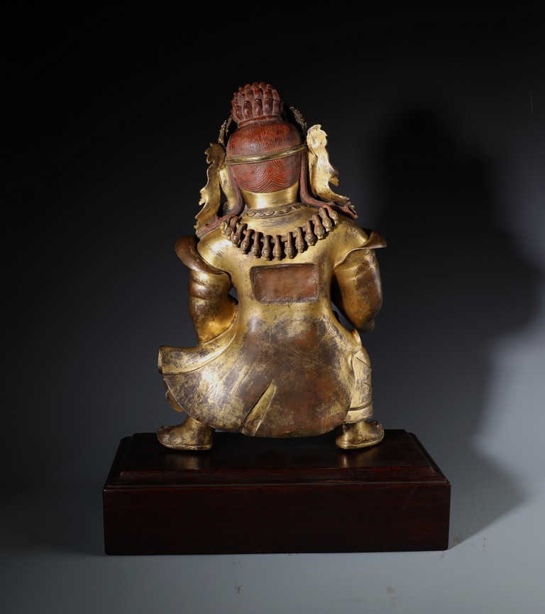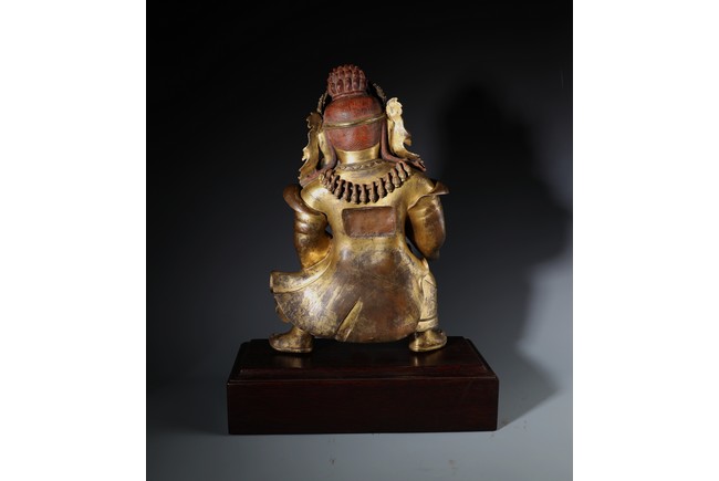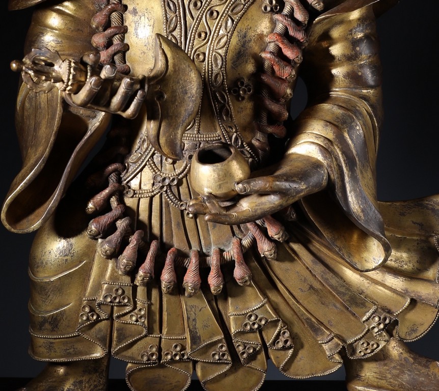 Qing Dynasty period. Standing on wood base, holding a chopper in his right hand and a cup in his left, wearing multiple necklaces and a garland of heads, his wrathful expression with bared fangs and bulging eyes, centered by third eye, topped by a skull crown behind which the flaming red hair is drawn into a high chignon.