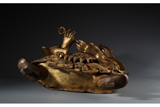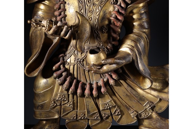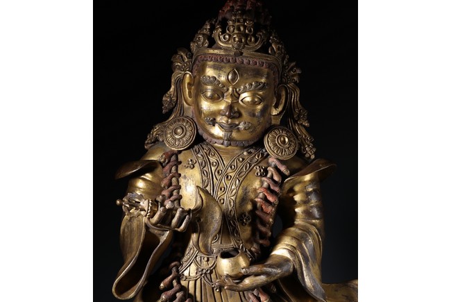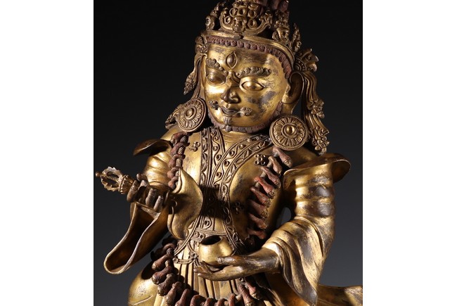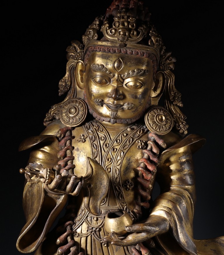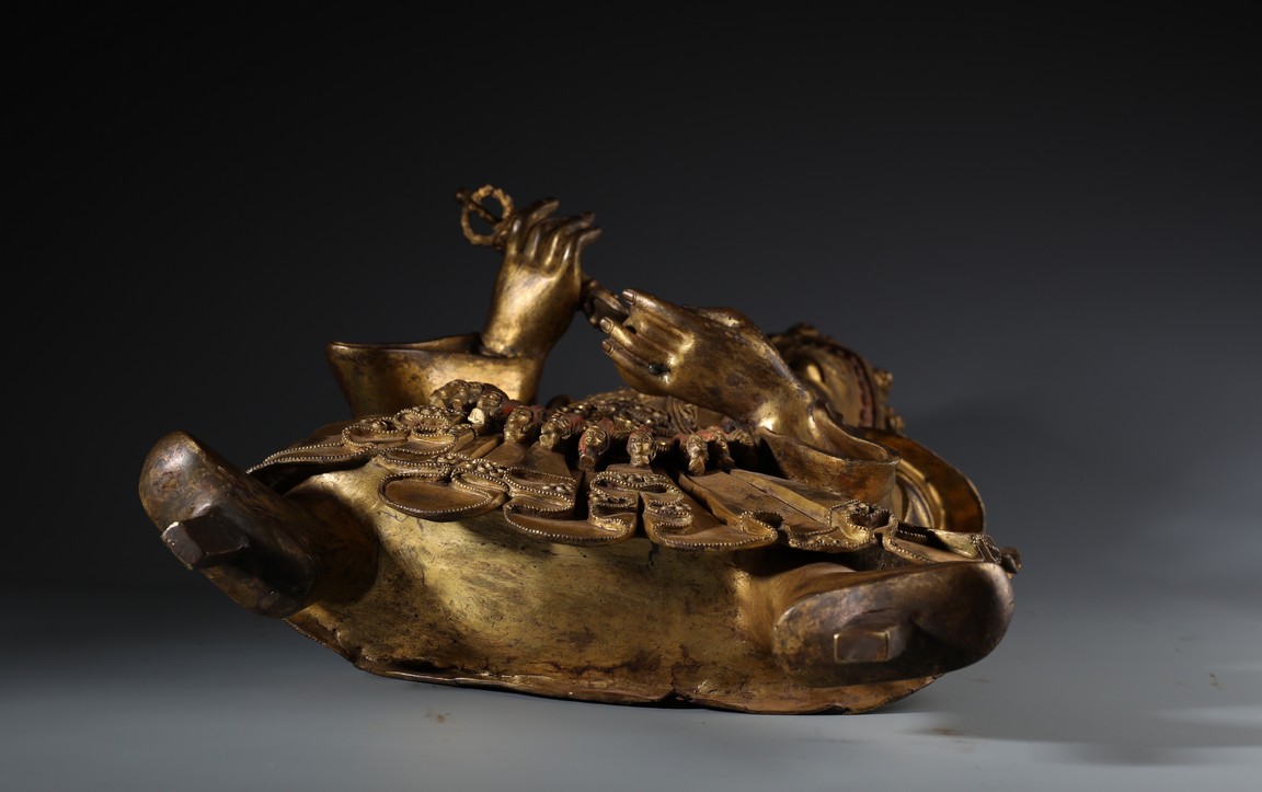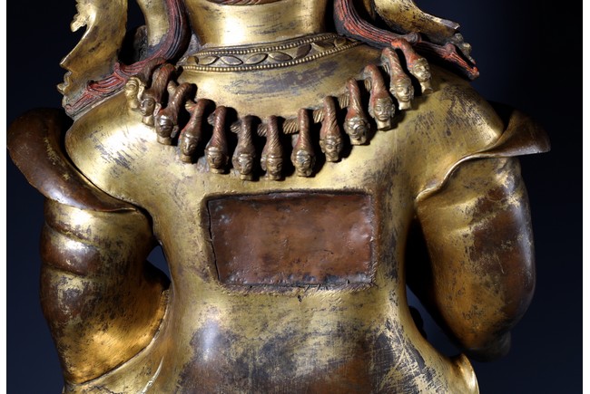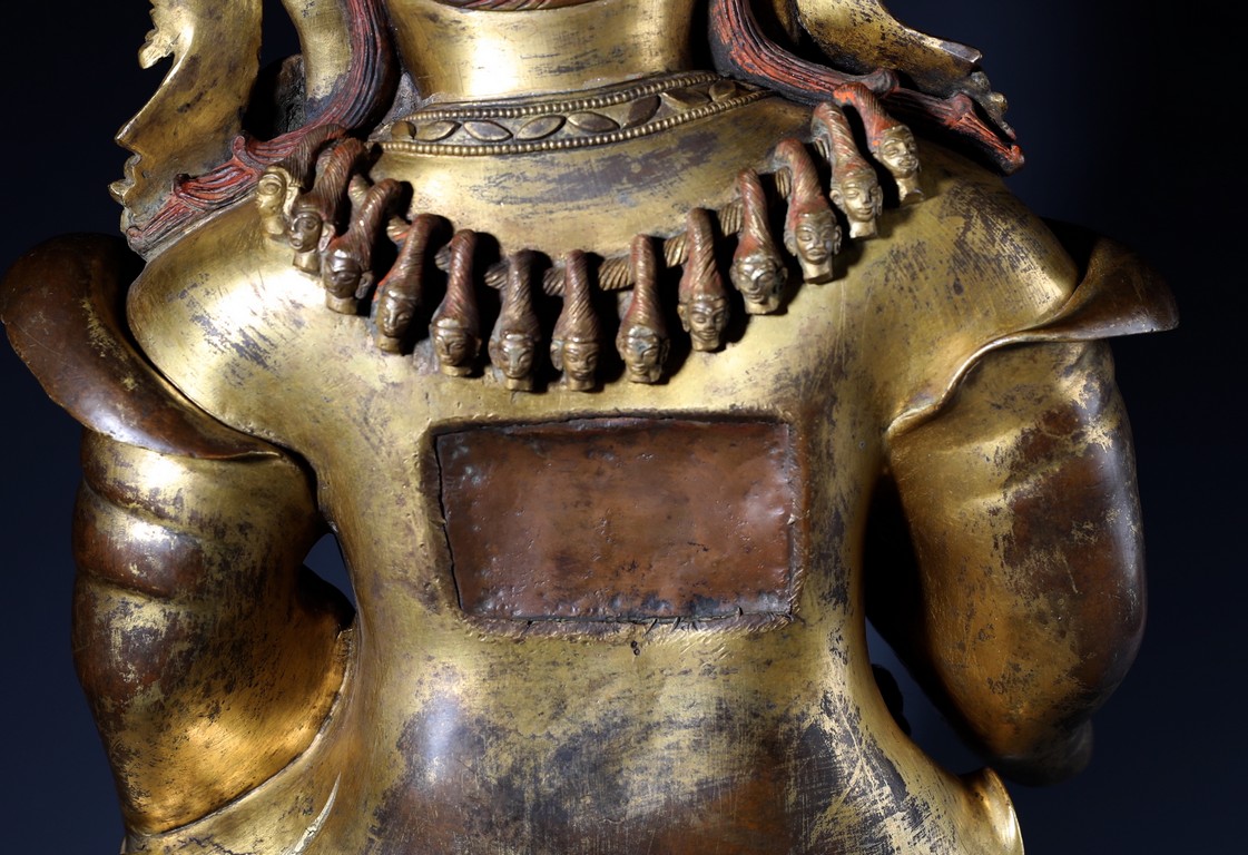 瑪哈嘎拉是梵語,意思是“大黑”,即“怙主”之意。瑪哈嘎拉是佛教三根本的化身。為調伏剛強眾生而呈現忿怒相.依緣起多示現為兩臂、四臂、六臂,黑,白等形象,為藏傳佛教諸宗共同推崇的智慧護法,此件二臂瑪哈嘎拉是普賢王如來及金剛持佛之忿怒化身。頭戴五骷髏冠,怒髮上豎,三目圓睜,張口呲牙,面相兇憤。上身袒露,下身圍虎皮裙,並飾以繁複瓔珞為裙,雙肩披大帔帛,帔帛在頭後形成橢圓形。兩手置於胸前,左手托骷髏碗,右手持鉞刀。雙腿站立,兩膝向外彎曲。依據經文記載,敬奉此吉祥立姿二臂大黑天,得國泰民安,風調雨順,四境平和無紛爭,破除邪祟,諸事順遂,法財圓滿之大利益。