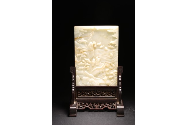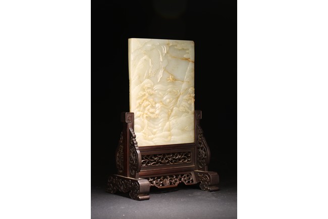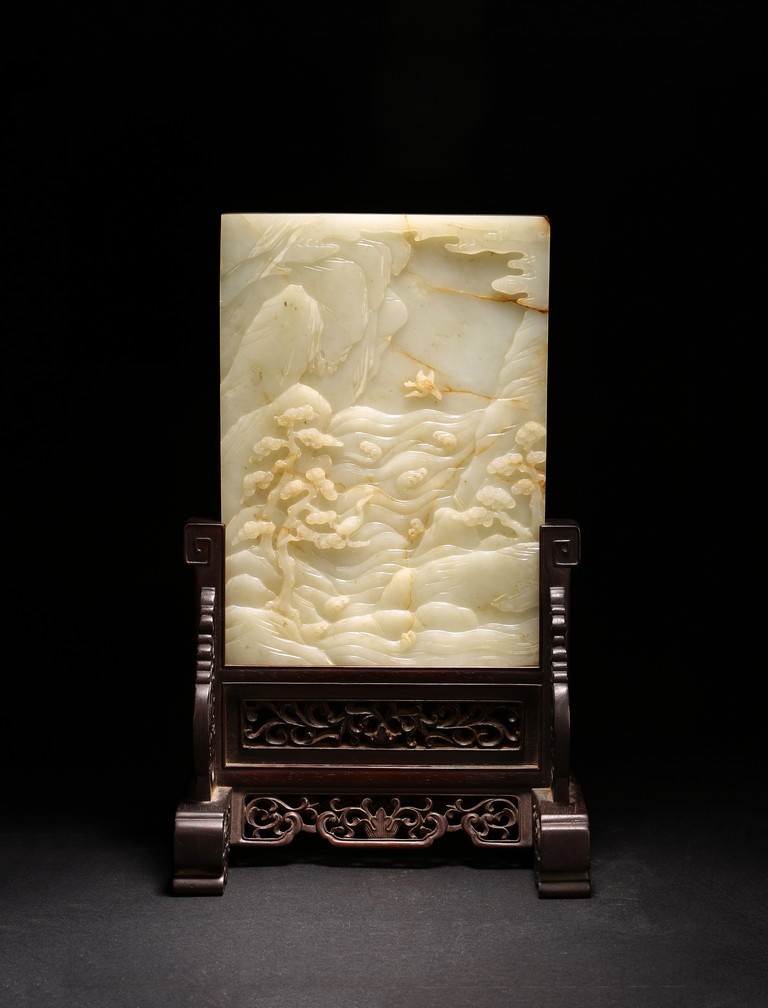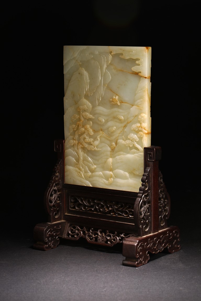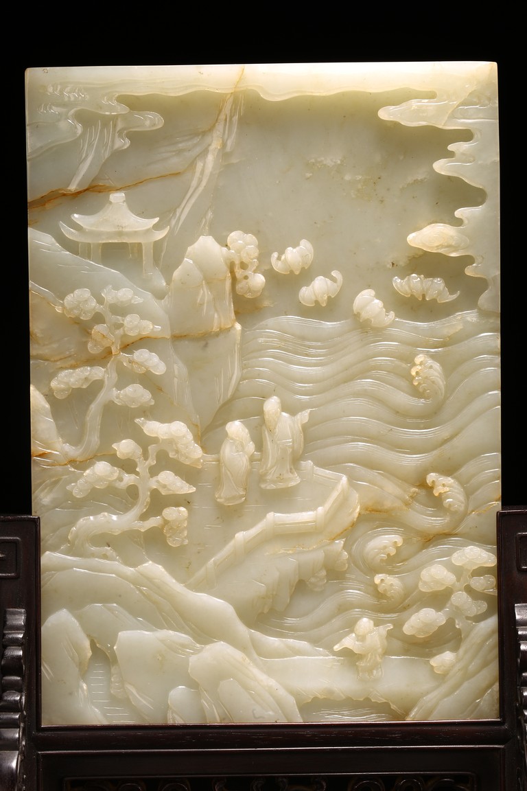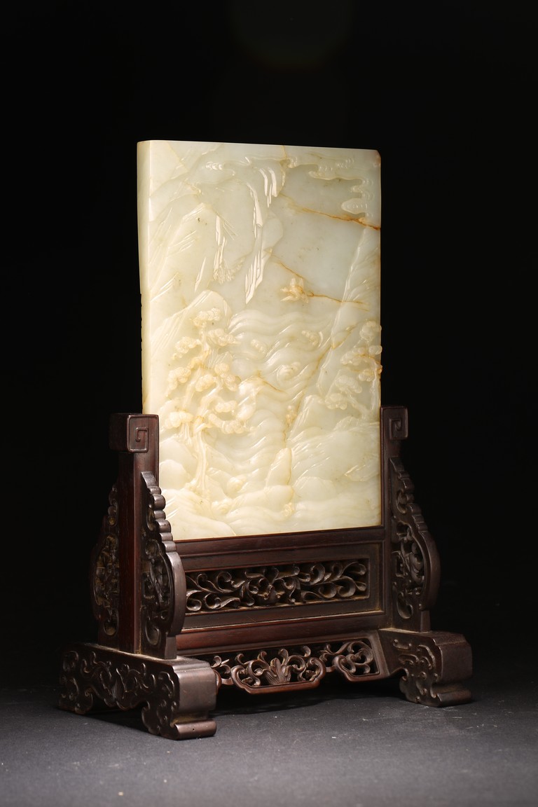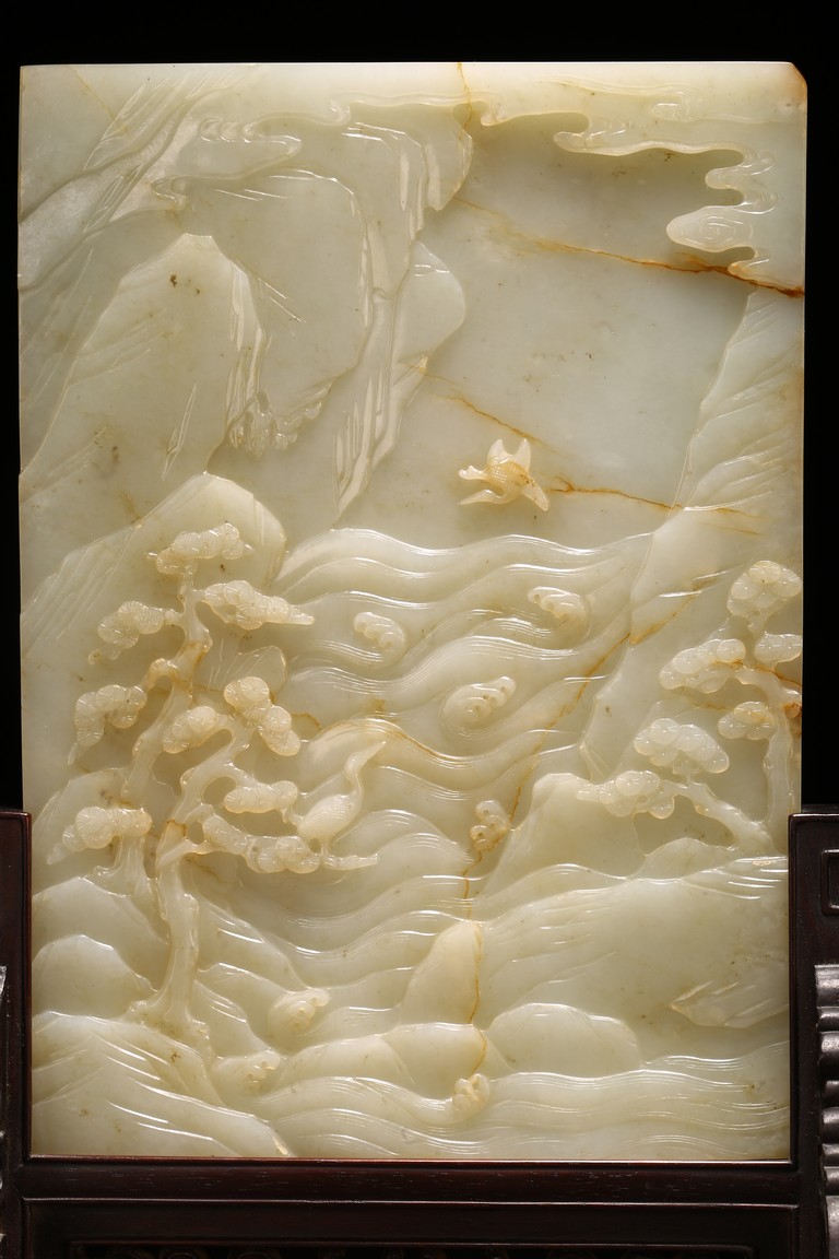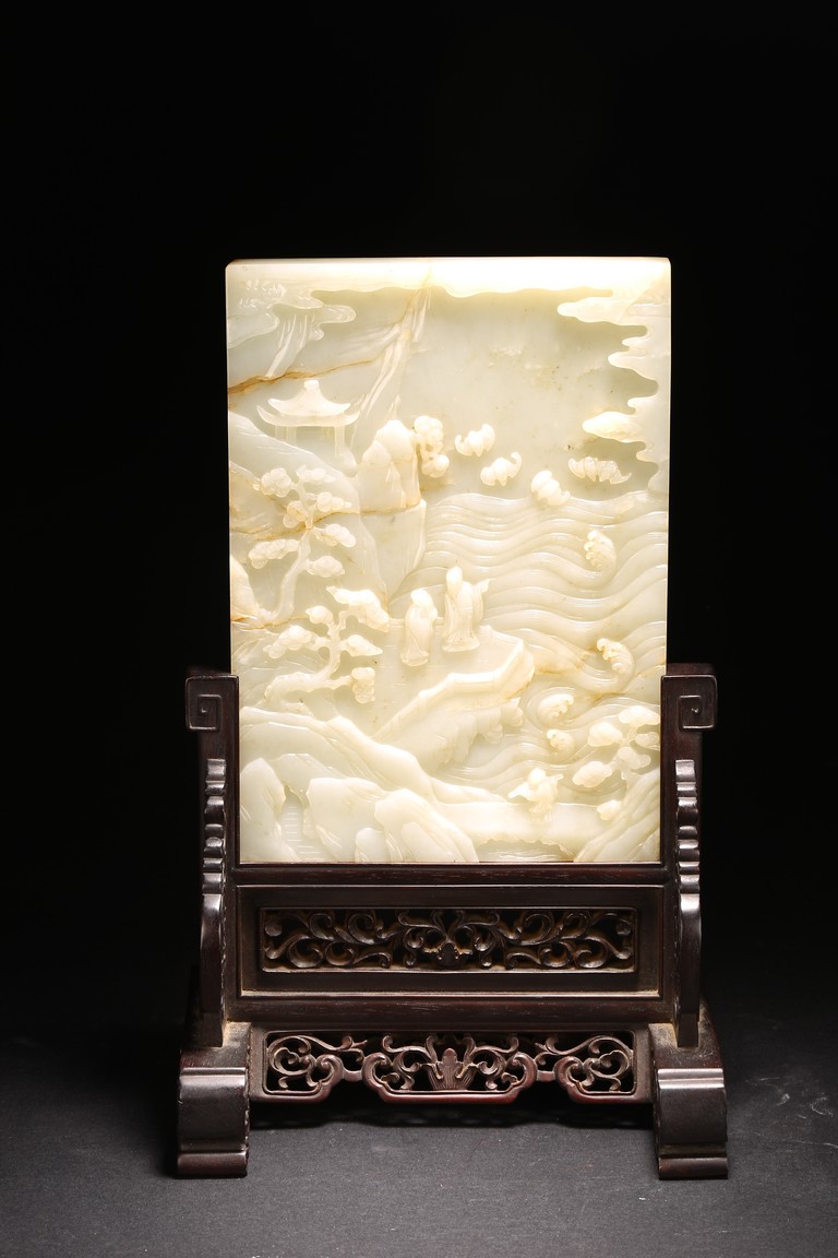 此插屏為長方形,下承木座,屏面以白玉製成,玉質潤而膩,緻密溫潤,色澤瑩亮,雙面均有雕工。器形周正巧妙,做工細膩精緻,插屏一面剔雕山水人物圖景,佈局嚴謹而有法度,工整莊重,一派皇家氣度。另一面則表現“松鶴延年紋”,刀工細膩,刻畫清晰,疏落有致,自然清新。正面刻山水人物畫面寧靜優美,岩石挺拔嶙峋,松樹枝幹彎曲遒勁,枝葉繁茂,蔚然成峰; 溪水淙淙,祥雲遊蕩,山巒起伏、古松參天、亭台樓閣、蝙蝠飛舞,不僅表現了山林洞府間的靜謐恬淡,而且展示了兩位長者立於松濤之下,山石面前,慈眉善目,鶴髮童顏。反面仙鶴徜徉於靈秀山水之中,整體畫面彷彿置身仙境,美輪美奐,使人陶醉,不僅雕工細膩豐富, 圖案優美、栩栩如生,更難能可貴的是讓人深感喜慶祥瑞的氣氛。該器線條靈動活潑,佈局得當,緊密有度,使畫面頗具立體感,層次分明,色彩豐富,造型規矩,端莊大方,穩重典雅,雕工嫻熟,山石人物的塑造均自然流暢,風貌古雅,取材獨特,造型奇巧玲瓏,展示出清代雕刻工藝的繁榮,實為不可多得的一件經典佳作。