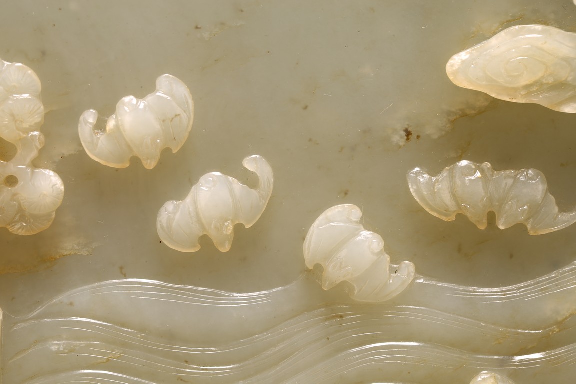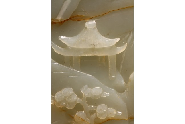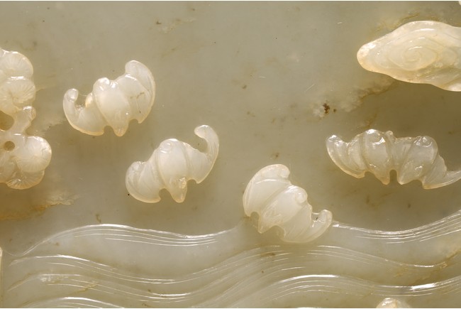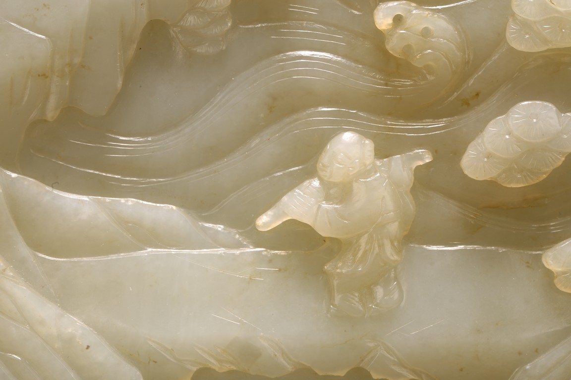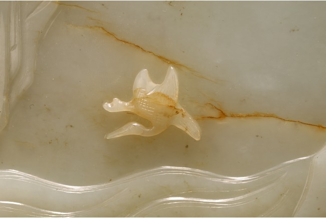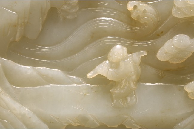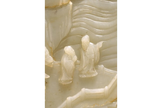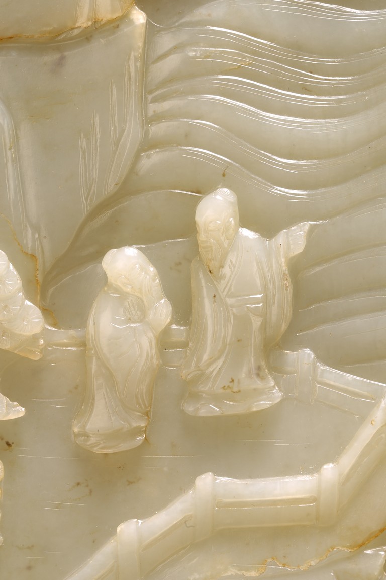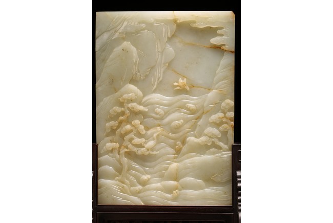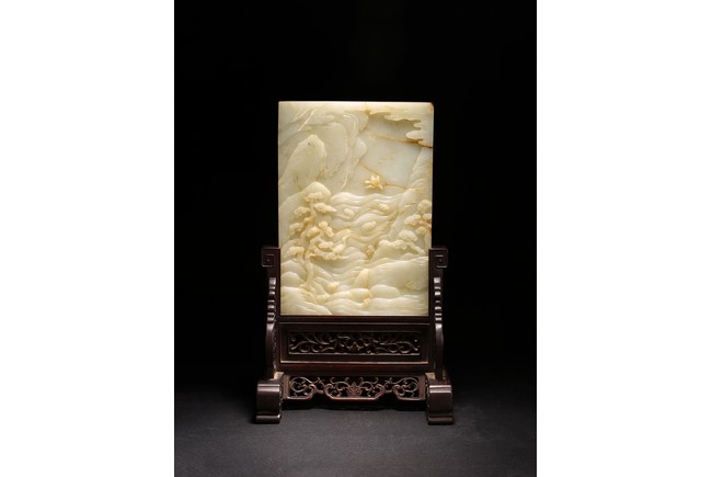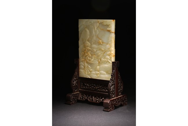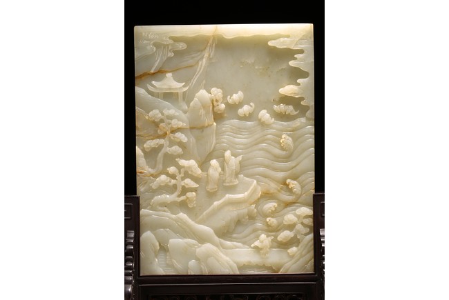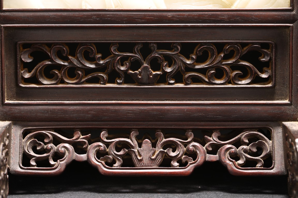 此插屏為長方形,下承木座,屏面以白玉製成,玉質潤而膩,緻密溫潤,色澤瑩亮,雙面均有雕工。器形周正巧妙,做工細膩精緻,插屏一面剔雕山水人物圖景,佈局嚴謹而有法度,工整莊重,一派皇家氣度。另一面則表現“松鶴延年紋”,刀工細膩,刻畫清晰,疏落有致,自然清新。正面刻山水人物畫面寧靜優美,岩石挺拔嶙峋,松樹枝幹彎曲遒勁,枝葉繁茂,蔚然成峰; 溪水淙淙,祥雲遊蕩,山巒起伏、古松參天、亭台樓閣、蝙蝠飛舞,不僅表現了山林洞府間的靜謐恬淡,而且展示了兩位長者立於松濤之下,山石面前,慈眉善目,鶴髮童顏。反面仙鶴徜徉於靈秀山水之中,整體畫面彷彿置身仙境,美輪美奐,使人陶醉,不僅雕工細膩豐富, 圖案優美、栩栩如生,更難能可貴的是讓人深感喜慶祥瑞的氣氛。該器線條靈動活潑,佈局得當,緊密有度,使畫面頗具立體感,層次分明,色彩豐富,造型規矩,端莊大方,穩重典雅,雕工嫻熟,山石人物的塑造均自然流暢,風貌古雅,取材獨特,造型奇巧玲瓏,展示出清代雕刻工藝的繁榮,實為不可多得的一件經典佳作。