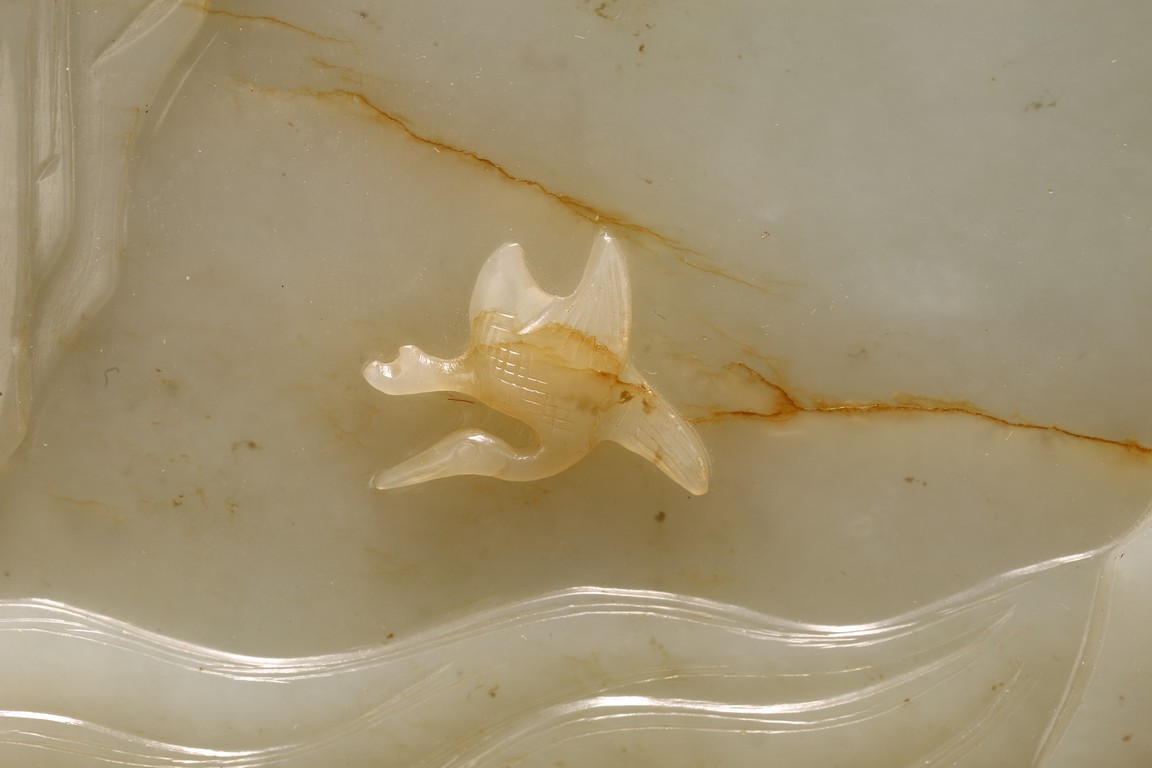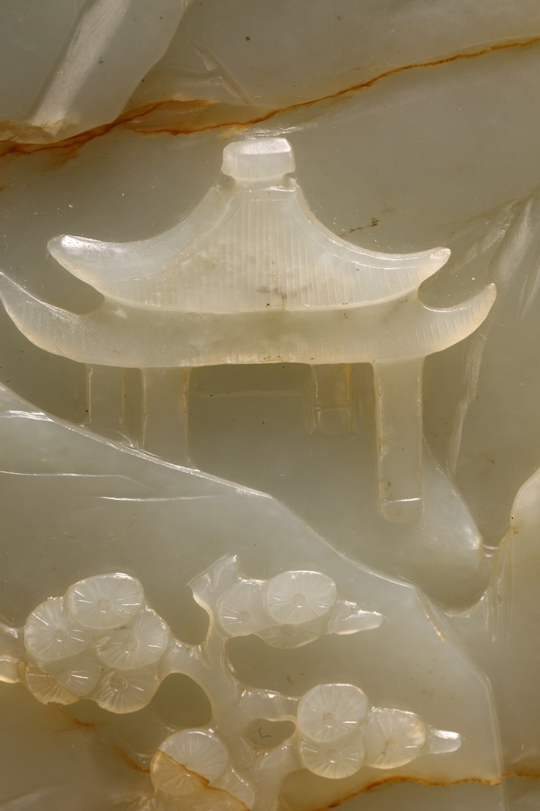 Qing Dynasty period. Of rectangular section, carved on one side with a dramatic mountainous landscape scene depicting two elderly scholars conversing standing upon cliff surrounded by craggy rockwork and pine trees below a pavillion, the reverse depicting two cranes within a mountain landscape above flowing river, all supported on hardwood stand, the stone is of smooth translucent white tone with minor russet veins