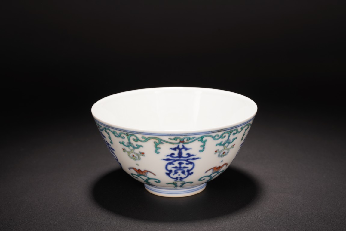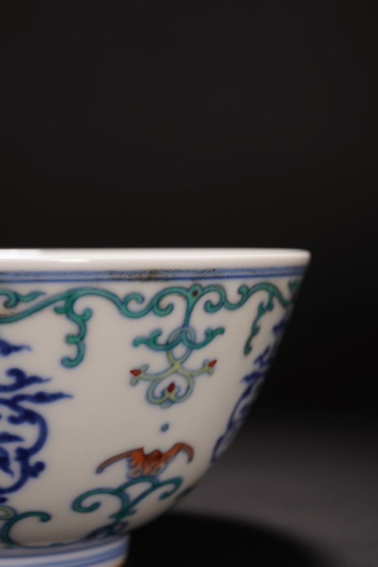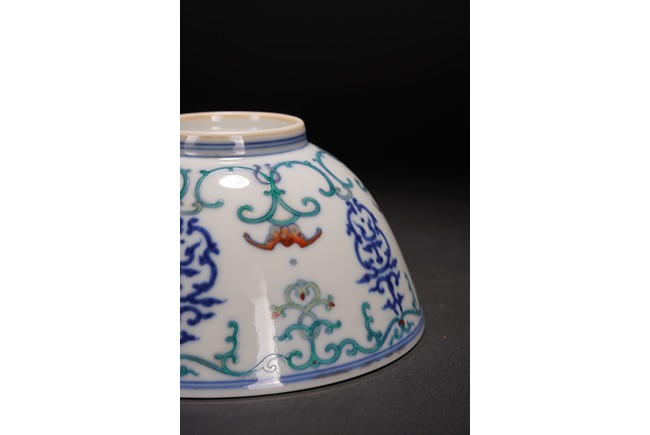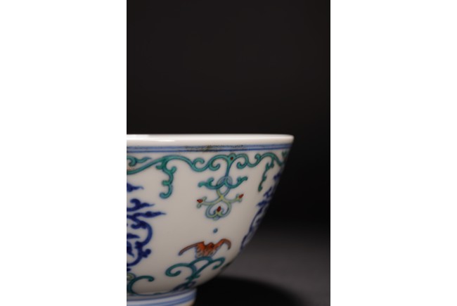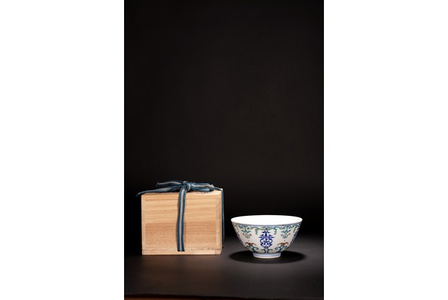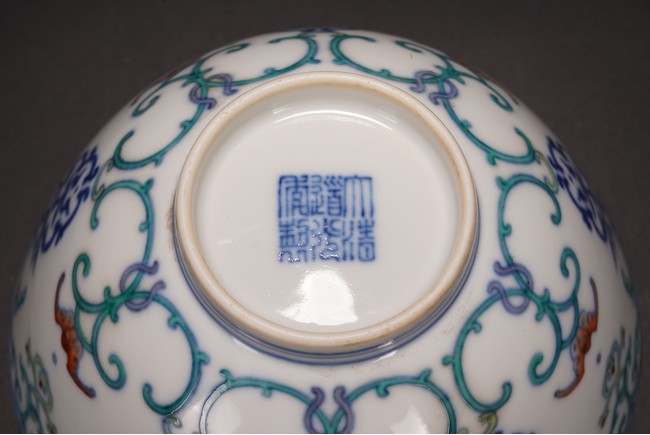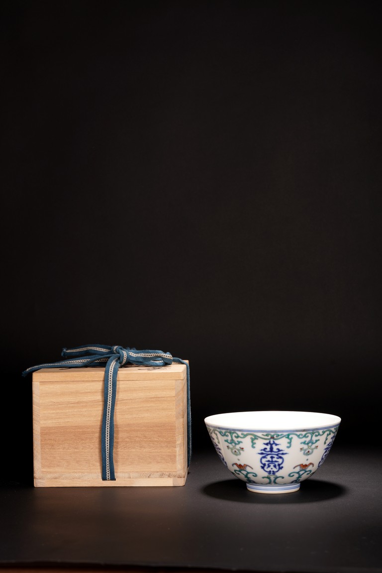 此碗造氣韻柔美,其型端莊,其釉溫潤,其彩絢麗,且保存狀況極佳。侈口,弧形淺壁,矮圈足。碗外壁以青花勾勒“壽字紋”,以綠彩填描枝蔓繪“纏枝紋”,以紅褐彩繪“蝙蝠紋”。紋飾寓意美好,其佈局清新疏朗,填色精準,青花明亮靜恬,紅褐彩純正勻淨,綠彩嬌嫩青翠。整器輕盈優美,修胎極為規整考究,胎釉渾然一體,麗質非凡。 “大清道光年制”款識。 (配木盒)