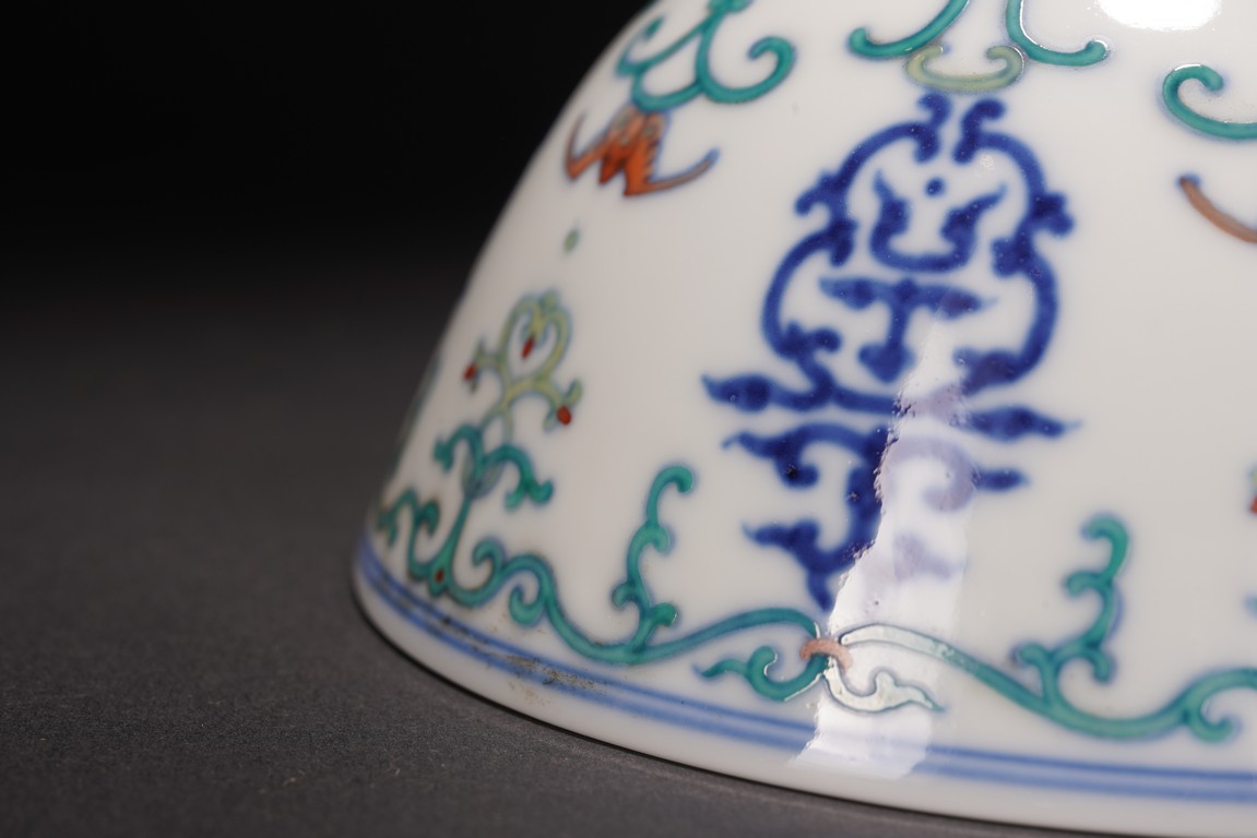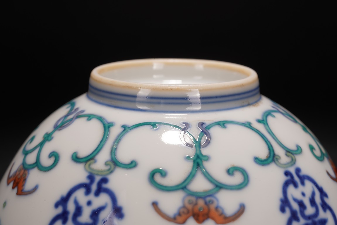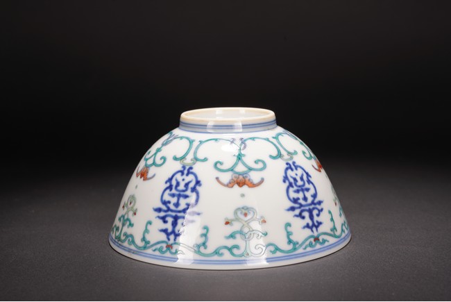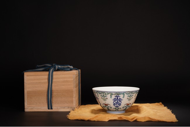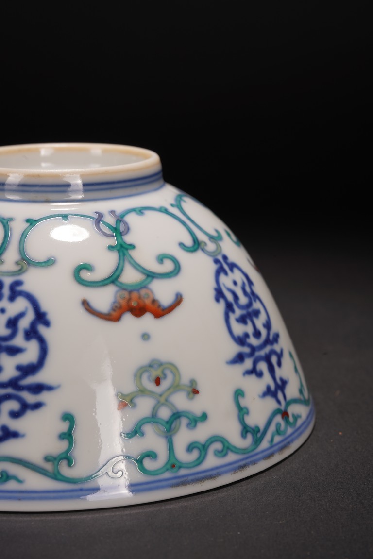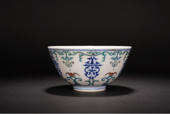 此碗造氣韻柔美,其型端莊,其釉溫潤,其彩絢麗,且保存狀況極佳。侈口,弧形淺壁,矮圈足。碗外壁以青花勾勒“壽字紋”,以綠彩填描枝蔓繪“纏枝紋”,以紅褐彩繪“蝙蝠紋”。紋飾寓意美好,其佈局清新疏朗,填色精準,青花明亮靜恬,紅褐彩純正勻淨,綠彩嬌嫩青翠。整器輕盈優美,修胎極為規整考究,胎釉渾然一體,麗質非凡。 “大清道光年制”款識。 (配木盒)
