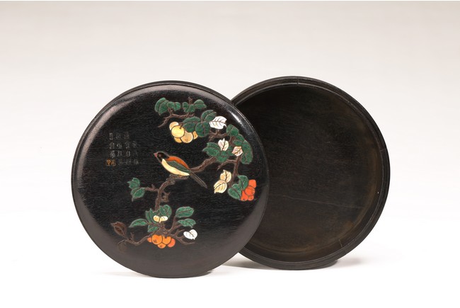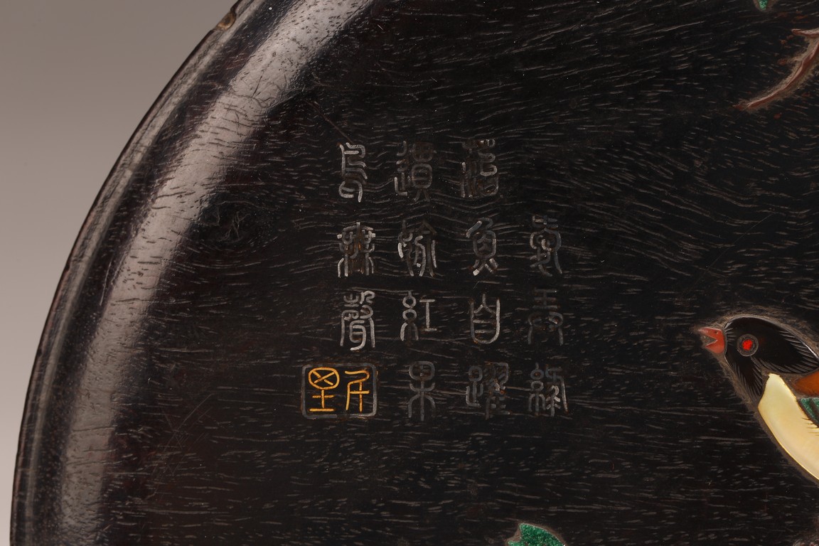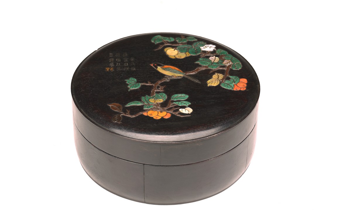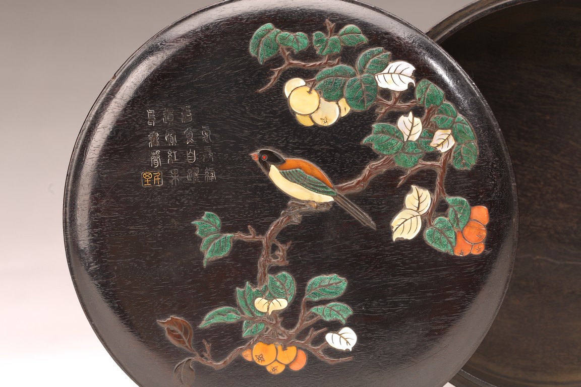 Early Qing Dynasty period. Of circular section, the box cover finely inlaid with various semi precious gems, including mother of pearl, agate, malachite, etc to depict a bird perching on a gnarled leafy branch with fruits, the top left inscribed with a poem in silver wire and a seal mark in gold wire. The wood is of warm dark tone with characteristic zitan streaks.