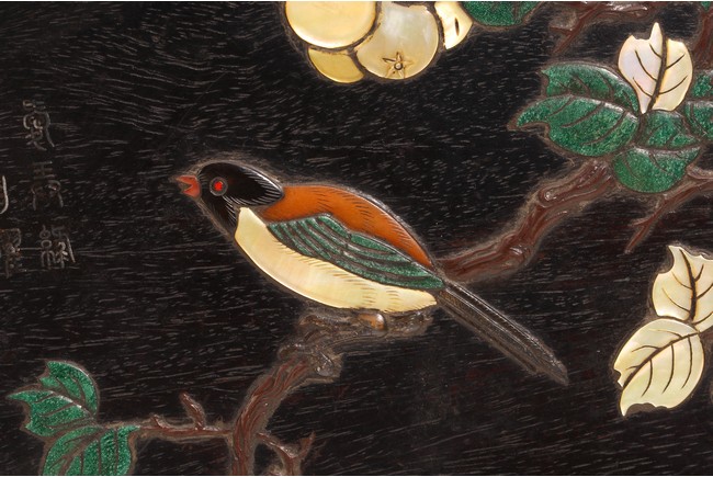 所謂百寶嵌,就是在同一件器物上有選擇性地鑲嵌多種經過加工的珍貴材料,從而達到突出構圖主題和強化裝飾效果的目的。在螺鈿鑲嵌工藝的基礎上產生的百寶嵌技法,又名“週制”,採用珍珠、寶石、象牙、玉石等各種珍貴材料作漆器鑲嵌成圖畫。此盒為圓形,紫檀木質優良,牛毛紋清晰,打磨光潔,玲瓏可愛,用各種材料繪“花鳥紋”,嵌銀絲書寫詩文。整體用材考究,圖案設計端莊典雅,佈局疏密相間,頗為難得。 類似清代紫檀百寶嵌盒,可參考香港兩依藏博物館藏品 For a related zitan inlaid box, please refer to zitan collections in Liang Yi Museum, Hong Kong