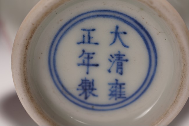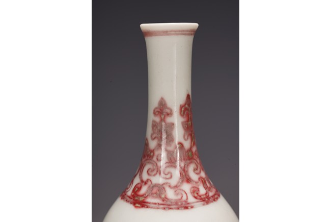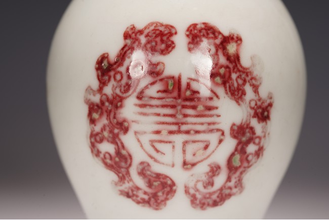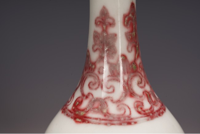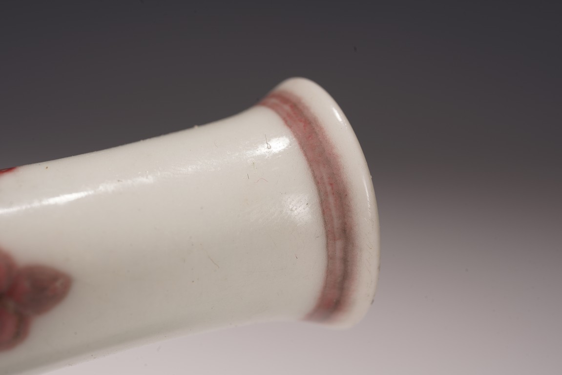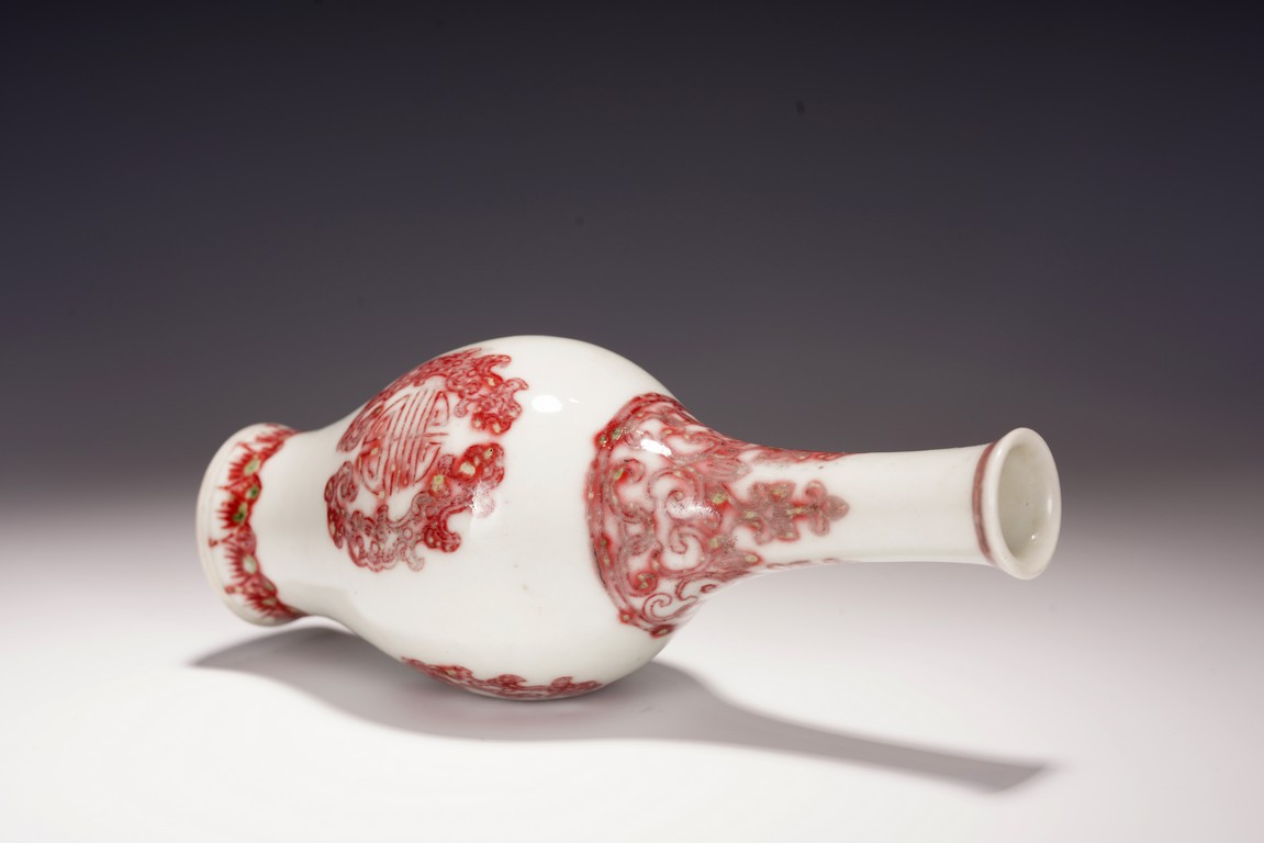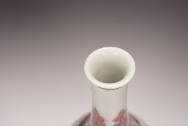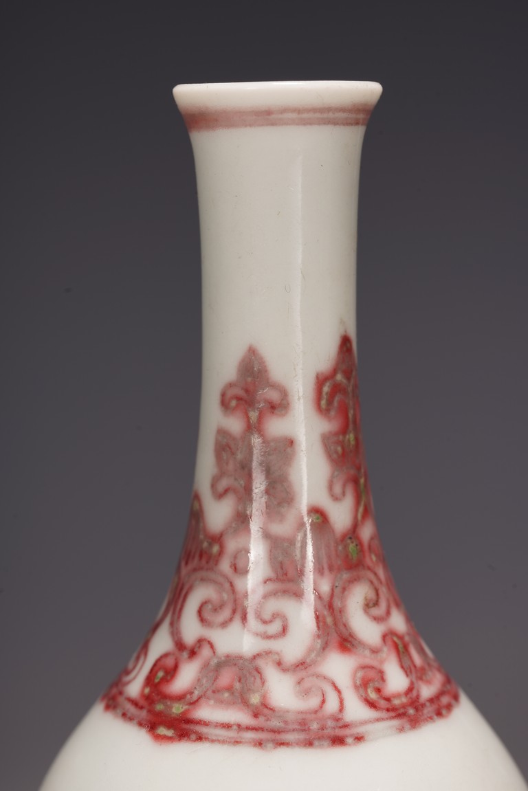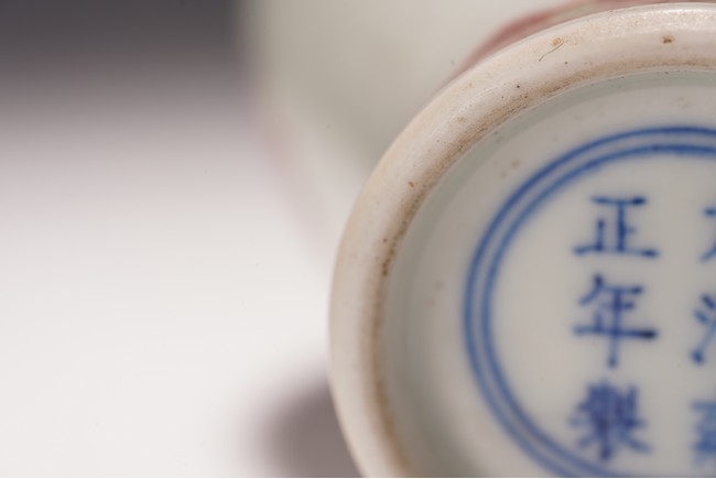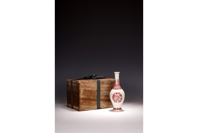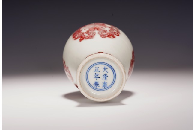 本品造型飽滿,小巧怡人,撇口,頸細纖長,鼓腹束脛,圈足外撇,釉面瑩潤凝厚,呈青灰色, 淳和靜雅,釉汁溫潤如玉,通體以釉裡紅勾勒圖案,頸部繪“卷草紋”,髮色妍麗無匹,紋飾層次豐富卻無繁密之感,安放有序。腹部繪“雙夔龍捧壽紋”,雙龍身姿矯健靈動,分置於“壽字紋”兩側對首相望,紋飾清晰疏朗,佈局虛實相宜,愈生清新之氣。底部繪”蓮瓣紋“,“大清雍正年制”款識。本器造型小巧可愛,甚適於心,置於文房案頭盡收一份“留香貯放常不謝”之愜意。 (配木盒)