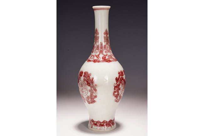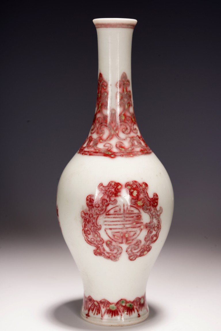 Qing Dynasty period. The vase rising from a slightly spreading foot to a bulbous body and columnar neck. The body decorated in underglaze red with pair of kui dragon flanking an auspicious shou motif, the neck painted with a band of upright leaf pattern, with a band of lotus pattern above the foot, the underside inscribed with six character Yongzheng mark.